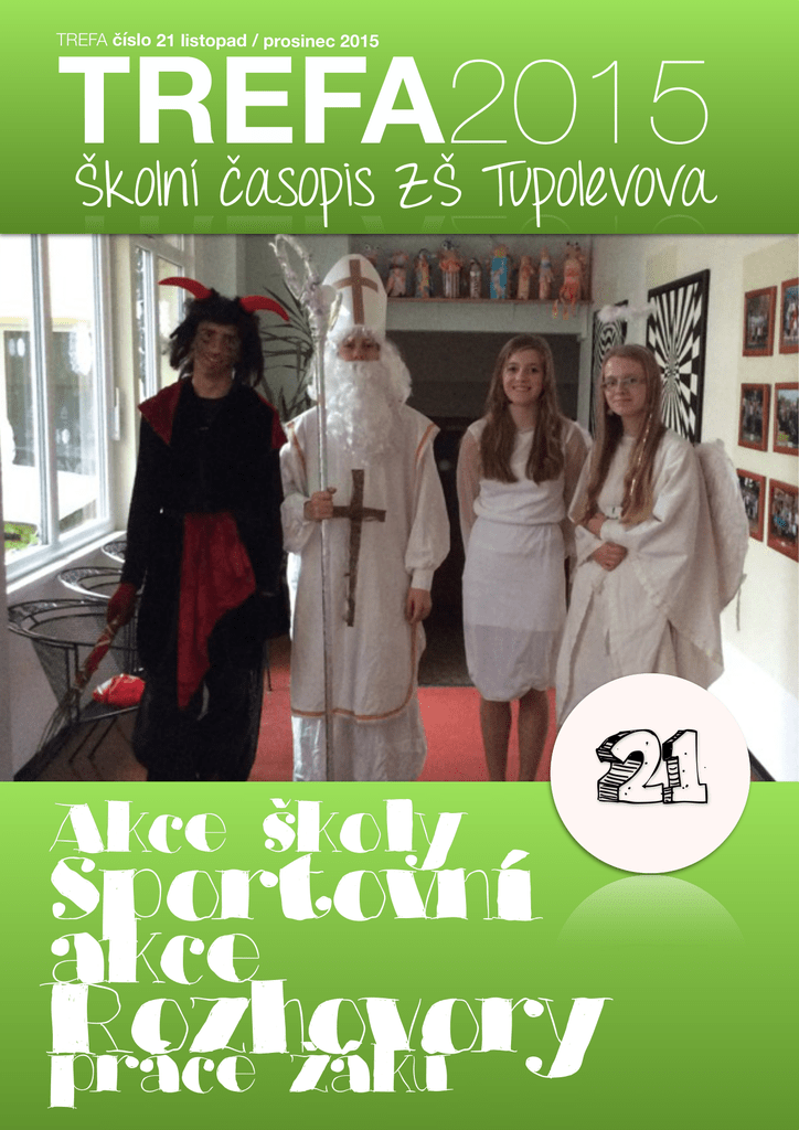TREFA2015 TREFA číslo 21 listopad / prosinec 2015 Školní časopis ZŠ Tupolevova Akce školy Sportovní akce 21 Rozhovory práce žáků TREFA číslo 21/2015 Zdravím Z Zdravím všechny přátele školy Opět je tu konec roku a s ním i dlouho očekávané Vánoce. Pro vás děti je to čas pohádek, cukroví, lenošení a především dárků. Díval jsem se na program televize a budete se mít opět na co těšit: Popelka, S čerty nejsou žerty a můžete vidět i zlobivou princeznu v podání naší bývalé žákyně Terezy Voříškové. Já osobně doporučuji věnovat pozornost Dobrému vojáku Švejkovi nebo pohádce s Janem Werichem Byl jednou jeden král (patří mezi mé oblíbené). O cukroví není třeba povídat, jistě ho bude dost, vždyť mnoho z vás (děvčata) díky naší kuchyňce ve škole, už trénuje dobrý měsíc všechny možné druhy cukroví s paními učitelkami. Po škole to náramně voní už od první adventní neděle, měl jsem možnost ochutnat hned několik druhů a všechny byly výborné. Lenošení, to má rád každý, to je jasné. Nezapomeňte však, že si rádi zalenoší (odpočinou) i vaši rodiče, a tak jim to umožněte třeba tím, že budete o Vánocích hodní a po namáhavém shonu a shánění všeho možného jim dáte chvilku na regeneraci. Za všechny dospělé předem děkuji (a to i svým dětem). Pro vás děti to znamená pohodu, legraci a dárky, pro nás dospělé spoustu starostí - koupit kapra (když ho nemáte v mrazáku od léta, co jste si ho sami chytili), sehnat stromeček (když není umělý ve skříni), napéct, uklidit, nazdobit, uvařit, zavolat Ježíškovi a domluvit s nim všechny dárky. Na druhou stranu nic není pro nás rodiče hezčí, než vaše radost u stromečku. A proto si navzájem dělejme radost. Přeji vám všem klid a mír Váš pan ředitel TREFA číslo 21/2015 Kurz první pomoci Tento rok jsou na naší škole kurzy první pomoci. Náš kurz trval 2 hodiny, ale myslím si, že by to mohlo být klidně delší. První hodinu dělala půlka třídy figuranty a druhá půlka je ošetřovala. Měli jsme zjistit, co jim je, a správně je ošetřit. Také jsme se učili, jak správně zavolat záchranku. Druhou hodinu jsme zkoušeli masáž srdce na Andulách. To bylo dost náročné, abych pravdu řekla. A nakonec pro nás lektoři připravili soutěž, kdo nejlépe provede masáž srdce. Kdo zvítězil, dostal balíček bonbonů. Líbilo se to celé naší třídě. Byli bychom rádi, kdyby přišli příští rok znovu. T. Havlík, V. Šimková, 7.B TREFA číslo 21/2015 Dravci Přednáška o dravcích Dne 12. 11. 2015 o druhé vyučovací hodině jsme šli do tělocvičny, kde už posedávali na lavičkách spolužáci ze sedmých a osmých tříd. Po příchodu do tělocvičny na nás začal orel vydávat divné zvuky. Prosadili jsme se a přednáška začala. Orel vydávající ony divné zvuky, se jmenovala Mařenka, větší sova byla Mia a malý agresivní dravec byl Rocky. V závěru přednášky si žáci, kteří odpověděli správně na několik otázek, mohli přivolat sovu na ruku s Pán nám povídal spousty zajímavých rukavicí - kvůli bezpečnosti. Učitelé věci, ale orel stále vydával ty divné si mohli přivolat orla MAŘENKU, zvuky. Po chvilce se k němu přidala i který létal velice nízko při zemi a jedna z větších sov. Pán nám dále bylo cítit, jak jeho křídla víří vzduch. představil 5-ti letého Bylo to super a doufám, že podobná nejagresivnějšího a zároveň akce proběhne i v příštím školním nejmenšího dravce na světě. Potom roce. nám ukázal vycpané mladě orla, Anna Bogdanová, 6.B vajíčka různých druhů ptáků, ale největší úspěch sklidilo pštrosí vejce vážící kolem 1 kg. TREFA číslo 21/2015 Adventní koncert Tupolevky 2015 Až zazvoní zvoneček, máme natrénováno a můžeme začít zpívat… V ZŠ Tupolevova se již čtvrtým rokem pořádají adventní koncerty pro rodiče i širší veřejnost. Koncerty byly především určeny pro prezentaci výsledků práce třídních kolektivů a školních kroužků – kytarového, flétnového a pěveckého sboru. 15. prosince se sešly třídy 1.B, 5.A, 5.B, 6.B a výběr z 8.A a B, flétnisté i sbor, kytaristé se prý odváží až na závěr roku. Vystoupili i sólisté, tradičně včetně bývalých žáků školy. Letos jsme v rámci koncertu cestovali od chladných Himalájí (v zahajovací písni sboru) až do prosluněného Španělska, neboť se na škole již dva roky vyučuje španělština, takže se osmáci odvážili zazpívat španělskou koledu. Pro někoho to bylo první veřejné vystoupení, pro jiné možná poslední, každopádně se s tím všichni poprali se ctí. Nezbývá než všem poděkovat za pěkný podvečer a stejně jako v závěrečné písni (We wish you a merry Christmas) popřát radostné svátky a šťastný nový rok 2016. HelP TREFA číslo 21/2015 Akce Boldering Konečně nastala chvíle, kdy se 2. stupeň zúčastnil akce Bouldering (což je lezení na umělé stěně). jsme měli zdolat (bylo jich deset), a počet dosažených bodů. Odstartovalo se. Nejdříve zavládla panika, ale po Přišli jsme do areálu a po převléknutí chvíli začal neúprosný boj. Od půlky jsme si půjčili speciální obuv, která je už byli všichni unavení, ale touha vyhrát byla silnější, a tak jsme nezbytná pro lezení. Boty měly trochu tlačit, abychom se postavili na všichni šplhali, co to šlo. špičky. A protože jsme přišli brzy, tak Za sportovní úsilí jsme byli jsme si mohli vyzkoušet lezecké odměněni odznáčky, samolepkami a překážky před začátkem závodu. dalšími vstupy zdarma. Jakmile přišla další škola, tak jsme Bylo to super. věděli, že za chvíli to vypukne. Martin Svitáček, 8.A Všichni jsme dostali kartičku, na tu jsme napsali počet překážek, které Kaligram