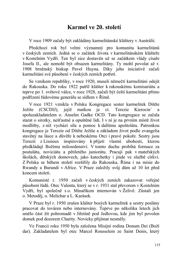 Karmel ve 20. století V roce 1909 začaly být zakládány karmelitánské kláštery v Austrálii. Předchozí rok byl velmi významný pro komunitu karmelitánů v českých zemích. Jedná se o začátek života v karmelitánském klášteře v Kostelním Vydří. Ten byl sice dostavěn už se začátkem vlády císaře Josefa II., ale nemohl být obsazen karmelitány. Ty mohl povolat až r. 1908 brněnský biskup Pavel Huyna. Díky jeho iniciativě začali karmelitáni své působení v českých zemích potřetí. Se vznikem republiky, v roce 1920, museli němečtí karmelitáni odejít do Rakouska. Do roku 1922 patřil klášter k rakouskému komisariátu a teprve po 1. světové válce, v roce 1928, začali být čeští karmelitáni přímo podřízení řádovému generálu se sídlem v Římě. V roce 1921 vznikla v Polsku Kongregace sester karmelitek Dítěte Ježíše (CSCDIJ), jejíž matkou je ct. Terezie Kierocin´ a spoluzakladatelem o. Anselm Gadke OCD. Tato kongregace se začala starat o sirotky, nešťastné a opuštěné lidi. I v ní je na prvním místě život modlitby, z níž vychází síla a pomoc k dalšímu apoštolátu. Patronkou kongregace je Terezie od Dítěte Ježíše a základem život podle evangelia stavěný na lásce a důvěře k nebeskému Otci i pravé pokoře. Sestry jsou Terezií z Lissieux inspirovány k přijetí vlastní ubohosti, kterou předkládají Božímu milosrdenství. V tomto duchu probíhá formace za postulátu, noviciátu a pětiletého juniorátu. Pracují pak v mateřských školách, dětských domovech, jako katechetky i jinde ve službě církvi. Z Polska se během století rozšířily do Rakouska, Říma i na misie do Rwandy a Burundi v Africe. V Praze založily svůj dům až 10 let před koncem století. Komunisté r. 1950 začali v českých zemích zakazovat veřejné působení řádů. Otec Valenta, který se v r. 1931 stal převorem v Kostelním Vydří, byl společně s o. Minaříkem internován v Želivě. Zůstali jen o. Metoděj, o. Melichar a L. Karásek. V Praze byl r. 1950 zrušen klášter bosých karmelitek a sestry poslány pracovat do továren nebo internovány. Teprve po několika letech jich smělo část žít pohromadě v Jiřetíně pod Jedlovou, kde jim byl povolen domek pod dozorem Charity. Novicky přijímat nesměly. Ve Francii roku 1950 byla založena Misijní rodina Donum Dei (Boží dar). Zakladatelem byl otec Marcel Rousselem ze Saint Denis, který 115 vnímal bolestnou situaci dělníků odkloněných od křesťanské víry i úděl prostitutek a rozhodl se něco udělat pro evangelizaci těchto skupin. První skupinu se snažil oslovit pomocí apoštolských pracovníků, kteří mezi dělníky žili na jejich úrovni. Dále vytvořil společenství mladých dívek žijících ve světě, které nazval „Misionářky práce Neposkvrněné Panny.“ Za vzor jim dal Neposkvrněnou P. Marii, dále Janu z Arku i Terezii z Lissieux, k níž se měly utíkat o duchovní rady a pomoc. Tyto mladé ženy žily celibátním životem z lásky k Ježíši, bez kláštera, a pracovaly v restauracích, v továrnách, ve zdravotnictví i školství. Některé byly v r. 1958 poslány do Afriky, Asie a Latinské Ameriky. Z rozhodnutí zakladatele začaly pracovat společně jako „Eau Vive“ (Živá voda). Samy vedly restaurace, což jim umožňovalo lepší apoštolské působení i hlubší duchovní život ve spojení s Ježíšem. Jejich hlavním posláním bylo vydávat svědectví a působit podle místních podmínek. Přitom se neodpoutávaly od kontemplativního života. Do této misijní rodiny, v roce 1981, o. Marcel Roussel přizval i osoby žijící v manželství, vytvořením bratrstva Živá voda. Roku 1984 se rozhodl připojit celou rodinu ke třetímu řádu karmelitánů, k čemuž došlo až po jeho smrti 22.2. 1987. Od roku 1993 začaly tři misionářky Donum Dei působit i ve Frýdlantu nad Ostravicí. Sametovou revolucí v roce 1989 byla získána i svoboda pro působení Karmelu v Československu. Byl obnoven jeho normální život s řádným jmenováním představených a s kontakty na generalitu řádu. Jako jediný ze starších bratří kláštera v Kostelním Vydří se této svobody dožil o. Metoděj Minařík, ale kolem něj bylo již 15 nových karmelitánů. Postupně došlo k velkým opravám kostela i kláštera, s přístavbou nové budovy sv. Josefa, posvěcené 14.11. 1993. V roce 1991 se v Kostelním Vydří začala rozbíhat formace třetího řádu. V témže roce na tomto místě začalo svoji činnost i karmelitánské vydavatelství a nakladatelství. Bosé karmelitky v roce 1992 získaly zpět svůj klášter v Praze na Hradčanském náměstí a mohly se nastěhovat do budovy, v níž je nadále uchováváno zachovalé tělo ct. Matky Elekty. S růstem počtu sester došlo v roce 1998 k založení jejich druhého kláštera v Dačicích, kde dostaly objekt františkánského kláštera ze 17. století. Na Slovensku byl 14.12. 1994 Mons. Dominikem Tóthem slavnostně uveden v život Světský řád bosých karmelitánů (OCDS). V českých zemích je kromě bosých karmelitánů v Praze, druhá komunita ve Slaném, v opravovaném klášteře Nejsvětější Trojice, do kterého se bratři nastěhovali v roce 1996. 116 blah. Alžběta /od Nejsvětější Trojice/ Catez (Elisabeth a Sanctissima Trinitate Catez ) 8.11. (nezávazná památka v řádu O.Carm. i OCD, martyrologiem připomínána 9.11.) Postavení: panna, řeholnice OCD Úmrtí: 1906 Pochází z Francie. Od dětství bojovala s vrozenou vznětlivostí a se sklonem k panovačnosti. Zaměřovala se pak na plnění vůle druhých a Boží. Vynikala životem modlitby a stále se prohlubující láskou k Bohu, i úsilím, aby ho skrze ni poznávali jiní. V 21 letech vstoupila k bosým karmelitkám v Dijonu. Prožila tam šest let růstu v lásce i velké bolesti, které vyvrcholily ve „chválu sl