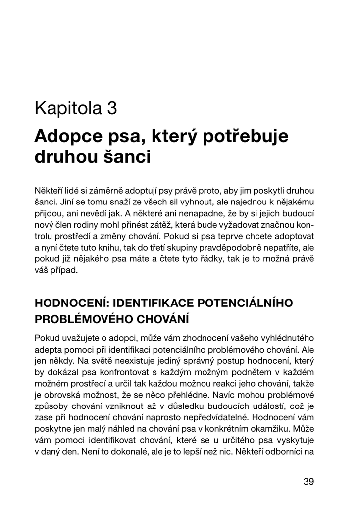 Kapitola 3 Adopce psa, který potřebuje druhou šanci Někteří lidé si záměrně adoptují psy právě proto, aby jim poskytli druhou šanci. Jiní se tomu snaží ze všech sil vyhnout, ale najednou k nějakému přijdou, ani nevědí jak. A některé ani nenapadne, že by si jejich budoucí nový člen rodiny mohl přinést zátěž, která bude vyžadovat značnou kontrolu prostředí a změny chování. Pokud si psa teprve chcete adoptovat a nyní čtete tuto knihu, tak do třetí skupiny pravděpodobně nepatříte, ale pokud již nějakého psa máte a čtete tyto řádky, tak je to možná právě váš případ. Hodnocení: identifikace potenciálního problémového chování Pokud uvažujete o adopci, může vám zhodnocení vašeho vyhlédnutého adepta pomoci při identifikaci potenciálního problémového chování. Ale jen někdy. Na světě neexistuje jediný správný postup hodnocení, který by dokázal psa konfrontovat s každým možným podnětem v každém možném prostředí a určil tak každou možnou reakci jeho chování, takže je obrovská možnost, že se něco přehlédne. Navíc mohou problémové způsoby chování vzniknout až v důsledku budoucích událostí, což je zase při hodnocení chování naprosto nepředvídatelné. Hodnocení vám poskytne jen malý náhled na chování psa v konkrétním okamžiku. Může vám pomoci identifikovat chování, které se u určitého psa vyskytuje v daný den. Není to dokonalé, ale je to lepší než nic. Někteří odborníci na 39 restartujte svého psa chování psů a péči o ně používají termín „test temperamentu“. Já dávám přednost výrazu „hodnocení chování“, a to z těchto důvodů: • • Ve skutečnosti nás víc zajímají reakce psa na vnitřní a vnější podněty (chování) než jeho povaha (temperament). I když jsou jeho přirozené dispozice důležité, tak v tomto procesu sledujeme a analyzujeme jeho chování a z toho pak vyvozujeme závěry. Výraz „test“ naznačuje dva možné výsledky – obstál a neobstál. I když rozhodně existují věci, které pes může při procesu hodnocení udělat a v důsledku toho „neobstát“, tak bychom se při tomto testu měli soustředit spíše na shromažďování informací než na „známkování“. Samozřejmě, že se může stát, že pes „neobstojí“, pokud udělá něco zcela nepřijatelného, například kousne nebo se pokusí kousnout hodnotitele (nebo falešnou ruku), ale to není to, oč nám jde především. V některých případech, jako u našeho Scootera, může být i pes, který kouše, vhodným kandidátem na rehabilitaci v programu nápravy chování v útulku, záchranné organizaci nebo erudované domácnosti. Mnoho útulků a záchranných organizací uskutečňuje své vlastní procedury hodnocení, a to před přijetím, nebo po přijetí psa. Vždy se zeptejte, zda bylo u psa, o jehož adopci uvažujete, provedeno hodnocení chování. Organizace, která vám adopci zprostředkuje, by měla projevit vstřícnost a podělit se s vámi o výsledky tohoto hodnocení. K běžně používaným postupům patří programy Sue Sternbergové „Assess-A-Pet“ a dr. Emily Weissové „Safer/Meet Your Match“. Sue Sternbergová, která provozuje svůj vlastní neziskový útulek, Rondout Valley Animals for Adoption v New Yorku, je průkopnicí v oblasti hodnocení psů z útulku. Dr. Emily Weissová působí jako ředitelka ASPCA v oboru výzkumu a vývoje útulků. K dalším významným osobnostem v tomto oboru patří dr. Amy Marderová, v současné době ředitelka Animal Behavior and Training Services při Animal Rescue League of Boston, Sarah Kalnajsová, CDBC, CPDT, Blue Dog Training and Behavior, a Kelley Bollenová, která působí na fakultě Cornellovy univerzity a dříve pracovala na oddělení výzkumu chování v Massachusetts SPCA. Dr. Marderová, dr. Weissová a Kelley Bollenová prováděly v MSPCA studie a/nebo průzkumy s cílem potvrdit platnost svých postupů pro hodnocení. 40 Adopce psa, který potřebuje druhou šanci Užitečné také je udělat si své vlastní standardizované hodnocení chování, které můžete použít, až se setkáte se svým potenciálním novým psím členem rodiny. Pokud nemáte důvěru ve svou vlastní schopnost analyzovat chování, které vidíte, vezměte si s sebou někoho, kdo se ve psech vyzná, nebo dobrého pozitivního odborníka na chování psů. Mnoho cvičitelů lamentuje nad tím, že lidé nevyužívají předadopční služby, které nabízejí. Útulek nebo záchranná organizace by neměly nic namítat, pokud budete chtít provést své vlastní hodnocení, i když u toho pravděpodobně budou chtít být a případně vás zarazí, pokud budou mít dojem, že děláte něco, co by mohlo psa ohrozit. To platí i pro případ, že si psa pořizujete od soukromého majitele. Ať je za psa odpovědný kdokoli, proberte s ním svůj postup hodnocení, aby věděl, co má očekávat. Co potřebujete k hodnocení 1. Druhého člověka, který vám pomůže zaznamenávat veškerá zjištění a zajišťovat vaši bezpečnost. 2. Masivní vodítko a polostahovací obojek (martingale) nebo obojkové vodítko. 3. Výcvikové pamlsky vysoké hodnoty (viz příloha 1). 4. Míček, měkkou pískací hračku a přetahovací hračku. 5. Misku s granulemi promíchanými s krmivem z konzervy. 6. Klobouk a sluneční brýle, pláštěnku nebo jiné neobvyklé oblečení. 7. Falešnou ruku nebo metr dlouhou pomůcku, abyste mohli se psem bezpečně pracovat, až budete hodnotit jeho případné majetnické chování. Zde jsou kroky hodnocení, které můžete použít pro posouzení některých způsobů chování u vašeho potenciálního psího kandidáta na adopci. Obecně se řídí postupem Kelley Bollenové, ale není přesně stejný. Pozor! Pokud kdykoli během procesu budete mít dojem, že by vás pes mohl kousnout neb