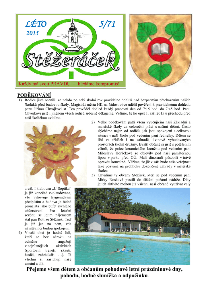 LÉTO 5/71 2015 Každý má svoji PRAVDU – hledáme kompromis! PODĚKOVÁNÍ 1) Rodiče jistě ocenili, že někdo po celý školní rok pravidelně dohlíží nad bezpečným přecházením našich školáků před budovou školy. Magistrát města HK na žádost obce udělil pověření k pravidelnému dohledu panu Jiřímu Chvojkovi st. Ten prováděl dohled každý pracovní den od 7:15 hod. do 7:45 hod. Panu Chvojkovi jistě i jménem všech rodičů srdečně děkujeme. Věříme, že ho opět 1. září 2015 u přechodu před naší školičkou uvidíme. 2) Velké poděkování patří všem vyučujícím naší Základní a mateřské školy za celoroční práci s našimi dětmi. Často slýcháme nejen od rodičů, jak jsou spokojeni s celkovou situací v naší škole pod vedením paní ředitelky. Dětem se líbí ve třídách i na zahradě, i v nově vybudovaných prostorách školní družiny. Bystří občané si jistě s potěšením všimli, že práce keramického kroužku pod vedením paní Miloslavy Horáčkové se objevily pod naší památečnou lípou v parku před OÚ. Malí dinosauři působili v trávě opravdu kouzelně. Věříme, že již v září bude naše veřejnost také pozvána na prohlídku dokončené zahrady v mateřské školce. 3) Chválíme ty občany Stěžírek, kteří se pod vedením paní Mirky Noskové pustili do čištění požární nádrže. Díky jejich aktivitě mohou již všichni naši občané využívat celý areál. I klubovna „U Soptíka“ je již konečně zkolaudována, vše vyhovuje hygienickým předpisům a budova je řádně pronajata jako bufet rychlého občerstvení. Pro letošní sezónu se jejím nájemcem stal pan Rott ze Stěžírek. Teď je již jen na něm, zda návštěvníci budou spokojeni. 4) V naší obci je hodně lidí, kteří se bez nároku na odměnu angažují v nejrůznějších aktivitách (sportovní trenéři, skauti, hasiči, zahrádkáři …). Ti všichni si zasluhují naše uznání a dík. Přejeme všem dětem a občanům pohodové letní prázdninové dny, pohodu, hodně sluníčka a odpočinku. INFORMACE Z OBECNÍHO ÚŘADU 1)Někteří z Vás se jistě těšili na nový spoj autobusu č. 16 v dopoledních hodinách v období letních prázdnin. Toto rozšíření jízdního řádu schválili zastupitelé již 23. 3. 2015 (současná proluka mezi osmou a desátou hodinou občanům nevyhovuje). Po schválení jsme ihned požádali Dopravní podnik města Hradce Králové o zapracování našeho požadavku do jízdního řádu. Na náš dotaz, proč spoj o těchto prázdninách již nejezdí, nám bylo sděleno, že aktualizace všech jízdních řádů proběhne až k 29. 8. 2015, což znamená, že změnu pocítíme až o prázdninách v roce 2016 . 2) Letos opět bude v době od 1. července 2015 po dobu letních prázdnin až do 31. srpna 2015 zkrácena otevírací doba stěžerské knihovny takto: pondělí 14 – 18 hodin, středa 14 – 18 hodin, pátek 14 – 16 hodin. 3)Na letní sezónu jsme přijali k našemu stávajícímu údržbáři panu Pavlu Tomáškovi ještě pana Vohralíka ze Stěžírek a pana Lenomára z Hřibska. Na jejich mzdu jsme částečně získali dotaci administrovanou Úřadem práce z Evropského sociálního fondu a ze státního rozpočtu České republiky. Tito pracovníci se starají o údržbu obce, zalévání nových výsadeb, včetně drobných oprav. Práce je v obci stále dost. 4)Během dubna 2015 navážela firma Metrostav skrývku ze stavby dálnice D11 na pozemky mezi Stěžerami a Hřibskem. Těžká auta na mnoha místech neúměrným zatížením poškodila místní komunikaci ve správě obce. Na mnoha místech je zborcená krajnice a vzniklo mnoho výtluků. Na naši okamžitou reakci a žádost o nápravu bylo dohodnuto, že ze strany zhotovitelské firmy (Eurovia) dojde k opravě úseku o délce cca 500 m. Přistoupili jsme na dohodu, že oprava bude provedena až po sklizni řepy a po částečném odvozu deponované zeminy místním Agrosemem. Takže oprava se pravděpodobně uskuteční na podzim, nejdéle na jaře 2016. Zastupitelé uvažují i o možnosti, že využijí stávající situace a přiobjednají opravu v delším úseku z rozpočtu obce. Za tím účelem jsme již požádali o cenovou nabídku takové opravy. VE SNAZE ještě více napomoci těm, kteří svědomitě uklízejí exkrementy po svých psech, rozmístili naši údržbáři na mnoho míst hnědé boxy s igelitovými pytlíky. Ty jsou umístěny na těchto místech: na mostku u Agrosemu u památníku Fr. Řehoře u sochy Sv. Marka za klubovnou směrem k ZOO na zábradlí před hřbitovem u koše s lavičkou v Lipové ulici (směr Praha) v Markově ulici u Kopeckých v Hřibsku v blízkosti sochy Sv. Václava ve Stěžírkách na cyklostezce ve Stěžírkách na vjezdu do lokality U lesa (na křižovatce v kopci) Každý, kdo venčí svého psa, má možnost si během procházky pytlík utrhnout a hodit jej plný do nejbližšího koše. Košů je po obci dostatek, pakliže má někdo dojem, že by bylo nutné umístit další, nechť svůj nápad sdělí na OÚ. Totéž platí při zjištění, že někde již došly psí sáčky. Prosíme o součinnost všechny naše občany. Upozornit možno osobně na OÚ, e-mailem [email protected] nebo telefonicky 733 189 185. Snad se přece jen společně podaří vyčistit naši veřejnou zeleň tak, aby na ni mohly vstoupit i naše děti! TISKOVÁ ZPRÁVA V květnu 2015 proběhla v České televizi reportáž, dle které bylo mylně upozorňováno, že ve Stěžerách, (ale i v jiných městech a obcích) probíhá zasedání zastupitelstva bez účasti veřejnosti. Proti této reportáži se důrazně ohrazujeme, neboť veškerá zasedání zastupitelstva, kde se hlasuje a vznikají při nich usnesení, jsou vždy veřejná. Mimo plánované zasedání zastupitelstva obce se zastupitelé scházejí i k pracovním j