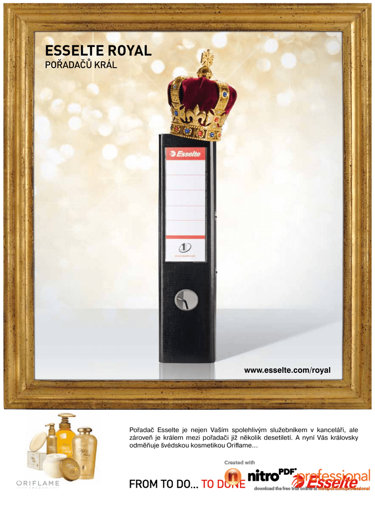 Esselte Royal POŘADAČŮ KRÁL www.esselte.com/royal Pořadač Esselte je nejen Vaším spolehlivým služebníkem v kanceláři, ale zároveň je králem mezi pořadači již několik desetiletí. A nyní Vás královsky odměňuje švédskou kosmetikou Oriflame... Ess lt Royal ✄ 1) Zaregistrujte se na www.esselte.com/royal a stáhněte si soutěžní arch. 2) Nalepte na něj 35 vystřižených královských korunek a zašlete nám ho. Vybranou odměnu Vám brzy doručíme. outěžní páko é pořadač Ess lt VŽ ERFE o. 1 WER: ! osm tický balíč k p o každého! Již za 35 ks pořadačů získáte kosmetický balíček Oriflame v hodnotě 1 000,- Kč. Výběr ze 4 druhů. outěžt o k álo skou ýh u! Kromě kosmetického balíčku můžete získat opravdu královskou výhru, se kterou se budete cítit jako člen královské rodiny! Na konci soutěže vylosujeme ze všech zaslaných platných soutěžních archů hlavního výherce, který získá kosmetiku Oriflame v hodnotě 20 000,- Kč (v běžných cenách). Podrobnosti o odměnách na: www.esselte.com/royal Soutěž trvá od 1. 9. 2011 do vyčerpání zásob, nejdéle však do 30. 11. 2011. Soutěžními výrobky jsou celoplastové pákové pořadače ESSELTE No. 1 POWER s šíří hřbetu 75 a 50 mm. Objednací kódy pořadačů naleznete v pravidlech soutěže. Maximální počet výher na 1 osobu je 10 balíčků. Úplná pravidla soutěže naleznete na www.esselte.com/royal. Vystř Sbírejte královské korunky v naší soutěži Esselte Royal a získejte ceny vskutku královské! Od 1. 9. 2011 do 30. 11. 2011 najdete v každém pořadači Esselte No.1 POWER jednu královskou korunku (viz. pravý horní roh). ihněte! dměna p o Vás již za 35 pořadačů!