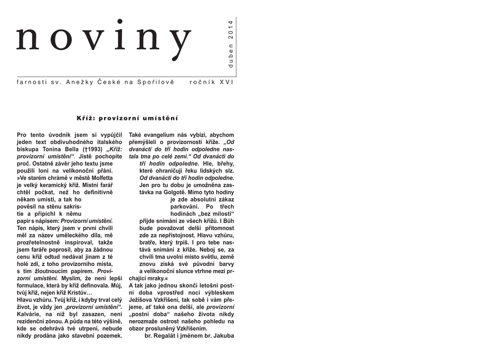 farnosti sv. Anežky České na Spořilově duben 2014 noviny ročník XVI Kříž: provizorní umístění Pro tento úvodník jsem si vypůjčil jeden text obdivuhodného italského biskupa Tonina Bella (†1993) „Kříž: provizorní umístění“. Jistě pochopíte proč. Ostatně závěr jeho textu jsme použili loni na velikonoční přání. »Ve starém chrámě v městě Molfetta je velký keramický kříž. Místní farář chtěl počkat, než ho definitivně někam umístí, a tak ho pověsil na stěnu sakristie a připíchl k němu papír s nápisem: Provizorní umístění. Ten nápis, který jsem v první chvíli měl za název uměleckého díla, mě prozřetelnostně inspiroval, takže jsem faráře poprosil, aby za žádnou cenu kříž odtud nedával jinam z té holé zdi, z toho provizorního místa, s tím žloutnoucím papírem. Provizorní umístění. Myslím, že není lepší formulace, která by kříž definovala. Můj, tvůj kříž, nejen kříž Kristův… Hlavu vzhůru. Tvůj kříž, i kdyby trval celý život, je vždy jen „provizorní umístění“. Kalvárie, na níž byl zasazen, není rezidenční zónou. A půda na této výšině, kde se odehrává tvé utrpení, nebude nikdy prodána jako stavební pozemek. Také evangelium nás vybízí, abychom přemýšleli o provizornosti kříže. „Od dvanácti do tří hodin odpoledne nastala tma po celé zemi.“ Od dvanácti do tří hodin odpoledne. Hle, břehy, které ohraničují řeku lidských slz. Od dvanácti do tří hodin odpoledne. Jen pro tu dobu je umožněna zastávka na Golgotě. Mimo tyto hodiny je zde absolutní zákaz parkování. Po třech hodinách „bez milosti“ přijde snímání ze všech křížů. I Bůh bude považovat delší přítomnost zde za nepřístojnost. Hlavu vzhůru, bratře, který trpíš. I pro tebe nastává snímání z kříže. Neboj se, za chvíli tma uvolní místo světlu, země znovu získá své původní barvy a velikonoční slunce vtrhne mezi prchající mraky.« A tak jako jednou skončí letošní postní doba vprostřed noci výbleskem Ježíšova Vzkříšení, tak sobě i vám přejeme, ať také ona delší, ale provizorní „postní doba“ našeho života nikdy nerozmaže ostrost našeho pohledu na obzor prosluněný Vzkříšením. br. Regalát i jménem br. Jakuba 2. strana farní noviny duben 2014 V sobotu 8. března 2014 jsme se na Velehradě rozloučili jménem naší farnosti i jménem svým s nám drahou S. Kristou Boženou Turzovou (*29. 2. 1924, Havřice u Uh. Brodu ) z Kongregace sester sv. Cyrila a Metoděje. S. Václava Dudová, generální představená, děkuje všem z farnosti sv. Anežky za milou vzpomínku a posílá všem srdečný pozdrav. S. Krista zemřela dne 3. března ve věku 90 let. Spolu se svou rodnou i řeholní sestrou Virginií žily dlouhá léta v domku na Spořilově, v Jihozápadní III. a v naší farnosti v duchu svého poslání věnovaly své síly ekumenické, misijní, výchovné, pastorační, sociální a charitativní činnosti ve službách evangelia podle potřeb místa a doby. V kostele sedávaly vždy v poslední lavici před ambonem a každé setkání s nimi bylo pro nás potěšením a obohacením. Asi před osmi lety odešly na odpočinek na Velehrad, kde má jejich kongregace své kořeny. Jejich odchod byl pro nás opravdovou ztrátou a jejich místa v lavici zůstávala dlouho volná. Bylo milé slyšet od S. Václavy, že také sestry si uchovaly vzpomínky na spořilovskou farnost ve svém srdci a „spořilovské dny byly v jejich životě ty slunečné“. Starší ze sester, S. Virginie Marie Turzová (autorka monografie Kartouzský vězeň Mons. Jan Šrámek. Kněz a politik.) letos slaví 93 narozeniny. Jak jsme měli možnost zjistit, udržuje si stále svůj úsměv a svoji úžasnou vitalitu. Kladla nám na srdce, abychom žili s vírou, abychom si uvědomovali mocnou sílu myšlenky a naše práce a vše co děláme, bylo prospěšné nejen nám, ale zejména druhým. Marie a Pavel Myslilovi V den výročí úmrtí svaté Anežky České, v neděli 2. března, byl v kostele po mši svaté vystaven návrh sochy sv. Anežky, která by mohla stát na pandantu v průčelí nad vstupem do kostela. Model je dílem spořilovské sochařky Veroniky Durové a iniciativou Jana Vlasáka, který se ujal práce na realizaci. Po zralé úvaze, v níž jsme reflektovali jak různé historické a umělecké podmíněnosti, tak i některé pohledy farníků spolu s vlastními zkušenostmi, a se zřetelem na finanční možnosti farnosti, jsme se rozhodli tuto iniciativu nepodpořit. Návrh se tedy realizovat nebude. br. Regalát a Jakub Sádrový model sochy, foto František Rejl farní noviny duben 2014 strana 3 Tedy i ty ateista? David Maria Turoldo Každé nové ráno Mnich východní církve Toto byla tvá skutečná Noc, Pane, tvé sestoupení do Pekel, ještě předtím, než tě přijala do svého lůna země. Věřit v Něho a pochybovat o Něm, říci všem, že tě miluje, a strávit se láskou, a cítit, že jsi opuštěn. „Otče, Abba, tatínku!...“ Teď však jen: „Bože“, i když „tvůj Bůh“! Tedy nakonec už ne Otec? Nebo dokonce že neexistuje? Ale jak jsi potom mohl říci: „Do tvých rukou svěřuji svého ducha?“ Že bys zvítězil aktem víry bez naděje? Ač ztracen uvnitř propasti Nicoty, ještě jsi věřil? Vzkříšení, nic jiného není odpověď. Ale tys to nevěděl! Jako my nevíme. A ještě stoupá nad světem hustá Noc. Pane, ať žádné nové ráno neozáří můj život bez toho, že by se má mysl obrátila k tvému vzkříšení a že bych šel v duchu se svými ubohými vonnými mastmi k prázdnému hrobu v zahradě! Ať každé ráno je pro mě ránem velikonočním! A každý den, při každém probuzení, s radostí Velikonoc, ať mě pronikne i hluboké obrácení, jež dokáže v každé situaci a v každém člověku poznat