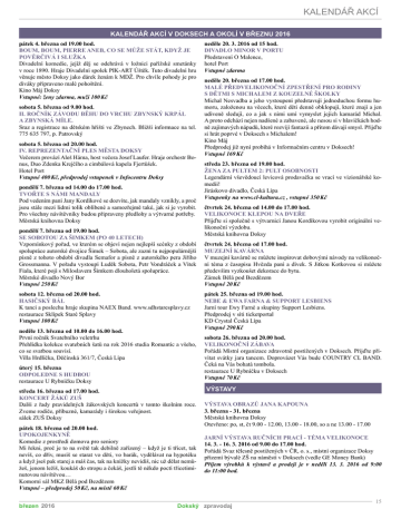 KALENDÁŘ AKCÍ KALENDÁŘ AKCÍ V DOKSECH A OKOLÍ V březnu 2016 pátek 4. března od 19.00 hod. Boum, boum, Pierre aneb, co se může stát, když je pověrčivá i služka Divadelní komedie, jejíž děj se odehrává v ložnici pařížské smetánky v roce 1890. Hraje Divadelní spolek PIK-ART Úštěk. Tuto divadelní hru věnuje město Doksy jako dárek ženám k MDŽ. Pro chvíle pohody je pro diváky připraveno malé pohoštění. Kino Máj Doksy Vstupné: ženy zdarma, muži 100 Kč sobota 5. března od 9.00 hod. II. ročník závodu běhu do vrchu ZBYNSKÝ KRPÁL a ZBYNSKÁ MÍLE. Sraz a registrace na dětském hřišti ve Zbynech. Bližší informace na tel. 775 635 797, p. Patrovský sobota 5. března od 20.00 hod. IV. reprezentační ples města doksy Večerem provází Aleš Háma, host večera Josef Laufer. Hraje orchestr Bonus, Duo Zdenka Krejčího a cimbálová kapela Fjertůšek. Hotel Port Vstupné 400 Kč, předprodej vstupenek v Infocentru Doksy pondělí 7. března od 14.00 do 17.00 hod. Tvořte s námi mandaly Pod vedením paní Jany Kordíkové se dozvíte, jak mandaly vznikly, a proč jsou stále mezi lidmi tolik oblíbené a samozřejmě také, jak si je vyrobit. Pro všechny návštěvníky budou připraveny předlohy a výtvarné potřeby. Městská knihovna Doksy pondělí 7. března od 19.00 hod. SE SOBOTOU ZA ŠIMKEM (Po 40 letech) Vzpomínkový pořad, ve kterém se objeví nejen nejlepší scénky z období spolupráce autorské dvojice Šimek – Sobota, ale zazní tu nejpopulárnější písně z tohoto období divadla Semafor a písně z autorského pera Jiřího Grossmanna. V pořadu vystoupí Luděk Sobota, Petr Vondráček a Vítek Fiala, které pojí s Miloslavem Šimkem dlouholetá spolupráce. Městské divadlo Nový Bor Vstupné 250 Kč sobota 12. března od 20.00 hod. Hasičský bál K tanci a poslechu hraje skupina NAEX Band. www.sdhstaresplavy.cz restaurace Sklípek Staré Splavy Vstupné 100 Kč neděle 13. března od 10.00 do 16.00 hod. První ročník Svatebního veletrhu Přehlídka kolekce svatebních šatů na rok 2016 studia Romantic a všeho, co se svatbou souvisí. Villa Hrdlička, Děčínská 361/7, Česká Lípa úterý 15. března Odpoledne s hudbou restaurace U Rybníčku Doksy středa 16. března od 17.00 hod. Koncert žáků ZUŠ Další z řady pravidelných žákovských koncertů v tomto školním roce. Zveme rodiče, příbuzné, kamarády i širokou veřejnost. sálek ZUŠ Doksy pátek 18. března od 20.00 hod. Upokojenkyně Komedie z prostředí domova pro seniory Mi řekni, proč je to na světě tak debilně zařízený – když je ti třicet, tak nevíš, co dřív, musíš se starat vo děti, vo barák, vydělávat na hypotéku a když jseš pak starej a máš čas, tak na knížky nevidíš, nic už dělat nemůžeš, jenom ležíš, koukáš do stropu a čekáš, jestli tě někdo poctí třicetiminutovou návštěvou… Komorní sál MKZ Bělá pod Bezdězem Vstupné – předprodej 50 Kč, na místě 60 Kč březen 2016 neděle 20. 3. 2016 od 15 hod. Divadlo Minor v Portu Představení O Malence, hotel Port Vstupné zdarma neděle 20. března od 17.00 hod. Malé předvelikonoční zpestření pro rodiny s dětmi s Michalem z Kouzelné školky Michal Nesvadba a jeho vystoupení představují jednoduchou formu humoru, založenou na věcech, které děti denně obklopují, které znají a jen udiveně sledují, co a jak s nimi umí vymyslet jejich kamarád Michal. A proto odchází nejen nadšené a zabavené, ale nesou si v hlavičkách hodně zajímavých nápadů, které rozvíjí fantazii a přitom dávají smysl. Přijďte si hrát poprvé v Doksech s Michalem! Kino Máj Předprodej již nyní probíhá v Informačním centru v Doksech! Vstupné 169 Kč středa 23. března od 19.00 hod. Žena za pultem 2: Pult osobnosti Legendární vševědoucí levicová prodavačka se vrací ve vizionářské komedii! Jiráskovo divadlo, Česká Lípa Vstupenky na www.cl-kultura.cz , vstupné 350 Kč čtvrtek 24. března od 14.00 do 17.00 hod. Velikonoce klepou na dveře Přijďte si společně s výtvarnicí Janou Kordíkovou vyrobit originální velikonoční výzdobu. Městská knihovna Doksy čtvrtek 24. března od 17.00 hod. Muzejní kavárna V muzejní kavárně se můžete inspirovat dobovými návody na velikonoční téma z časopisu Hvězda paní a dívek. S Jitkou Kotkovou si můžete především vyzkoušet dekorace do bytu. Zámek Bělá pod Bezdězem Vstupné 20 Kč pátek 25. března od 19.00 hod. NEBE & EWA FARNA & SUPPORT LESBIENS Jarní tour Ewy Farné a skupiny Support Lesbiens. Předprodej v síti ticketportal KD Crystal Česká Lípa Vstupné 290 Kč sobota 26. března od 20.00 hod. VELIKONOČNÍ ZÁBAVa Pořádá Místní organizace zdravotně postižených v Doksech. Přijďte přivítat svátky jara tancem. Doprovázet Vás bude COUNTRY CL BAND. Čeká na Vás bohatá tombola. restaurace U Rybníčku v Doksech Vstupné 70 Kč výstavy Výstava obrazů Jana Kapouna 3. března - 31. března Městská knihovna Doksy Otevřeno: po, st, čt 9.00 - 12.00, 13.00 - 18.00, so a ne 13.00 - 17.00 Jarní výstava ručních prací - téma Velikonoce 14. 3. - 16. 3. 2016 od 9.00 do 17.00 hod. Pořádá Svaz tělesně postižených v ČR, o. s., místní organizace Doksy přízemí bývalé ZŠ na náměstí v Doksech (vedle GE Money Bank) Příjem výrobků k výstavě a prodeji je v neděli 13. 3. 2016 od 9:00 do 11:00 hod. Dokský zpravodaj 15 KALENDÁŘ AKCÍ KINO MÁJ DOKSY – BŘEZEN 2016 776 550 862, http://kinomaj.mksdoksy.cz 1. úterý od 15.00 hod. Padesátka (tradiční odpolední projekce za snížené vstupné) Komedie, ČR, 2015, režie Vojtěch Kotek (TV seriál Nevinné lži), scénář Petr Kolečko (Okresní přebor). Co se stane na horách, zůstane na horách. Opravdovým kořením Krkonoš jsou místní horalé, kteří zde žijí, ať už je sezona jakákoliv. Hrají Ondřej Pavelka, Ma