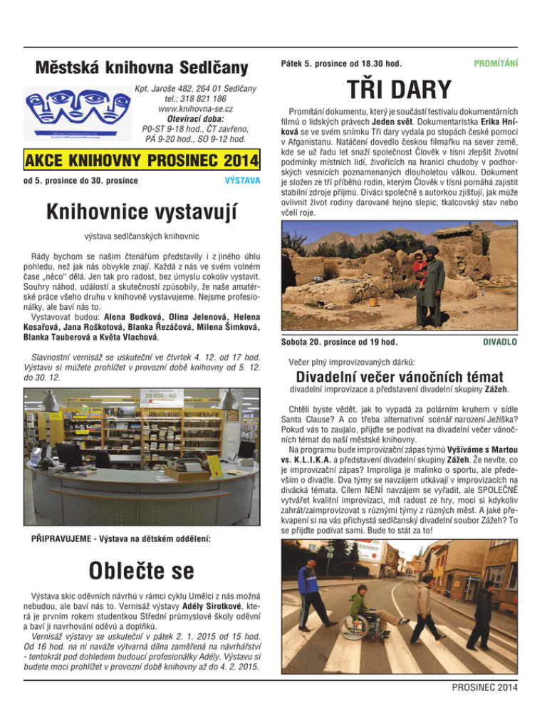 Městská knihovna Sedlčany Kpt. Jaroše 482, 264 01 Sedlčany tel.: 318 821 186 www.knihovna-se.cz Otevírací doba: P0-ST 9-18 hod., ČT zavřeno, PÁ 9-20 hod., SO 9-12 hod. AKCE KNIHOVNY PROSINEC 2014 od 5. prosince do 30. prosince VÝSTAVA Knihovnice vystavují Pátek 5. prosince od 18.30 hod. PROMÍTÁNÍ TŘI DARY Promítání dokumentu, který je součástí festivalu dokumentárních filmů o lidských právech Jeden svět. Dokumentaristka Erika Hníková se ve svém snímku Tři dary vydala po stopách české pomoci v Afganistanu. Natáčení dovedlo českou filmařku na sever země, kde se už řadu let snaží společnost Člověk v tísni zlepšit životní podmínky místních lidí, živořících na hranici chudoby v podhorských vesnicích poznamenaných dlouholetou válkou. Dokument je složen ze tří příběhů rodin, kterým Člověk v tísni pomáhá zajistit stabilní zdroje příjmů. Diváci společně s autorkou zjišťují, jak může ovlivnit život rodiny darované hejno slepic, tkalcovský stav nebo včelí roje. výstava sedlčanských knihovnic Rády bychom se našim čtenářům představily i z jiného úhlu pohledu, než jak nás obvykle znají. Každá z nás ve svém volném čase „něco“ dělá. Jen tak pro radost, bez úmyslu cokoliv vystavit. Souhry náhod, událostí a skutečností způsobily, že naše amatérské práce všeho druhu v knihovně vystavujeme. Nejsme profesionálky, ale baví nás to. Vystavovat budou: Alena Budková, Olina Jelenová, Helena Kosařová, Jana Roškotová, Blanka Řezáčová, Milena Šimková, Blanka Tauberová a Květa Vlachová. Slavnostní vernisáž se uskuteční ve čtvrtek 4. 12. od 17 hod. Výstavu si můžete prohlížet v provozní době knihovny od 5. 12. do 30. 12. Sobota 20. prosince od 19 hod. DIVADLO Večer plný improvizovaných dárků: Divadelní večer vánočních témat divadelní improvizace a představení divadelní skupiny Zážeh. PŘIPRAVUJEME - Výstava na dětském oddělení: Chtěli byste vědět, jak to vypadá za polárním kruhem v sídle Santa Clause? A co třeba alternativní scénář narození Ježíška? Pokud vás to zaujalo, přijďte se podívat na divadelní večer vánočních témat do naší městské knihovny. Na programu bude improvizační zápas týmů Vyšíváme s Martou vs. K.L.I.K.A. a představení divadelní skupiny Zážeh. Že nevíte, co je improvizační zápas? Improliga je malinko o sportu, ale především o divadle. Dva týmy se navzájem utkávají v improvizacích na divácká témata. Cílem NENÍ navzájem se vyřadit, ale SPOLEČNĚ vytvářet kvalitní improvizaci, mít radost ze hry, moci si kdykoliv zahrát/zaimprovizovat s různými týmy z různých měst. A jaké překvapení si na vás přichystá sedlčanský divadelní soubor Zážeh? To se přijďte podívat sami. Bude to stát za to! Oblečte se Výstava skic oděvních návrhů v rámci cyklu Umělci z nás možná nebudou, ale baví nás to. Vernisáž výstavy Adély Sirotkové, která je prvním rokem studentkou Střední průmyslové školy oděvní a baví ji navrhování oděvů a doplňků. Vernisáž výstavy se uskuteční v pátek 2. 1. 2015 od 15 hod. Od 16 hod. na ni naváže výtvarná dílna zaměřená na návrhářství - tentokrát pod dohledem budoucí profesionálky Adély. Výstavu si budete moci prohlížet v provozní době knihovny až do 4. 2. 2015. PROSINEC 2014 Programy na dětském oddělení pro veřejnost: Středa 3. 12. 2014 od 17 hod. Hajánek – zdravé čtení na dobrou noc. Pravidelný středeční cyklus pro celé rodiny. Pátek 5. 12. 2014 od 15 hod. Návštěva Pohádkové babičky nebo Pohádkového dědečka a Mikulášská nadílka – čtení bude kratší a z knihy Jiřího Kahouna U všech čertů. Mikuláš přijde i se svým čertovským doprovodem, a pokud byli a budou návštěvníci knihovny hodní, dostanou také malou nadílku. Na tento program naváže od 16 hod. Pekelná výtvarná dílna a kreslit budeme uhlem – to je oblíbená čertovská technika. Středa 10. 12. 2014 od 16 hod. (VÝJIMEČNĚ!) Jak medvědi slavili Vánoce – program pro rodiče s dětmi, tentokrát na motivy pohádky Michala Černíka a Zbyňka Malinského. Pro rodiče a prarodiče bude připravena nabídka kuchařských knih s nejrůznějšími recepty. Středa 10. 12. 2014 od 17 hod. Hajánek – zdravé čtení na dobrou noc. Pravidelný středeční cyklus pro celé rodiny. Pátek 12. 12. 2014 od 15 hod. Lucie a Barbora – postavy, jejichž pochůzky k Adventu dříve neodmyslitelně patřily. Tentokrát přijdou mezi nás a připomenou nejen své osudy, ale také úlohy, které jim lidé v předvánoční době přisoudili. Na tento program naváže od 16 hod. výtvarná dílna Vánoční quilling. Touto technikou zkusíme vyrobit ozdoby na vánoční stromeček. Středa 17. 12. 2014 od 17 hod. Hajánek – zdravé čtení na dobrou noc. Pravidelný středeční cyklus pro celé rodiny. Pátek 19. 12. 2014 od 15 hod. Návštěva Pohádkové babičky nebo Pohádkového dědečka – čtení z knihy Ptáčkoviny Zbyňka Malinského, konkrétně pohádky týkající se Vánoc. Od 16 hod budeme při Vánoční výtvarné dílně vyrábět skládané papírové stromečky a průsvitky do oken. PROSINEC 2014 Kluby v komunitním centru Součástí knihovny je i komunitní Centrum Lukáš. Kluby, které v tomto centru působí, může navštěvovat úplně každý. Můžete se přijít třeba i nezávazně poradit… Fotografování – FotoFlegmatici Sedlčany: 27. 12. od 18 hod. Klub harmonické bytosti a cvičení Qigong: schází se v pondělí, v rámci klubu probíhá cvičení Qigong - od 17.30 do 18.30 hod. pouze pro ženy, od 18.30 do 19.30 hod. pro ženy i pro muže. Klub Mnémé: 10. 12. od 9 hod. Klub pletení a háčkování: schází se každý pátek od 15 do 17 hod. Krajkový klub (paličkování): schází se každé úterý od 15 do 18 