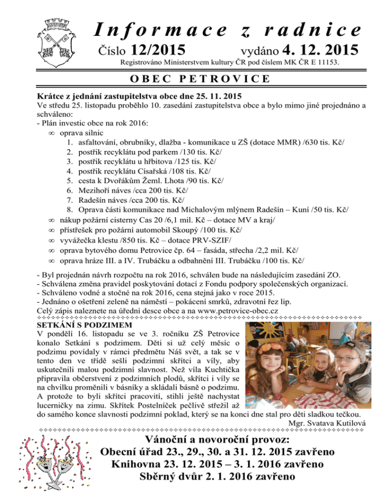 Informace z radnice Číslo 12/2015 vydáno 4. 12. 2015 Registrováno Ministerstvem kultury ČR pod číslem MK ČR E 11153. OBEC PETROVICE Krátce z jednání zastupitelstva obce dne 25. 11. 2015 Ve středu 25. listopadu proběhlo 10. zasedání zastupitelstva obce a bylo mimo jiné projednáno a schváleno: - Plán investic obce na rok 2016: • oprava silnic 1. asfaltování, obrubníky, dlažba - komunikace u ZŠ (dotace MMR) /630 tis. Kč/ 2. postřik recyklátu pod parkem /130 tis. Kč/ 3. postřik recyklátu u hřbitova /125 tis. Kč/ 4. postřik recyklátu Císařská /108 tis. Kč/ 5. cesta k Dvořákům Žeml. Lhota /90 tis. Kč/ 6. Mezihoří náves /cca 200 tis. Kč/ 7. Radešín náves /cca 200 tis. Kč/ 8. Oprava části komunikace nad Michalovým mlýnem Radešín – Kuní /50 tis. Kč/ • nákup požární cisterny Cas 20 /6,1 mil. Kč – dotace MV a kraj/ • přístřešek pro požární automobil Skoupý /100 tis. Kč/ • vyvážečka klestu /850 tis. Kč – dotace PRV-SZIF/ • oprava bytového domu Petrovice čp. 64 – fasáda, střecha /2,2 mil. Kč/ • oprava hráze III. a IV. Trubáčku a odbahnění III. Trubáčku /100 tis. Kč/ - Byl projednán návrh rozpočtu na rok 2016, schválen bude na následujícím zasedání ZO. - Schválena změna pravidel poskytování dotací z Fondu podpory společenských organizací. - Schváleno vodné a stočné na rok 2016, cena stejná jako v roce 2015. - Jednáno o ošetření zeleně na náměstí – pokácení smrků, zdravotní řez lip. Celý zápis naleznete na úřední desce obce a na www.petrovice-obec.cz SETKÁNÍ S PODZIMEM V pondělí 16. listopadu se ve 3. ročníku ZŠ Petrovice konalo Setkání s podzimem. Děti si už celý měsíc o podzimu povídaly v rámci předmětu Náš svět, a tak se v tento den ve třídě sešli podzimní skřítci a víly, aby uskutečnili malou podzimní slavnost. Než víla Kuchtička připravila občerstvení z podzimních plodů, skřítci i víly se na chvilku proměnili v básníky a skládali básně o podzimu. A protože to byli skřítci pracovití, stihli ještě nachystat lucerničky na zimu. Skřítek Postelníček pečlivě střežil až do samého konce slavnosti podzimní poklad, který se na konci dne stal pro děti sladkou tečkou. Mgr. Svatava Kutilová Vánoční a novoroční provoz: Obecní úřad 23., 29., 30. a 31. 12. 2015 zavřeno Knihovna 23. 12. 2015 – 3. 1. 2016 zavřeno Sběrný dvůr 2. 1. 2016 zavřeno Poslední sbohem Od posledního vydání Informací z radnice jsme se rozloučili s našimi spoluobčany Václavem Hrochem, Petrovice Jaroslavem Štemberkem, Žemličkova Lhota Dobroslavou Šáchovou, Petrovice Pozůstalým vyslovujeme hlubokou soustrast. Noví občánci v naší obci: Jaroslav Dlouhý, Petrovice Malému Jarouškovi přejeme na cestě životem hodně zdraví, štěstí, lásky a pohody ☺ Jménem rodiny bych chtěla poděkovat MUDr. Zorce Čelikovské za citlivou a profesionální péči o našeho tatínka Václava Dvořáka v jeho těžké nemoci až do posledních chvil jeho života. Všem za květinové dary a vyjádřené soustrasti a otci Strachovskému za krásný smutečný projev. Barbora Rothová Prosincové zprávy z petrovické školky. Nejprve však ještě k listopadu. Děkujeme všem, kteří s námi letos přišli přivítat Sv. Martina. „Světe div se“ – zase přijel. Pravda, letos změnil trochu vzhled i trasu, ale troufáme si tvrdit, že jsme si akci i tak užili. Děti hledaly po parku martinský poklad a pak už jsme šli z parku do parku. Na náměstí čekalo děti překvapení v podobě projížděk na bílém poníkovi a my dospělí jsme si mohli večer provonět punčem nebo svařákem. Dětem musel stačit čaj, ale sladké doháněly napečenými dobrotami (práce hlavně našich zaměstnankyň v kuchyni). K příjemné atmosféře pomohl i sponzorský dar od p. Řeháka – římská svíce. Děkujeme jemu a hlavně týmu Sv. Martina. Tak zase za rok. Další, komu chceme poděkovat, je firma BES, konkrétně Ondřej Šimák, který dal sponzorsky naší MŠ nové polštářky. Na těch dosavadních možná lehávali ještě někteří ze současných rodičů, tak už něco pamatují ☺ Děkujeme tedy BESu a p. V. Vrzalové, která nás doporučila. Vzájemně, doufáme, jsme se obohatili i se školáky ZŠ, konkrétně třídou paní učitelky Hedvikové. Nehledejte v tom žádné materiální statky, ale navštívili nás na celé dopoledne, společně si hráli, malovali ježky, pomáhali s oblékáním (starší mladším ☺) a také šli na společnou vycházku. Viděli jste delší „štrůdl“ dětí rozmanitého věku? Tak to byl společný projektový den MŠ a ZŠ. Školáci a paní učitelko – přijďte zas! S koncem listopadu nám skončil i kurz plavání – zvládli ho všichni s jedničkou na „Mokrém vysvědčení“. Letošní Adventní spirála se prvně konala v Obecním domě. Konečně jsme se nemačkali, místa dost, nicméně ve školce ty stísněnější prostory zase působí jaksi „útulněji“. Uvidíme, jak příště. A v prosinci už to jede: čerti ve školce, hned za nimi divadlo „O cukrářce Barborce“ (v MŠ), další den výlet do dětského centra v Příbrami a návštěva Nebe a Pekla v místních dolech. V sobotu 5. 12., ještě než nás někoho seberou večer čerti, přivítáme do Petrovic naše nejmenší v obřadní síni. A pak? Čeká nás vánoční besídka a asi si ani nedovedete představit, co práce nám to každoročně dá – snad to na výsledku bude vidět. Můžete se přijít podívat i vy, co jste se dříve do školky nevešli. Budeme prvně s besídkou v Obecním domě. Přijďte nám pomoci s koledami, jako trénink na „Zpívání u stromečku“. Plánujeme ji na čtvrtek 17. 12. asi od 16 hod., upřesníme plakátkem. Tak se s vámi ani nebudeme loučit, přijďte a popřejeme si nový rok po besídce v O