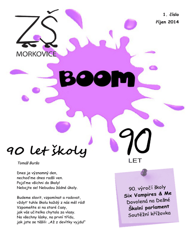 1. číslo říjen 2014 90 let školy Tomáš Burša Dnes je významný den, nechoďme dnes radši ven. Pojďme všichni do školy! Nebojte se! Nebudou žádné úkoly. Budeme slavit, vzpomínat a radovat, vždyť tuhle školu každý z nás měl rád! Vzpomeňte si na staré časy, jak vás učitelka chytala za vlasy. Na všechny lásky, na první třídu, jak jste se těšili: „Až z devítky vyjdu!“ Sportovní odpoledne Martin Medek V sobotu 20. září proběhlo na Morkovickém hřišti sportovní odpoledne. Přijel dokonce i klaun, hrála se vybíjená s rodiči a dětmi, proběhl fotbalový turnaj mezi rodiči a dětmi, fotbal mužů proti ženám, přijelo i hasičské auto a na samotný závěr jsme si opekli špekáčky a začalo pršet. Kdo přišel, určitě se nenudil. Běh Naděje Filip Štěpánek Běh Naděje je sportovní humanitární akce, kterou účastníci přispívají na výzkum zákeřné nemoci – rakoviny. Tento ročník byl již sedmý v pořadí. Poprvé byl běh pořádán v roce 2008 pod názvem Běh Terryho Foxe. Historie Terry Fox se narodil v roce 1958 v Kanadě. V osmnácti letech dostal rakovinu a lékaři mu museli amputovat pravou nohu. Jeho noha mu byla nahrazena železnou. Následně se účastnil různých maratonů. Chtěl tak podpořit ostatní lidi s touto nemocí. Terry Fox v roce 1981 na následky své nemoci, které mu způsobily zápal plic, zemřel. Současnost Od roku 1993 až do roku 2007 byly organizovány sportovní akce pod názvem Běh Terryho Foxe. Tyto akce se probíhaly i u nás ve škole v našem městě, než na ně v roce 2008 navázal Běh Naděje. Letos se v Morkovicích vybralo celkem 7958 Kč. Z toho 6723 Kč se vybralo v pátek ve škole a 1235 Kč v sobotu na Strašné. 2 Běh Naděje 2014 na Strašné Já s mými kamarády jsme se taky zúčastnili sobotního Běhu Naděje. Sice ne jako soutěžící, ale jako pořadatelé – pomáhali jsme paní učitelce Hladné. Za úkol jsme měli pomocí fáborků vyznačit cestu na Strašnou. Začalo ale pršet. Naštěstí jsme byli blízko Strašné a tak jsme se tam rychle dostali a schovali se. I tak jsme ale hodně zmokli, zvlášť při zpáteční cestě. I přes ten nepříjemný déšť jsem rád, že jsem mohl pomoct při organizaci běhu. Madio v 6.A Aneta Strašáková V září se k nám do třídy přišla představit paní učitelka Gabča, která pracuje ve společnosti Madio. Tam se zabývají chováním dětí ve třídě, jejich kamarádstvím a vůbec přátelstvím celého třídního kolektivu. Je pravda, že patříme do kategorie spíše zlobivějších tříd. První návštěva pro nás znamenala hlavně čtyři hodiny bez vyučování. Gabča nás formou her učí, jak se k sobě hezky chovat, nehádat se a mít ten nejlepší kolektiv ve škole. S celou třídou se tím strašně bavíme a velice se na její další návštěvu těšíme. Zrovna dnes, 13. října, jsme si s Gabčou zahráli hru na žraloka, která spočívala v tom, že jsme měli připravených několik židlí a já i s celou třídou jsme museli stát na co nejmenším počtu židlí tak, aby nás žralok Gabča nekousla. Když někdo upadl, všichni prohráli. Užili jsme si při tom strašně moc legrace. Celou třídu nás její hry hodně baví a už se zase těšíme na další lekci Madio. 3 90. výročí školy Filip Štěpánek Tento rok naše škola slaví své 90. výročí od svého vzniku. Ano, už je to 90 let, co tu v Morkovicích stojí stará budova naší školy. V souvislosti s touto události se v naší škole děje hned několik akcí. V září proběhlo Míčové klání s rodiči. Akce probíhala na hřišti, před školou. Více se o ní můžete dozvědět v předchozím článku Martina Medka. Další událostí bude Den otevřených dveří, který se uskuteční 29. října. Na tuto akci jsou zvání všichni lidé. Na speciální program, který proběhne ve školní tělocvičně, jsou pozvaní už jen bývalí a současní zaměstnanci školy. Naše škola, přesněji stará budova, byla slavnostně otevřena v roce 1924. Hned v roce 1930 bylo ke škole přistavěno další křídlo. Tělocvična a další tři třídy byly ke škole dostavěny v roce 1957. O deset let později byla přistavěna školní jídelna – tedy v roce 1967. Na podzim v roce 1985 byla otevřena nová budova, kde jsou třídy a kabinety pro 2. stupeň. V roce 2003 byla na staré budově vyměněna okna a v roce 2006 se stará budova zateplovala. V roce 2011 byli zatepleny ještě 2 další budovy – nová budova a jídelna s družinami. Možná ani nevíte, že naši školu navrhoval architekt, který také navrhoval budovu s ordinací v seriálu „Ordinace v Růžové zahradě“. Na první fotografii určitě poznáváte starou školní budovu. Na druhé fotografii je zachycena stavba nové budovy. Více historických fotografií najdete na internetové stránce věnované výročí naší školy: www.zsmorkovice.cz/90. Naše škola se mi hodně líbí. Ostatní, novější školy už tak pěkné nejsou. Naše škola je opravdu krásná a jsem rád, že do ní můžu chodit. 4 Tři bratři Michaela Navrátilová Tato pohádka měla premiéru 14. srpna 2014. Pojednává o třech bratřích, kteří se vydávají do světa. Jeden se jmenuje Jan a hraje ho Tomáš Klus. Ten probudí Šípkovou Růženku, která spala 100 let. Získá tak její srdce a stane se králem. A vždy zapomene někde nějakou věc. Další z bratrů je Pepa a hraje ho Vojta Dyk. Pepa bude třikrát usilovat o srdce prosté Marušky ze tří měsíčků. Do všeho se hrne a moc se nerozmýšlí. Nejmladší z bratrů se jmenuje Matěj, hraje ho Zdeněk Piškula. Ten si namluví Červenou Karkulku. Jeho vlastností je, že je nerozhodný. Nakonec pohádka skončí dobře jako každá pohádka. Je hodně hudební. Mně osobně se moc líbila. Meggy Nikola Kučírková Od června k nám přibyl nový