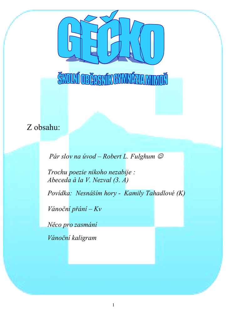 Z obsahu: Pár slov na úvod – Robert L. Fulghum Trochu poezie nikoho nezabije : Abeceda à la V. Nezval (3. A) Povídka: Nesnáším hory - Kamily Tahadlové (K) Vánoční přání – Kv Něco pro zasmání Vánoční kaligram 1 Než se rozkoukáme, bude roku 2013 odzvoněno. Někdy si přeji, aby se běh roku alespoň trochu zpomalil a život tak rychle neutíkal. Ale ubíhá dál a stále rychleji. Není tomu tak dávno, co skončily prázdniny, a už tu máme Vánoce. Na konci roku se často ohlížíme zpět a hodnotíme, co se nám povedlo a co ne. Na začátku toho nového si slibujeme, co budeme dělat jinak, jak budeme lépe žít. Přitom někdy stačí tak málo, abychom byli se svým životem spokojení. Třeba žít tak, jak nám doporučuje americký spisovatel Robert L. Fulghum. Robert L. Fulghum VŠECHNO, CO OPRAVDU POTŘEBUJU ZNÁT o tom, jak žít, co dělat a jak vůbec být, jsem se naučil v mateřské školce. Moudrost mě nečekala na vrcholu hory zvané postgraduál, ale na pískovišti v nedělní škole. Tohle jsem se tam naučil: O všechno se rozděl. Hraj fér. Nikoho nebij. Vracej věci tam, kde jsi je našel. Uklízej po sobě. Neber si nic, co ti nepatří. Když někomu ublížíš, řekni promiň. Před jídlem si umyj ruce. Splachuj. Teplé koláčky a studené mléko ti udělají dobře. Žij vyrovnaně - trochu se uč a trochu přemýšlej a každý den trochu maluj a kresli a tancuj a hraj si a pracuj. Každý den odpoledne si zdřímni. Když vyrazíš do světa, dávej pozor na auta, chytni někoho za ruku a drž se s ostatními pohromadě. Nepřestávej žasnout. Vzpomeň si na semínko v plastikovém kelímku - kořínky míří dolů a rostlinka stoupá vzhůru a nikdo vlastně neví jak a proč, ale my všichni jsme takoví. Zlaté rybičky, křečci a bílé myšky, a dokonce i to semínko v kelímku - všichni umřou. My také. A nikdy nezapomeň na dětské obrázkové knížky a první slovo, které ses naučil - největší slovo ze všech - DÍVEJ SE. Věřím, že fantazie je silnější než vědění. Že mýty mají větší moc než historie. Že sny jsou mocnější než skutečnost. Že naděje vždy zvítězí nad zkušeností. Že smích je jediným lékem na zármutek. A věřím, že láska je silnější než smrt. 2 Abeceda à la 3. A (na motivy V. Nezvala) Den poezie - listopad 2013 C Podkovičku pro štěstí už má skoro každý, zvlášť klestí-li si cestu přes překážky těžký. (A. Toráňová) Měsíc couvá, srpy sečou, děti s céčky hrají si. Au, to bolí, koukám dolů, ejhle ji – náušnici. (V. Pražáková) E Hrabu s tebou listí Pro snazší práci a méně řečí Jsi prodlouženou rukojetí Rukojetí stvořenou pro tvé použití (J. Kesler) H Ze žebříku jedna část, po který se leze. Když se budeš hodně třást, můžeš skončit vleže. (D. Holub) H jako hráči hokejoví a brankář, co ze sítě kotouč loví. Trenér na střídačce velmi křičí a lidé na tribunách choreo cvičí. (B. Němečková) Maličký žebříček stojí tu v pokoji, Když se naň podívám, oči mě nebolí. Je to však písmeno, podívej přeci, Há se mu říká a značí spoustu věcí. (K. Řezníčková) 3 Hned slez z toho žebříku, nechci tě mít na triku. (V. Pražáková) CH Ch je zvláštní písmeno, Z C a H je sestaveno. Nechtěly být nejspíš samy, tak to daly dohromady. (D. Hronová) I I ční jak maják na pobřeží. Když had natáhne se a na zemi leží, je to pouhá přímá čára, jako když k nebi stoupá pára. (K. Adamcová) J Prázdná rukojeť od deštníku dnes nevadí, vždyť neprší. Pár mincí přistálo do klobouku. Po dešti se hned vše usuší. (K. Procházková) Do Jéčka si člověk sedne, na hák něco zavěsí, paraplíčko na něm zvedne, sestro Jano,kdepak jsi? (K. Řezníčková) Háček navázaný na udici lehce plave po vodě tak jako já na pramici v empirické náladě (L. Wohlrábová) L Hokej se jen na ledě hraje, led pod rýhami bruslí taje. Letos nám lavina gólů schází, fanoušci na led perníčky hází. M Připomínáš vršky hor, čiší přitom z tebe vzdor. Vždyť ty jsi přece majestát, jenž uprostřed abecedy vždy bude hrdě stát. (A. Pálová) 4 N Milenec k milé láskou je přitažen. Láska však vratká je jak spojovací linka hlásky N. (K. Hodková) O Rybník plný prázdna, les písmen okolo, voda deroucí se ze dna a kolem příjemno. (A. Toráňová) Rybník plný rybiček, vodník zpívá žábám. Loví tam můj dědeček a já mu s kolou mávám. (K. Kytková) P Na štíhlé noze vypouklé břicho, jakmile píšu tě, všude je ticho. Dvě ladné linky a je to hotovo, písmeno P je na světě nanovo. (K. Řezníčková) R R se rmoutí R se hroutí R se raduje R také čaruje R se umí rvát Ale R s háčkem to umí jen řvát (K. Hodková) S Tak jako loď na vlnách potácím se životem. V ulicích teď bloudím sám jak plavidlo nad mořem. (L. Wohlrábová) Vidím hada, co je sám, má strach o svůj život a neví kudy kam. Tak tu raděj zůstal stát. (L. Domažlická) 5 Had se kroutí ve křoví a loví tam žabky. Dám si pivo lahvový a půjdu tam taky. (D. Holub) T Bez hlavy se často myslí, ruce jen tak roztáhnu. Tělo tu jen svisle visí, tak se aspoň protáhnu. (K. Kytková) Jedna tyčka svisle dolů, druhá tyčka kolmá je. Dejte všichni hlavu dolů, fyzikální věc to je. (L. Domažlická) U Hluboké lesní údolí, koryto vodou se naplní. (K. Adamcová) X Křivé nohy dítěte, je to, co tu píšete? Zákaz oblíben není. Je dovoleno zastavení? (K. Procházková) X je jako křížek do nebeských výšek. Čárka sem a, čárka tam, snadno X načrtám. (D. Hronová) Y Jako trychtýř plný lásky Proteče jím každému pouze kapička. Ten,kdo si však nedělá z ní vrásky, Proplouvá životem jako lodička. (A. Pálová) Pohár vína, co jsem právě dopil, a jeho tvar ozářil svícnu sv