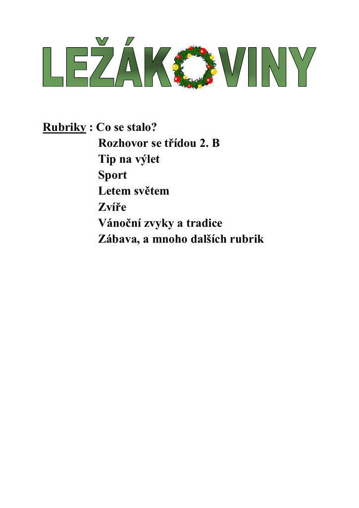 Rubriky : Co se stalo? Rozhovor se třídou 2. B Tip na výlet Sport Letem světem Zvíře Vánoční zvyky a tradice Zábava, a mnoho dalších rubrik … na úv d … Ahoj všichni. Vítám vás u vánočního čísla Leţákovin. V tomto díle se dozvíme skoro vše o vánočních zvycích a tradicích, abyste je mohli poté o Vánocích uskutečnit s rodiči. Ale teď uţ ţádné povídání a hurá na rubriky. Akce na Leţákovce: Prezentace středních škol 4. 11. Kdyţ začíná matika, není ţádná panika 13. 11. – projektové odpoledne nejen pro předškoláčky. Předávání slabikářů prvňáčkům 14. 11. v Městské knihovně Hlinsko Škola nanečisto Dne 13. listopadu se mohli všichni rodiče budoucích prvňáčků, kteří měli zájem, seznámit s novou matematikou, sejít u nás ve škole. Děti, které přišly s rodiči, si vyzkoušely, jaké je pracovat s interaktivní tabulí a plnily různé úkoly. Dne 4. prosince se uskuteční ,,Vánoční těšení na Leţákovce„„, při kterém proběhne slavnostní rozsvícení stromečku doprovázené zpěvem vánočních koled. Děti, které dorazí, si budou moci domů odnést ručně vyráběné vánoční dekorace. Burza škol Naše škola uspořádala pro ţáky 8. a 9. ročníků Burzu škol, na které se mohli seznámit s vybranými školami a dozvědět se, jaké nabízejí učební a studijní obory. Tato akce proběhla 4. listopadu v tělocvičně naší školy. Okresní přebor škol v šachu Ve středu 13. listopadu se v Multifunkčním centru v Hlinsku konal OKRESNÍ PŘEBOR ŠKOL V ŠACHU. Celkově se hrálo ve dvou kategoriích, které byly rozděleny na ţáky prvního stupně a ţáky druhého stupně. Naše škola se umístila na 2. místě a postupuje do krajského kola do Poličky. Vánoční rozhovor s třídou 2. B „Šmoulové“ Tentokrát jsme si pro vás připravily vánoční rozhovor s ţáky 2. B. Jaké vánoční zvyky dodrţujete? A pomáháte rodičům s pečením cukroví? 1. Uţ jste psali „JEŢÍŠKOVI“? Ano. 2. Pomáháte rodičům s pečením? Ano. 3. Jaké cukroví máte nejraději? Linecké cukroví, čokoládové a vanilkové rohlíčky. Většina dětí miluje perníčky. Paní učitelka neodolá vanilkovým rohlíčkům. 4. Co děláte celý den, neţ nastane Štědrý večer? Jezdíme pomáhat k babičce, pomáháme mamce a stavíme sněhuláky. 5. Co máte všechno za pokrmy při večeři? Máme rybí řízek s kaší, hrachovou polévku, rybí polévku, rybí prsty, bramborový salát a vinnou klobásu. 6. Na jaké vánoční pohádky se díváte nejraději? Nejraději máme pohádku Mrazík a klasiku Tři oříšky pro popelku. 7. Dodrţujete nějaké vánoční zvyky? Házíme botou, krájíme jablka, jíme bezmasé jídlo k obědu, pouštíme lodičky, vyrábíme vánoční výzdobu. 8. Kolik byste chtěli najít dárků pod vánočním stromečkem? To byly rozdílné odpovědi. 8 dětí by chtělo dostat 24 dárků, zbytek dětí by si přálo najít do deseti dárků pod stromečkem. 9. Je něco, co byste od jeţíška dostat nechtěli? Nechtěli bychom dostat uhlí a počítač. 10. A teď jedna otázka mimo. Chtěli byste uţ sníh a proč? Ano. Budeme stavět sněhuláky, budeme se koulovat, lyţovat, stavět iglú. 11. A otázka na paní učitelku. Co vy byste si přála pod stromeček? Chtěla bych klid. Je to těţké, hmotný dárek potěší, ale spíše ten klid. 12. Jaký dárek byste chtěli najít pod stromečkem? Gábinka – plyšák veverka, Káťa – minilaboratoř, Bára – hodinky, Martin – aby byli všichni zdraví, Tereza – telefon, Květuška – opička s plínkami, Káťa – barbie, Pája – Legofriends, Mára – velké auto, Heli – Legofriends, Michal – robot na ovládání, Lucka – Ledofriends, Jindra – Lego, Honzík – velký plyšový medvídek, Filip – plyšová opice Děkuje druháčkům a paní učitelce, Mgr. Janě Řezníčkové, za rozhovor. Všem ţákům a kantorům naší „Leţákovky“ přejeme šťastné a veselé Vánoce. Vaše redaktorky, Nicol Mrkvičková a Karolína Burešová Rozkrajování jablka U štědrovečerní večeře se při rozkrajování jablíček určuje, jaké to bude se zdravím členů rodiny. Nejdříve se rozkrojí jablko, kaţdý člen má jedno. Jestli se objeví hvězdička, znamená to, ţe celý nastávající rok bude dotyčný zdravý. Pokud se objeví v rozkrojeném jablku kříţek, není to nic dobrého. Lití olova Olůvka se roztaví v kovové nádobce. Roztavený kov se opatrně lije do nádoby se studenou vodou. Aţ poté, co ztuhne, se můţe vyjmout z vody a podívat se, co věští. Výklady mohou být různé, proto je důleţité dát srozumitelnou otázku. Házení střevícem Tato věštba měla povědět mladým dívkám, jestli se příští rok vdají. Děvče se postavilo zády ke dveřím a dozadu hodila svůj střevíc. Pokud po dopadu špička střevíce ukazovala ven ze dveří, znamenalo to, ţe se dívka do roka provdá. Pokud ne, zůstane v příštím roce svobodná. Pouštění lodiček Kaţdý si zhotoví svoji lodičku ze skořápek ořechů a do ní se vloţí svíčka. Smí se poloţit jen jedna jasná otázka a to ve chvíli, kdy se bude v lodičce zapalovat svíčka a spouštět se na vodu. Autor: Zdeňka Nováková Jak se slaví Vánoce v Česku, ví kaţdé malé dítě. Ale na celém světě to není stejné. Třeba v arabských zemích se Vánoce neslaví vůbec, protoţe tam vyznávají náboţenství ISLÁM. Christmas, Weihnachten, Noël, Julen, Navidad, Natale, Joulu, Natal a Noel: tak se v různých jazycích řeknou Vánoce. A stejně tak, jako jsou různé názvy pro Vánoce, je i spousta vánočních zvyků. Anglie Pro Angličany je nejdůleţitější den, 25. prosinec. Večer 24. prosince si pod okno nebo na krb pověsí dlouhé ponoţky, kde ráno najdou dárečky a sladkosti. Ráno také rychle běţí ke stromečku, kd