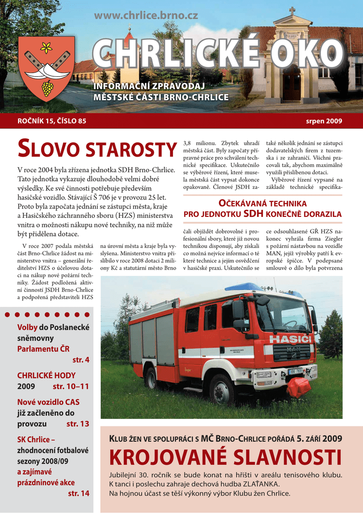 www.chrlice.brno.cz CHRLICKÉ OKO INFORMAČNÍ ZPRAVODAJ MĚSTSKÉ ČÁSTI BRNO-CHRLICE ROČNÍK 15, ČÍSLO 85 srpen 2009 SLOVO STAROSTY V roce 2004 byla zřízena jednotka SDH Brno-Chrlice. Tato jednotka vykazuje dlouhodobě velmi dobré výsledky. Ke své činnosti potřebuje především hasičské vozidlo. Stávající Š 706 je v provozu 25 let. Proto byla započata jednání se zástupci města, kraje a Hasičského záchranného sboru (HZS) ministerstva vnitra o možnosti nákupu nové techniky, na niž může být přidělena dotace. V roce 2007 podala městská část Brno-Chrlice žádost na ministerstvo vnitra – generální ředitelství HZS o účelovou dotaci na nákup nové požární techniky. Žádost podložená aktivní činností JSDH Brno-Chrlice a podpořená představiteli HZS na úrovní města a kraje byla vyslyšena. Ministerstvo vnitra přislíbilo v roce 2008 dotaci 2 miliony Kč a statutární město Brno 3,8 milionu. Zbytek uhradí městská část. Byly započaty přípravné práce pro schválení technické specifikace. Uskutečnilo se výběrové řízení, které musela městská část vypsat dokonce opakovaně. Členové JSDH za- také několik jednání se zástupci dodavatelských firem z tuzemska i ze zahraničí. Všichni pracovali tak, abychom maximálně využili přislíbenou dotaci. Výběrové řízení vypsané na základě technické specifika- OČEKÁVANÁ TECHNIKA PRO JEDNOTKU SDH KONEČNĚ DORAZILA čali objíždět dobrovolné i profesionální sbory, které již novou technikou disponují, aby získali co možná nejvíce informací o té které technice a jejím osvědčení v hasičské praxi. Uskutečnilo se ce odsouhlasené GŘ HZS nakonec vyhrála firma Ziegler s požární nástavbou na vozidle MAN, jejíž výrobky patří k evropské špičce. V podepsané smlouvě o dílo byla potvrzena Volby do Poslanecké sněmovny Parlamentu ČR str. 4 CHRLICKÉ HODY 2009 str. 10–11 Nové vozidlo CAS již začleněno do provozu str. 13 SK Chrlice – zhodnocení fotbalové sezony 2008/09 a zajímavé prázdninové akce str. 14 KLUB ŽEN VE SPOLUPRÁCI S MČ BRNO-CHRLICE POŘÁDÁ 5. ZÁŘÍ 2009 KROJOVANÉ SLAVNOSTI Jubilejní 30. ročník se bude konat na hřišti v areálu tenisového klubu. K tanci i poslechu zahraje dechová hudba ZLAŤANKA. Na hojnou účast se těší výkonný výbor Klubu žen Chrlice. Z města CHRLICKÉ OKO / SRPEN 2009 dodávka do 30. listopadu 2008. Bohužel nastal problém s dodavatelem podvozku a firma Ziegler slíbený termín koncem roku 2008 nesplnila. Následovala složitá a nelehká jednání na úrovni ministerstva vnitra a GŘ HZS, jejichž výsledkem je možné převedení prostředků dotace do roku 2009. V průběhu této doby jsme nezaháleli. Uskutečnilo se několik návštěv zástupců městské části a členů sboru ve výrobním závodě firmy Ziegler v německém Mühlau k upřesnění podoby vozidla a umístění specifikované techniky v nástavbě vozidla. V úterý 23. 6. 2009 byl zástupcem firmy Ziegler Hasič- ská Technika předán do užívání nový zásahový automobil CAS 15 MAN 13 280 4X4. Tedy: Cisternová Automobilová Stříkačka s předurčením pro hašení požárů, především pro budovy, byty, ale i různé stavby. Vůz je připraven i pro technické zásahy, čemuž odpovídá i jeho vybavení. Požární automobil byl vyroben dle technické specifikace, vozidlo zajišťuje plně funkčnost, bezpečný provoz a plní podmínky, pro které bylo pořízeno. Automobil, jenž dostala do užívání jednotka SDH BrnoChrlice, prezentuje moderní zásahové vozidlo plně vyhovující úkolům, pro které je naše jednotka předurčena v rám- ci plošného pokrytí záchrannými silami a prostředky. Nahradí tak dosluhující automobil Š 706 RTHP, o jehož dalším osudu rozhodne rada městské části. Již v etapě příslibu dotací na financování vozidla CAS bylo zvažováno jeho garážování. Studie s rozšířením stávající zbrojnice narazila na problém s propadlou kanalizací, zásahem do zeleně a stísněným vnitřním prostorem. Hledala se varianta na pozemcích města Brna, padla volba na zázemí za radnicí. V současné době probíhají přípravné projektové práce a zároveň také jednání o financování výstavby objektu, který poslou- ží jako hasičská zbrojnice, archiv úřadu MČ a zázemí pro pracovníky údržby a úklidu MČ. V naší obcí by tak měla být vytvořena silná záchranářská základna schopná operovat v jihovýchodním regionu města Brna. Do doby realizace této akce bude vozidlo parkovat v pronajatých prostorách v ulici Ctiradova. Nezbývá než popřát novému automobilu, aby dobře sloužil jednotce a potažmo všem spoluobčanům, kteří budou pomoc potřebovat. Aby vždy dovezl členy jednotky na místo zásahu včas, a hlavně aby je dovezl vždy bezpečně a v plném počtu zpět na základnu. Ing. Vladimír Kučera ZPRÁVY Z RADY A ZASTUPITELSTVA MČ BRNO-CHRLICE 55. jednání Rady MČ, konané dne 27. 5. 2009 ● Rada doporučila ZMČ ke schválení: – návrh obecně závazných vyhlášek SMB – viz text ZMČ schválila: rozhodla: žádost o zpracování investičního záměru na akci: ● Dešťová kanalizace ulice K Lázinkám ● Víceúčelový objekt pro ZŠ a MŠ, Brno, ulice Jana Broskvy 3 poskytnout finanční příspěvek pro ZŠ a MŠ Brno, Jana Broskvy 3: ● na knižní odměny pro žáky ZŠ k ukončení školního roku 2008/2009 ve výši 4000,– Kč ● na nové žáky ZŠ k zahájení školního roku 2009/2010 ve výši 100,– Kč na jednoho žáka ● věnovat každému dítěti prvního ročníku publikaci Pro malé školáky souhlasila: ● s vydáním územního rozhodnutí na akci Optická trasa Brno-Chrlice, propojení existujícího vedení s objektem ÚMČ Brno-Chrlice ● s provedením rekonstrukce elektrického distribučního rozvodu VN při ulici Továrn