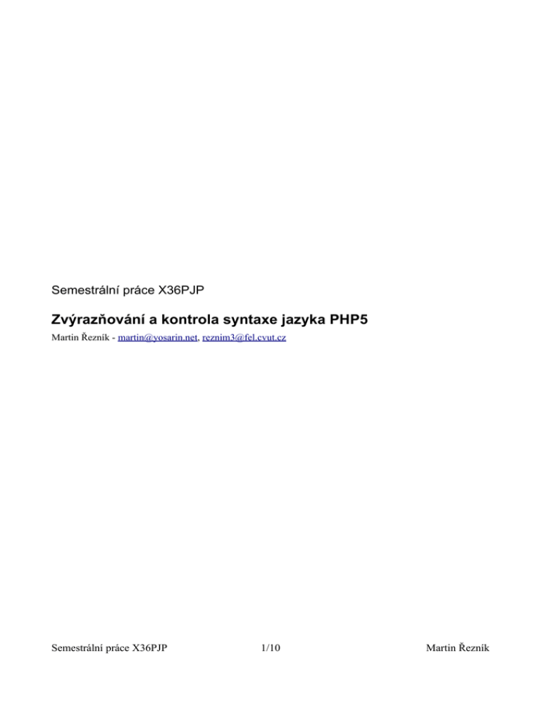 Semestrální práce X36PJP Zvýrazňování a kontrola syntaxe jazyka PHP5 Martin Řezník - [email protected], [email protected] Semestrální práce X36PJP 1/10 Martin Řezník Obsah Zvýrazňování a kontrola syntaxe jazyka PHP5....................................................................................1 Rozbor..................................................................................................................................................3 Gramatika.............................................................................................................................................3 Řešení...................................................................................................................................................9 Lexikální analyzátor........................................................................................................................9 Syntaktický analyzátor.....................................................................................................................9 Rozkladová tabulka.....................................................................................................................9 Závěr...................................................................................................................................................10 Semestrální práce X36PJP 2/10 Martin Řezník Rozbor Program (aplikace napsaná v PHP) na vstupu obdrží skript napsaný v PHP5, provede jeho lexikální rozbor a syntaktickou analýzu. Výstupem je html se zvýrazněnou syntaxí jazyka a seznam všech definovaných funkcí, metod a tříd, včetně odkazů na ně. Gramatika Gramatiku jsem se rozhodl vytvořit co nejkompletnější – netroufám si tvrdit zda pokryla celý jazyk, ale je poměrně obsáhlá. Je možné, že gramatika se bude průběžně ještě měnit (pokud narazím na nějakou chybu), aktuální verze bude dostupná na stránce http://pjp.yosarin.net/gramatika.txt. O rozsáhlosti gramatiky svědčí už to, že má celkem přes 460 pravidel. Pokrývá jak obyčejně psané (procedurální) kódy, tak objektový model (měl by odpovídat PHP5 i PHP4). Symboly psané v gramatice velkými písmeny (a zeleně) jsou terminálními symboly jazyka, symboly začínající dvěmi podtržítky (v červené barvě) jsou výstupními symboly. Zbytek tvoří neterminály. Gramatika je tolik rozsáhlá především proto, že v PHP se liší bloky uvnitř tříd a mimo ně pouze několika maličkostmi – například že uvnitř třídy není možné definovat další třídu. 1. file -> HTML phpCode 2. 3. phpCode -> PHP_OPEN_TAG nextBlock phpCode -> EOI 4. 5. nextBlock -> codeBlock nextBlock nextBlock -> phpEnd 6. 7. 8. phpEnd -> PHP_CLOSE_TAG HTML phpCode phpEnd -> EOI phpEnd -> 9. codeBlock -> OPEN_BLOCK nextCodeInsideBlock CLOSE_BLOCK 10. codeBlock -> expression 11. nextCodeInsideBlock -> codeInsideBlock nextCodeInsideBlock 12. nextCodeInsideBlock -> 13. codeInsideBlock -> OPEN_BLOCK nextCodeInsideBlock CLOSE_BLOCK 14. codeInsideBlock -> expression 15. codeInsideBlock -> PHP_CLOSE_TAG HTML PHP_OPEN_TAG 16. nextElseCodeInsideBlock -> ifExpression nextElseCodeInsideBlock 17. nextElseCodeInsideBlock -> elseExpression elseCodeBlockEnd 18. nextElseCodeInsideBlock -> PHP_CLOSE_TAG HTML PHP_OPEN_TAG elseCodeBlockEnd 19. elseCodeBlockEnd -> nextElseCodeInsideBlock 20. elseCodeBlockEnd -> 21. unsafeExpression -> unfinishedExpression 22. unsafeExpression -> lastExpression 23. expression -> elseExpression 24. expression -> ifExpression 25. ifExpression -> KW_IF OPEN_BRACKET fillLine CLOSE_BRACKET ifBlock 26. elseExpression -> unsafeExpression afterUnsafe 27. elseExpression -> safeExpression 28. afterUnsafe -> expressionEnd 29. 30. 31. 32. 33. 34. 35. 36. 37. 38. safeExpression -> functionDeclaration safeExpression -> classDeclaration safeExpression -> interfaceDeclaration safeExpression -> SEMICOLON safeExpression -> KW_TRY OPEN_BLOCK nextCodeInsideBlock CLOSE_BLOCK KW_CATCH OPEN_BRACKET IDENT VAR CLOSE_BRACKET OPEN_BLOCK nextCodeInsideBlock CLOSE_BLOCK nextCatch safeExpression -> KW_FOR OPEN_BRACKET forList CLOSE_BRACKET forBlock safeExpression -> KW_FOREACH OPEN_BRACKET foreachList CLOSE_BRACKET foreachBlock safeExpression -> KW_SWITCH OPEN_BRACKET fillLine CLOSE_BRACKET switchBlock safeExpression -> KW_WHILE OPEN_BRACKET fillLine CLOSE_BRACKET whileBlock safeExpression -> KW_DECLARE OPEN_BRACKET IDENT ASSIGN constValue nextDeclare CLOSE_BRACKET declareBlock 39. unfinishedExpression -> KW_DO doBlock KW_WHILE OPEN_BRACKET fillLine CLOSE_BRACKET 40. unfinishedExpression -> KW_ECHO fillLine nextEcho 41. unfinishedExpression -> staticAssign 42. nextEcho -> COMMA fillLine nextEcho 43. nextEcho -> 44. nextCatch -> KW_CATCH OPEN_BRACKET IDENT VAR CLOSE_BRACKET OPEN_BLOCK nextCodeInsideBlock CLOSE_BLOCK nextCatch 45. nextCatch -> 46. nextDeclare -> COMMA IDENT ASSIGN constValue nextDeclare Semestrální práce X36PJP 3/10 Martin Řezník 47. nextDeclare -> 48. declareBlock -> expression 49. declareBlock -> OPEN_BLOCK nextCodeInsideBlock CLOSE_BLOCK 50. declareBlock -> COLON nextCodeInsideBlock KW_ENDDECLARE expressionEnd 51. forList -> forParams SEMICOLON line SEMICOLON forParams 52. forParams -> fillLine lineNext 53. forParams -> 54. lineNext -> COMMA fillLine lineNext 55. lineNext -> 56. foreachList -> fillLine KW_AS variable assignKeys 57. forBlock -> expression 58. forBlock -> OPEN_BLOCK nextCodeInsideBlock CLOSE_BLOCK 59. forBlock -> COLON nextCodeInsideBlock KW_ENDFOR 60. foreachBlock -> expression 61. foreachBlock -> OPEN_BLOCK nextCodeInsideBlock CLOSE_BLOCK 62. foreachBlock -> COLON nextCodeInsideBlock KW_ENDFOREACH 63. 64. 65. 66. 67. ifBlock ifBlock ifBlock ifBlock ifBlock -> -> -> -> -> elseExpression nextIf ifExpression OPEN_BLOCK nextCodeInsideBlock CLOSE_BLOCK nextIf ifColonBlock PHP_CLOSE_TAG HTML PHP_OPEN_TAG 68. ifColonBlock -> COLON nextElseCodeInsideBlock nextColonIf 69. elseBlock 