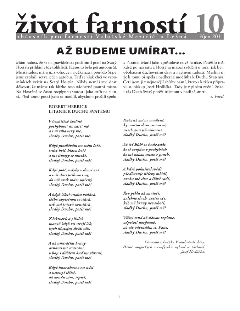 život farností 10 o b č a s n í k p r o f a r n o s t i V a l a š s k é M e z i ř í č í a L e š n á říjen 2011 AŽ BUDEME UMÍRAT... Mám radost, že se na pravidelnou podzimní pouť na Svatý Hostýn přihlásí vždy tolik lidí. (Letos to bylo pět autobusů). Menší radost mám již z toho, že na děkanátní pouť do Štípy jsme zaplnili sotva jeden autobus. Teď se však chci ve vzpomínkách vrátit na Svatý Hostýn. Nikdy nemůžeme dost děkovat, že máme tak blízko toto nádherné poutní místo. Na Hostýně se často rozplynou starosti jako sníh na slunci. Před touto poutí jsem se modlil, abychom prožili spolu s Pannou Marií jako apoštolové nové letnice. Potěšilo mě, když po návratu z Hostýna mnozí svědčili o tom, jak byli obohaceni duchovními dary a naplněni radostí. Myslím si, že k tomu přispěla i nádherná modlitba k Duchu Svatému. Četl jsem ji z nejnovější sbírky básní, kterou k tisku připravil o. biskup Josef Hrdlička. Tady je v plném znění. Snad i vás Duch Svatý potěší nejenom v hodině smrti. o. Pavel ROBERT HERRICK LITANIE K DUCHU SVATÉMU V bezútěšné hodině pochybnost až zdrtí mě a s ní tíha viny mé, sladký Duchu, potěš mě! Kněz až začne modlení, kývnutím dám znamení, neschopen již mluvení, sladký Duchu, potěš mě! Když prodlévám na svém loži, srdce bolí, hlava hoří a mé útrapy se množí, sladký Duchu, potěš mě! Až (ví Bůh) se bude zdát, že si zoufám v pochybách, že mě zkáza smete v prach, sladký Duchu, potěš mě! Když pláč, vzlyky v domě zní a svět dusí příkrov tmy, do níž zrak mám upřený, sladký Duchu, potěš mě! A když pokušitel svádí, předhazuje hříchy mládí, zmást mě chce a lživě radí, sladký Duchu, potěš mě! A když lékař snahu vzdává, léčba zbytečnou se stává, neb má trýzeň neustává, sladký Duchu, potěš mě! Řev pekla až zaútočí, zalehne sluch, zastře oči, kéž mě hrůzy nezaskočí, sladký Duchu, potěš mě! Z lektvarů a pilulek marně když mi strojí lék, bych důstojně dožil věk, sladký Duchu, potěš mě! Věčný soud až slávou vzplane, odpečetí ukrývané, až vše odevzdám ti, Pane, sladký Duchu, potěš mě! A až umíráčku hrany oznámí mé umírání, v boji s ďáblem buď mi zbraní, sladký Duchu, potěš mě! Převzato z knížky V souhvězdí slávy. Básně anglických metafyziků vybral a přeložil Josef Hrdlička. Když knot zhasne na svíci a ustoupí těšící, až zbudu sám, trpící, sladký Duchu, potěš mě! Nový ředitel Charity hoštěm a jeho okolních obcích se nacházejí kromě pečovatelské a ošetřovatelské služby i sociálně aktivizační služby pro seniory. Ve Valašské Bystřici zajišťujeme služby v charitním domě pokojného stáří. Charita Valašské Meziříčí má nového ředitele. V krátkém rozhovoru nám nyní řekne něco málo o sobě a o své nové práci. 5. Co vás čeká v nejbližší době? Nejvýznamnější akcí v současné době je zahájení výstavby nového Centra pro seniory v Rožnově pod Radhoštěm, jejíž povolení se podařilo po dlouhých jednáních vyřídit. Dokončení tohoto centra je plánováno na začátek druhého pololetí roku 2012. Ve Valašské Bystřici probíhá výstavba druhé části Domu pokojného stáří, kde po dokončení bude kapacita 27 – 30 lůžek. Bohužel i v naších službách při dnešní ekonomické situaci hrozí nedostatek financí na jejich zabezpečení. Pevně ale věřím, že společně se svými spolupracovníky udržíme a budeme rozvíjet nastoupenou cestu, směřující ke komplexní péči o potřebné spoluobčany, že to bude péče, ve které se projeví nezbytná odbornost, profesionalita a hlavně naše služby budou vždy poskytovány ve jménu milosrdné lásky. 1. Můžete se našim čtenářům představit? Jmenuji se Jiří Gavenda. Narodil jsem se ve Zlíně, kde také doposud bydlím. Jsem ženatý, mám dva dospělé syny. Po ukončení vysokoškolského studia ekonomického směru jsem pracoval 15 let v různých manažerských funkcích. Deset let jsem podnikal jako OSVČ ve výrobě obuvi. Pak jsem dospěl k závěru, že je nutné udělat nějakou životní změnu a hledat pracovní zaměření v jiné oblasti. 2. Pracoval jste již dříve v Charitě ? Do Charity jsem se dostal právě na základě své touhy po změně. Ve výběrovém řízení jsem byl přijat před dvěma lety do Oblastní charity Uherský Brod na pozici vedoucího služeb osob ohrožených sociálním vyloučením. Byla to nově otevíraná služba, která se budovala od základu a měl jsem možnost nabýt spoustu nových zkušeností. Slovo ž ivot a ř í j e n 2 0 11 „Pojď za mnou!“ (Mt 9, 9) Když Ježíš odcházel z Kafarnaa, uviděl výběrčího daní jménem Matouš, jak sedí v celnici. Matoušovo zaměstnání vzbuzovalo u lidí nenávist a řadilo ho mezi lichváře a ty, kdo se obohacovali na úkor ostatních. Zákoníci a farizeové ho kladli na stejnou rovinu s veřejnými hříšníky a Ježíše vinili z toho, že je „přítel celníků a hříšníků“ a že s nimi jí. Ježíš jde proti všem společenským zvyklostem a zve Matouše, aby ho následoval. Přijímá pozvání na hostinu do Matoušova domu, stejně jako později k Zacheovi, který byl nadřízeným celníků v Jerichu. Když po Ježíšovi žádali, aby své chování vysvětlil, řekl jim, že přišel, aby uzdravoval nemocné, nikoli zdravé, a nepovolával spravedlivé, ale hříšníky. I tentokrát vyzval jednoho z nich: 3. Můžete nám říct něco ke sloučení charit ? Ke sloučení charit v děkanátu došlo k 1.1.2011, kdy byly sloučeny Farní charita Rožnov pod Radhoštěm, Charita Valašská Bystřice a Charita Valašské Meziříčí. Vím, že pro mnoho lidí to byl překvapivý krok. K této otázce bych snad jen poznamenal, že 