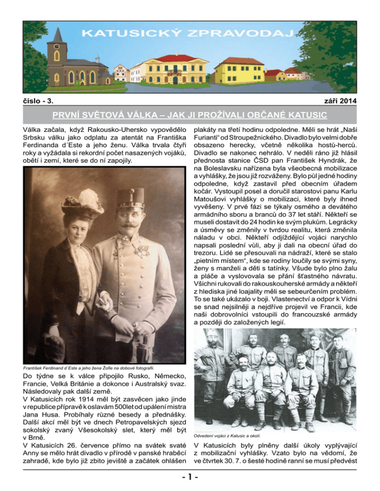 číslo - 3. září 2014 První světová válka – jak ji prožívali občané Katusic Válka začala, když Rakousko-Uhersko vypovědělo Srbsku válku jako odplatu za atentát na Františka Ferdinanda d´Este a jeho ženu. Válka trvala čtyři roky a vyžádala si rekordní počet nasazených vojáků, obětí i zemí, které se do ní zapojily. plakáty na třetí hodinu odpoledne. Měli se hrát „Naši Furianti“ od Stroupežnického. Divadlo bylo velmi dobře obsazeno herecky, včetně několika hostů-herců. Divadlo se nakonec nehrálo. V neděli ráno již hlásil přednosta stanice ČSD pan František Hyndrák, že na Boleslavsku nařízena byla všeobecná mobilizace a vyhlášky, že jsou již rozváženy. Bylo půl jedné hodiny odpoledne, když zastavil před obecním úřadem kočár. Vystoupil posel a doručil starostovi panu Karlu Matoušovi vyhlášky o mobilizaci, které byly ihned vyvěšeny. V prvé fázi se týkaly osmého a devátého armádního sboru a branců do 37 let stáří. Někteří se museli dostavit do 24 hodin ke svým plukům. Legrácky a úsměvy se změnily v tvrdou realitu, která změnila náladu v obci. Někteří odjíždějící vojáci narychlo napsali poslední vůli, aby ji dali na obecní úřad do trezoru. Lidé se přesouvali na nádraží, které se stalo „pietním místem“, kde se rodiny loučily se svými syny, ženy s manželi a děti s tatínky. Všude bylo plno žalu a pláče a vyslovovala se přání šťastného návratu. Všichni rukovali do rakouskouherské armády a někteří z hlediska jiné loajality měli se sebeurčením problém. To se také ukázalo v boji. Vlastenectví a odpor k Vídni se snad nejsilněji a nejdříve projevil ve Francii, kde naši dobrovolníci vstoupili do francouzské armády a později do založených legií. František Ferdinand d´Este a jeho žena Žofie na dobové fotografii. Do týdne se k válce připojilo Rusko, Německo, Francie, Velká Británie a dokonce i Australský svaz. Následovaly pak další země. V Katusicích rok 1914 měl být zasvěcen jako jinde v republice přípravě k oslavám 500let od upálení mistra Jana Husa. Probíhaly různé besedy a přednášky. Další akcí měl být ve dnech Petropavelských sjezd sokolský zvaný Všesokolský slet, který měl být v Brně. V Katusicích 26. července přímo na svátek svaté Anny se mělo hrát divadlo v přírodě v panské hraběcí zahradě, kde bylo již zbito jeviště a začátek ohlášen Odvedení vojáci z Katusic a okolí. V Katusicích byly plněny další úkoly vyplývající z mobilizační vyhlášky. Vzato bylo na vědomí, že ve čtvrtek 30. 7. o šesté hodině ranní se musí předvést -1- všechno koňstvo. Z Katusic vyjeli v noci v 1.30 hod. všechny koně, aby byli v 6,00 hod. v Mnichově Hradišti, kde si zástupci armády vybírali vhodné koně. Z Katusic bylo vybráno 18 koní a majitelé obdrželi certifikát od vojenské zprávy včetně odhadní ceny, která byla vyplacena do šesti týdnů. sena a krmné slámy. U prasat se prováděla pastva s doplňkem jádra a brambor. Rovněž u skotu byla doporučována pastva s doplňkem sena a krmné slámy. Jadrná krmiva se dávala minimálně a musela být v souladu s produkcí mléka, dle předpisovaných tabulek. U drůbeže se nesmělo krmit zrním, nebo jí dávat chleboviny. A takto vybraní koně končili. Když byla vypovězena válka, nastala panika mezi lidmi. Mluvilo se, že nebude co jíst a mlýny, že budou mlít pro armádu. Nastala nákupní horečka, čehož využívali lichváři a vláda musela provádět opatření, jako vydání ceníku potravin, který se nesměl překročit. Problémy byly při nákupu soli, cukru, koření a dalších komodit. Nejvíce obav bylo před nakažlivými nemocemi. Na obcích byly zřízeny zdravotní komise. Do komise u nás byli zvoleni: předsedou Karel Matouš, členy V. Šimonek, J. Lukavec, V. Goldbach a J. Hofman. Hned v neděli 30. srpna byla provedena důkladná zdravotní prohlídka spojená s prohlídkou požární, kterou prováděl pan J. Egrt a J. Drbohlav. K zabezpečení hygieny musely být v určené době vyvezeny záchodové jímky a i v domácnostech se našly neuvěřitelné nepořádky a nečistota. Toto muselo být odstraněno do osmi dnů a také se to důsledně dodrželo. Protože byla válka, přísnost a pořádek se vyžadoval i na vesnicích. Operace v polních podmínkách rok 1916. Dopis ze zajetí adresovaný do Katusic. V rostlinné výrobě bylo nařízeno snížit výsevní množství při setí a obiloviny potom pohnojit dusíkem, aby se zvýšilo odnožování. Doporučovalo se pěstovat třeba krmnou řepu a mák, obiloviny s podsevy víceletých pícnin a jiné kombinace. CK ministerstva vnitra vydalo spis tištěný na osmi stránkách, jak šetřit s moukou a potravinami. Doporučovalo se míchání mouky pšeničné a žitné s jinými moukami. Dále používat kukuřičnou mouku, krupici a bramborové těsto, ječnou mouku a další kombinace. Ve spise byly návody a recepty různých jídel, které splňovaly tyto požadavky. Byla to například „polenta“ – jídlo z kukuřičné krupice, rýžové krupice a dále pokrmy z bramborové mouky, nebo použití mouky vymílané na maximum. Toto jsou jen některá opatření doporučovaných úspor. Vojenské cvičení - vojáci při nabíjení 30,5cm hmoždíře. Na obecní úřady chodily příkazy a výzvy s cílem nabádání a šetření s potravinami a krmivy, aby se zabránilo hladomoru. U zvířat bylo doporučováno a většinou se to dodržovalo. U koní nejprve byla dávka 3kg ovsa, ale brzy byla snížena na 1kg s doplňkem Protože bylo nedostatek železa na výrobu zbraní, organizovala se válečná sbírka kovů. Sbírky zajišťovali žáci a žákyně všech škol i katusické, která byla za sběr pochválena. Dále tyto kovy sbírali hasiči, myslivci a obecní úřady. -2- z