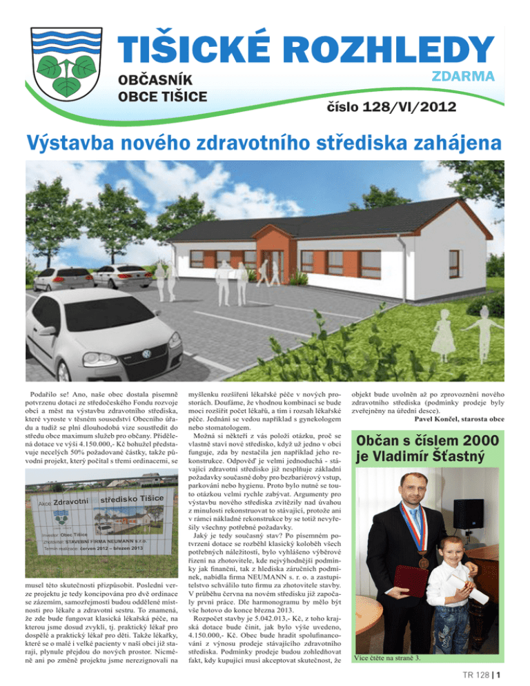 číslo 128/VI/2012 Výstavba nového zdravotního střediska zahájena Podařilo se! Ano, naše obec dostala písemně potvrzenu dotaci ze středočeského Fondu rozvoje obcí a měst na výstavbu zdravotního střediska, které vyroste v těsném sousedství Obecního úřadu a tudíž se plní dlouhodobá vize soustředit do středu obce maximum služeb pro občany. Přidělená dotace ve výši 4.150.000,- Kč bohužel představuje necelých 50% požadované částky, takže původní projekt, který počítal s třemi ordinacemi, se musel této skutečnosti přizpůsobit. Poslední verze projektu je tedy koncipována pro dvě ordinace se zázemím, samozřejmostí budou oddělené místnosti pro lékaře a zdravotní sestru. To znamená, že zde bude fungovat klasická lékařská péče, na kterou jsme dosud zvyklí, tj. praktický lékař pro dospělé a praktický lékař pro děti. Takže lékařky, které se o malé i velké pacienty v naší obci již starají, plynule přejdou do nových prostor. Nicméně ani po změně projektu jsme nerezignovali na myšlenku rozšíření lékařské péče v nových prostorách. Doufáme, že vhodnou kombinací se bude moci rozšířit počet lékařů, a tím i rozsah lékařské péče. Jednání se vedou například s gynekologem nebo stomatologem. Možná si někteří z vás položí otázku, proč se vlastně staví nové středisko, když už jedno v obci funguje, zda by nestačila jen například jeho rekonstrukce. Odpověď je velmi jednoduchá - stávající zdravotní středisko již nesplňuje základní požadavky současné doby pro bezbariérový vstup, parkování nebo hygienu. Proto bylo nutné se touto otázkou velmi rychle zabývat. Argumenty pro výstavbu nového střediska zvítězily nad úvahou z minulosti rekonstruovat to stávající, protože ani v rámci nákladné rekonstrukce by se totiž nevyřešily všechny potřebné požadavky. Jaký je tedy současný stav? Po písemném potvrzení dotace se rozběhl klasický koloběh všech potřebných náležitostí, bylo vyhlášeno výběrové řízení na zhotovitele, kde nejvýhodnější podmínky jak finanční, tak z hlediska záručních podmínek, nabídla firma NEUMANN s. r. o. a zastupitelstvo schválilo tuto firmu za zhotovitele stavby. V průběhu června na novém středisku již započaly první práce. Dle harmonogramu by mělo být vše hotovo do konce března 2013. Rozpočet stavby je 5.042.013,- Kč, z toho krajská dotace bude činit, jak bylo výše uvedeno, 4.150.000,- Kč. Obec bude hradit spolufinancování z výnosu prodeje stávajícího zdravotního střediska. Podmínky prodeje budou zohledňovat fakt, kdy kupující musí akceptovat skutečnost, že objekt bude uvolněn až po zprovoznění nového zdravotního střediska (podmínky prodeje byly zveřejněny na úřední desce). Pavel Končel, starosta obce Občan s číslem 2000 je Vladimír Šťastný Více čtěte na straně 3. TR 128 1 ZPRÁVY Z OZ 22. května 2012 OZ schválilo • za delegáta na valnou hromadu Vodáren Kladno – Mělník a. s. starostu obce Pavla Končela, na místa náhradníků Tomáše Hrodka a Libora Lesáka • přijetí dotace ze středočeského Fondu rozvoje obcí a měst ve výši 4.150.000,- Kč na výstavbu zdravotního střediska a podmínky smlouvy • za zhotovitele zdravotního střediska stavební firmu NEUMANN s. r. o. • celoroční hospodaření obce a závěrečný účet obce za rok 2011, jeho součástí je Zpráva o přezkoumání hospodaření obce za rok 2011 s výsledkem BEZ VÝHRAD • navýšení kapacity ZŠ Tišice ze 120 na 140 žáků • Rozpočtové opatření č. 1 • vydání OZV č. 1/2012 o stanovení systému shromažďování, sběru, přepravy, třídění, využívání a odstraňování komunálních odpadů a nakládání se stavebním odpadem na území obce Tišice • bezúplatný převod pozemku p. č. 583/42 v k.ú. Chrást u Tišic o výměře 27 m², ostatní plocha, ostatní komunikace do majetku obce TIKANAS Změny pokračují Jak jsme již informovali v minulém čísle TR, probíhají postupně další změny v rámci společnosti TIKANAS s. r. o., která se stará o provozování kanalizace v obci. Od prvního června rozšířil řady jejích pracovníků Ladislav Novák, který převzal část úkolů po Petru Brodském. Pokud tedy potřebujete cokoliv řešit v souvislosti s vaší kanalizací, uvádíme kontakty na jednotlivé pracovníky i oblasti, které řeší: Ladislav Novák – 777 303 578 nové přípojky, kontrola přípojek při výstavbě před zasypáním Bořek Hlaváček – 602 875 539 hlášení poruch na jednotlivých šachtách PhDr. Olga Janoušková – 731 618 362 nové smlouvy o připojení, případně vše, co potřebujete a nevíte přesně na koho se obrátit Poplatky za právo využívat kanalizaci se hradí u Magdy Bělochové na OÚ v úředních hodinách, stejně tak se zde hlásí případné změny v Příloze č. 3 Smlouvy o připojení na veřejnou kanalizaci (čestné prohlášení o počtu osob). TIKANAS s. r. o. DROBNÉ ZPRÁVY Z OÚ Práce na zateplení budovy Základní školy zahájeny Zateplení budovy Základní školy Tišice, včetně výměny oken, je vzhledem k její rozloze a členitosti akce náročná. Dodavatelská firma Šnajdr stavby Mělník s. r. o., která byla vybrána na základě výběrového řízení, se zavázala celou akci realizovat v co nejkratším termínu tak, aby nebyla narušena školní výuka. Zahájilo se v červnu, o letních prázdninách budou probíhat práce v interiéru budovy a od září, kdy bude zahájena výuka, se bude pracovat na zateplení budovy. Akce má být dle harmonogramu dokončena v říjnu 2012. Celkové náklady jsou spočítány na částku 3.590.000 Kč, z toho spolufinancování obce bude ve výši 1.803.000 Kč a zbytek bude hrazen z dotace ze Státního fondu životního prostředí ČR a Evropské uni