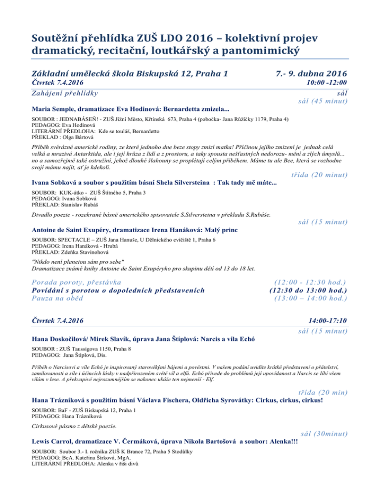 Soutěžní přehlídka ZUŠ LDO 2016 – kolektivní projev dramatický, recitační, loutkářský a pantomimický Základní umělecká škola Biskupská 12, Praha 1 7.- 9. dubna 2016 Čtvrtek 7.4.2016 Zahájení přehlídky 10:00 -12:00 sál sál (45 minut) Maria Semple, dramatizace Eva Hodinová: Bernardetta zmizela... SOUBOR : JEDNABÁSEŇ! - ZUŠ Jižní Město, Křtinská 673, Praha 4 (pobočka- Jana Růžičky 1179, Praha 4) PEDAGOG: Eva Hodinová LITERÁRNÍ PŘEDLOHA: Kde se touláš, Bernardetto PŘEKLAD : Olga Bártová Příběh svérázné americké rodiny, ze které jednoho dne beze stopy zmizí matka! Příčinou jejího zmizení je jednak celá velká a mrazivá Antarktida, ale i její hrůza z lidí a z prostoru, a taky spousta nešťastných nedorozu- mění a zlých úmyslů... no a samozřejmě také ostružiní, jehož dlouhé šlahouny se proplétají celým příběhem. Máme tu ale Bee, která se rozhodne svojí mámu najít, ať je kdekoli. třída (20 minut) Ivana Sobková a soubor s použitím básní Shela Silversteina : Tak tady mě máte... SOUBOR: KUK-átko - ZUŠ Štítného 5, Praha 3 PEDAGOG: Ivana Sobková PŘEKLAD: Stanislav Rubáš Divadlo poezie - rozehrané básně amerického spisovatele S.Silversteina v překladu S.Rubáše. sál (15 minut) Antoine de Saint Exupéry, dramatizace Irena Hanáková: Malý princ SOUBOR: SPECTACLE – ZUŠ Jana Hanuše, U Dělnického cvičiště 1, Praha 6 PEDAGOG: Irena Hanáková - Hrubá PŘEKLAD: Zdeňka Stavinohová "Nikdo není planetou sám pro sebe" Dramatizace známé knihy Antoine de Saint Exupéryho pro skupinu dětí od 13 do 18 let. Porada poroty, přestávka Povídání s porotou o dopoledních představeních Pauza na oběd (12:00 - 12:30 hod.) (12:30 do 13:00 hod.) (13:00 – 14:00 hod.) Čtvrtek 7.4.2016 14:00-17:10 sál (15 minut) Hana Doskočilová/ Mirek Slavík, úprava Jana Štíplová: Narcis a víla Echó SOUBOR : ZUŠ Taussigova 1150, Praha 8 PEDAGOG: Jana Štíplová, Dis. Příběh o Narcisovi a víle Echó je inspirovaný starověkými bájemi a pověstmi. V našem podání uvidíte krátké představení o přátelství, zamilovanosti a síle i účincích lásky v nadpřirozeném světě víl a elfů. Echó přivede do problémů její upovídanost a Narcis se líbí všem vílám v lese. A překvapivě nejrozumnějším se nakonec ukáže ten nejmenší - Elf. třída (20 min) Hana Trázníková s použitím básní Václava Fischera, Oldřicha Syrovátky: Cirkus, cirkus, cirkus! SOUBOR: BaF - ZUŠ Biskupská 12, Praha 1 PEDAGOG: Hana Trázníková Cirkusové pásmo z dětské poezie. sál (30minut) Lewis Carrol, dramatizace V. Čermáková, úprava Nikola Bartošová a soubor: Alenka!!! SOUBOR: Soubor 3.- I. ročníku ZUŠ K Brance 72, Praha 5 Stodůlky PEDAGOG: BcA. Kateřina Šírková, MgA. LITERÁRNÍ PŘEDLOHA: Alenka v říši divů PŘEKLAD: Alois a Hana Skoumalovi SCÉNOGRAFIE: N. Bartošová, J. Peštová Inscenace Alenka!!! vzniká na motivy knížky L. Carolla Alenka v říši divů. Jedná se o společný projekt ZUŠ Praha 5 Stodůlky ve šk. roce 2015/2016 literárně-dramatického, výtvarného a tanečního oboru. Všechny tři obory spojuje stejný inspirační zdroj. Své počiny odprezentují na závěrečném vystoupení LDO 16.6. 2016. Inscenace vzniká velmi volně na motivy knihy. Společně hledáme, jaká témata jsou nám blízká a jaké možnosti zpracování nabízí. Alenka se ocitá na hraně dětství a dospělosti. Rapujeme, tančíme, hrajeme. Přestávka, porada poroty (30 minut) třída (15 minut) Josef Lada, dramatizace Věra Dřevíkovská: O statečné princezně SOUBOR: ZUŠ Trhanovské náměstí 8, Praha 10, Hostivař PEDAGOG: Věra Dřevíkovská SCÉNOGRAFIE: Věra Dřevíkovská I v pekle může dojít k omylu a mezi čerty se octne Honza - nejčistší duše na světě. Statečná princezna Máňa se rozhodne, že to tak nenechá a Honzu z pekla vysvobodí. Loutková pohádka je určena dětem z mateřských škol. sál (10 minut) Josef Mlejnek, úprava N. Bartošová a žáci: Datel a bubeníček SOUBOR: Soubor 2. a 3. ročníku ZUŠ K Brance 72, Praha 5 Stodůlky PEDAGOG: BcA. Kateřina Šírková, MgA. HUDBA: Petr Balhar Datel a bubeníček je inscenace opřená o stejnojmenný scénář J. Mlejna (z knihy "Dětská tvořivá hra"). V inscenaci je podpořena práce žáků s rytmem. Hlavním tématem je vytvoření přátelství mezi zdánlivě rozdílnými jedinci datlem a bubeníčkem, které však spojuje společná láska k hudbě, konkrétně pak k bubnování. Jedná se o společnou práci žáků 2. a 3. ročníku. Žáci se na této práci (mimo jiného) učili střídání dvou herních plánů, vzájemné předávání pozornosti (upřednostnění a upozadění v rámci dané situace). třída (40 minut) Nepochopení s použitím básní Jacquese Préverta: Jacques Prévert SOUBOR: Nepochopení - ZUŠ I. Hurníka, Slezská 21, Praha 2 PEDAGOG: Petr Pochop Předloha: Trojhvězdí Překlad: Skarlant a J. Žáček Hudba: Noemi Jonssonová, Jacques Brell Scénická koláž sestavená z básní Jacquese Préverta i vlastních textů inspirovaných touto osobností, plná obrazů a názorů jejich interpretů. Přestávka, porada poroty Povídání s porotou o odpoledních představeních Pátek 12.4.2016 (18:00 do 19:00 hod.) 9:00-12:00 třída (25 minut) Soubor s použitím básní Jiřího Weinbergera: Povídá pondělí úterku SOUBOR: ZUŠ Lounských 4/l29, Praha 4 - Nusle PEDAGOG: Mgr. Yvona Jelénková Povídá pondělí úterku je textově pohybová koláž s použitím veršů Jiřího Weinbergra. Na začátku bylo lano jako rekvizita a stejnojmenná knížka. Co nám z toho vzniklo, uvidíte sami. sál (30 minut) Pierre Gripari, dramatizace Hana Trázníková: Když v kumbálu straší... SOUBOR: BaF – ZUŠ Biskupská 12, Praha 1 PEDAGOG: Hana Trázníková LITERÁRNÍ PŘEDLOHA: Čarodějnice z kumbálu PŘEKLAD: R. Ste