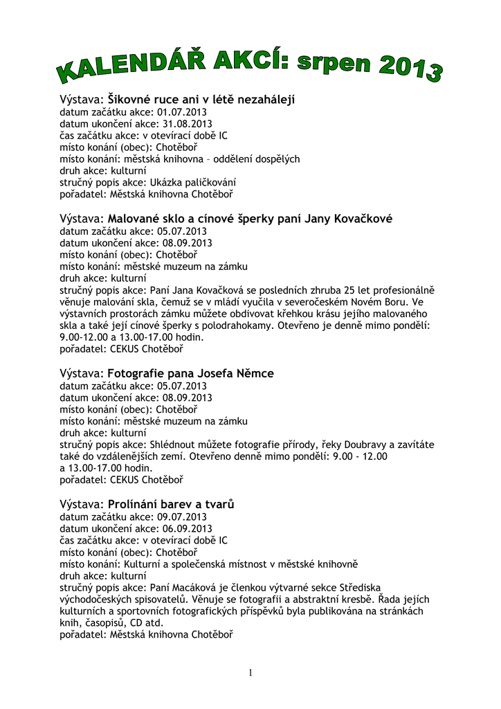 Výstava: Šikovné ruce ani v létě nezahálejí datum začátku akce: 01.07.2013 datum ukončení akce: 31.08.2013 čas začátku akce: v otevírací době IC místo konání (obec): Chotěboř místo konání: městská knihovna – oddělení dospělých druh akce: kulturní stručný popis akce: Ukázka paličkování pořadatel: Městská knihovna Chotěboř Výstava: Malované sklo a cínové šperky paní Jany Kovačkové datum začátku akce: 05.07.2013 datum ukončení akce: 08.09.2013 místo konání (obec): Chotěboř místo konání: městské muzeum na zámku druh akce: kulturní stručný popis akce: Paní Jana Kovačková se posledních zhruba 25 let profesionálně věnuje malování skla, čemuž se v mládí vyučila v severočeském Novém Boru. Ve výstavních prostorách zámku můžete obdivovat křehkou krásu jejího malovaného skla a také její cínové šperky s polodrahokamy. Otevřeno je denně mimo pondělí: 9.00-12.00 a 13.00-17.00 hodin. pořadatel: CEKUS Chotěboř Výstava: Fotografie pana Josefa Němce datum začátku akce: 05.07.2013 datum ukončení akce: 08.09.2013 místo konání (obec): Chotěboř místo konání: městské muzeum na zámku druh akce: kulturní stručný popis akce: Shlédnout můžete fotografie přírody, řeky Doubravy a zavítáte také do vzdálenějších zemí. Otevřeno denně mimo pondělí: 9.00 - 12.00 a 13.00-17.00 hodin. pořadatel: CEKUS Chotěboř Výstava: Prolínání barev a tvarů datum začátku akce: 09.07.2013 datum ukončení akce: 06.09.2013 čas začátku akce: v otevírací době IC místo konání (obec): Chotěboř místo konání: Kulturní a společenská místnost v městské knihovně druh akce: kulturní stručný popis akce: Paní Macáková je členkou výtvarné sekce Střediska východočeských spisovatelů. Věnuje se fotografii a abstraktní kresbě. Řada jejích kulturních a sportovních fotografických příspěvků byla publikována na stránkách knih, časopisů, CD atd. pořadatel: Městská knihovna Chotěboř 1 Vysočanka datum začátku akce: 03.08.2013 místo konání (obec): Habry místo konání: letní parket druh akce: kulturní stručný popis akce: dechovka pořadatel: SDH Habry Taneční zábava datum začátku akce: 03.08.2013 místo konání (obec): Sedletín místo konání: letní parket druh akce: ostatní stručný popis akce: hraje BARON BEAT pořadatel: SDH Sedletín - Veselá Taneční zábava – New Titan, Šatlava datum začátku akce: 10.08.2013 čas začátku akce: 20:00 hod. místo konání (obec): Chotěboř místo konání: aréna Chotěboř druh akce: ostatní Vstupné: předprodej IC Chotěboř (tel. 569 626 634) 90 Kč – v otevírací době infocentra!, na místě 120 Kč, držitelé abonentních průkazů ZDARMA. Občerstvení: prase na rožni, pivo… pořadatel: CEKUS Chotěboř Pohár starosty města v požárním útoku - XVII. ročník datum začátku akce: 10.08.2013 čas začátku akce: 13:00 hod. místo konání (obec): Habry místo konání: náměstí druh akce: sportovní stručný popis akce: Hasičská soutěž. Prezentace od 11 hodin. pořadatel: SDH Habry STARÝ KLÁDY datum začátku akce: 10.08.2013 místo konání (obec): Habry místo konání: letní parket druh akce: ostatní pořadatel: SDH Habry Kulturní odpoledne na zámku ve Vilémově 2 datum začátku akce: 17.08.2013 čas začátku akce: 14:00 hod. místo konání (obec): Vilémov místo konání: zámek druh akce: kulturní stručný popis akce: Program: Ve 14 hodin se otevře brána, návštěvníci si budou moci prohlédnout zámek, nahlédnout do zámeckých pokojů a posedět v knihovně nebo se projít po zámecké zahradě. V 16 hodin začne vyprávění cestovatelů, manželů Novákových, o putování jihoasijskou zemí Barma (s bohatým fotogafickým materiálem). V 19 hodin se uzavře vstup do zámku a do zahrady. Ve 21 hodin začne promítání filmu v letním kině na nádvoří zámku. pořadatel: www.vilemov.info WALDAGANG + ALEŠ BRICHTA datum začátku akce: 17.08.2013 čas začátku akce: 21:00 hod. místo konání (obec): Golčův Jeníkov místo konání: Klub Vagón - letní parket druh akce: ostatní stručný popis akce: Exkluzívní dvojkoncert, předkapela Soustrast. Vstupné v předprodeji 250 Kč. Pořadatel: www.klubvagon.cz Robbie Williams: Take The Crown Tour 2013 datum začátku akce: 20.08.2013 čas začátku akce: 20:00 hod. místo konání (obec): Chotěboř místo konání: kinosál druh akce: kulturní stručný popis akce: Živý přenos z předposlední zastávky na turné Robbieho Williamse po evropských stadionech. Show bude ŽIVĚ přenášena v úchvatném 2D HD rozlišení a s jedinečnou zvukovou kvalitou Dolby Surround z estonského Tallinu. Již od 19:50 hodin můžete nahlédnout do zákulisí koncertu!!! Spolu s nadupaným playlistem, jehož součástí jsou některé z Robbieho aktuálních hitů stejně jako jeho největší sólové pecky či vybrané tracky z dob jeho spolupráce se skupinou Take That, přinese tenhle rozený showman 100 minut nefalšované zábavy pro velké plátno. První recenze z počáteční etapy turné vesměs velebily propracovanou výpravu a Robbieho přesvědčivý výkon. Britský The Sun označil zpěváka za „nejlepšího showmana v branži“ a koncert za „velkolepou, našlapanou show“. Produkce se ujala společnost Done and Dusted, jež se podílela na několika předních světových velkolepých produkčních počinech, včetně Zahajovací ceremonie olympijských her v Londýně v roce 2012, koncertu Coldplay v Barceloně, Adele v Royal Albert Hall, Rolling Stones Biggest Bang Tour a Knebworth Robbieho Williamse. Předprodej vstupenek IC Chotěboř (tel. 569 626 634) 220 Kč – pouze v otevírací době infocentra! pořadatel: CEKUS Chotěboř 3 Letní kino datum začátku akce: 22.08.2013 čas začátku akce: 21:00 hod. místo konání (obec): Habry místo konání: parket