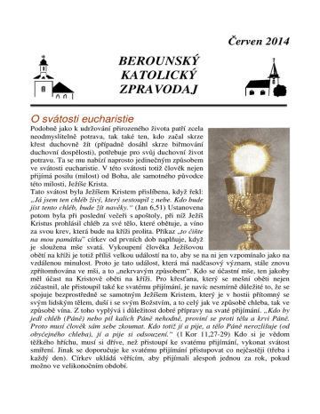 Červen 2014 BEROUNSKÝ KATOLICKÝ ZPRAVODAJ O svátosti eucharistie Podobně jako k udržování přirozeného života patří zcela neodmyslitelně potrava, tak také ten, kdo začal skrze křest duchovně žít (případně dosáhl skrze biřmování duchovní dospělosti), potřebuje pro svůj duchovní život potravu. Ta se mu nabízí naprosto jedinečným způsobem ve svátosti eucharistie. V této svátosti totiž člověk nejen přijímá posilu (milost) od Boha, ale samotného původce této milosti, Ježíše Krista. Tato svátost byla Ježíšem Kristem přislíbena, když řekl: „Já jsem ten chléb živý, který sestoupil z nebe. Kdo bude jíst tento chléb, bude žít navěky.“ (Jan 6,51) Ustanovena potom byla při poslední večeři s apoštoly, při níž Ježíš Kristus prohlásil chléb za své tělo, které obětuje, a víno za svou krev, která bude na kříži prolita. Příkaz „to čiňte na mou památku” církev od prvních dob naplňuje, když je sloužena mše svatá. Vykoupení člověka Ježíšovou obětí na kříži je totiž příliš velkou událostí na to, aby se na ni jen vzpomínalo jako na vzdálenou minulost. Proto je tato událost, která má nadčasový význam, stále znovu zpřítomňována ve mši, a to „nekrvavým způsobem“. Kdo se účastní mše, ten jakoby měl účast na Kristově oběti na kříži. Pro křesťana, který se mešní oběti nejen zúčastnil, ale přistoupil také ke svatému přijímání, je navíc nesmírně důležité to, že se spojuje bezprostředně se samotným Ježíšem Kristem, který je v hostii přítomný se svým lidským tělem, duší i se svým Božstvím, a to celý jak ve způsobě chleba, tak ve způsobě vína. Z toho vyplývá i důležitost dobré přípravy na svaté přijímání. „Kdo by jedl chléb (Páně) nebo pil kalich Páně nehodně, proviní se proti tělu a krvi Páně. Proto musí člověk sám sebe zkoumat. Kdo totiž jí a pije, a tělo Páně nerozlišuje (od obyčejného chleba), jí a pije si odsouzení.“ (1 Kor 11,27-29) Kdo si je vědom těžkého hříchu, musí si dříve, než přistoupí ke svatému přijímání, vykonat svátost smíření. Jinak se doporučuje ke svatému přijímání přistupovat co nejčastěji (třeba i každý den). Církev ukládá věřícím, aby přijímali alespoň jednou za rok, pokud možno ve velikonočním období. Kristova přítomnost ve svátosti trvá, dokud jsou způsoby chleba a vína neporušené. Přijímající se tedy po určitou dobu stává „živým svatostánkem“ a měl by nejméně několik minut setrvat v díkůčinění. Přijímáním vzrůstá naše důvěrné spojení s Ježíšem Kristem: „Kdo jí mé těla pije mou krev, zůstává ve mně a já v něm.” (Jan 6,56) Člověk se tak mimoděk stále více připodobňuje Kristu, s nímž se v eucharistii setkává. Přijímání nás také očišťuje od našich špatných náklonností, zahlazuje lehké hříchy a chrání nás před hříchem těžkým. Eucharistie je také poutem jednoty církve, protože přijímající zde jedí z jednoho jediného chleba, kterým je sám Ježíš Kristus: „Protože je to jeden chléb, tvoříme jedno tělo, i když je nás mnoho, neboť všichni máme účast na jednom chlebě.“ (1 Kor 10,17) Víru v přítomnost Krista v eucharistii a úctu k němu se velmi doporučuje rozvíjet skrze tichou modlitbu před svatostánkem a adoraci před vystavenou Nejsvětější svátostí. Mši svatou může sloužit platně vysvěcený biskup nebo kněz. Tam, kde je narušena posloupnost svěcení, která má vést až k apoštolům, nelze hovořit o mši svaté nebo o platném proměnění chleba a vína v tělo a krev Krista. pb Zprávy z farnosti • Biblické hodiny pokračují na faře každé úterý od 16.30 do 17.30 hodin. Věnujeme se knize proroka Ámosa. Všichni jsou srdečně zváni. • Tichá adorace po večerní mši svaté se koná každé úterý. Nejsvětější svátost bývá vystavena 20 min. • Příprava dospělých ke křtu se koná každou středu od 18.00 do 19.00 hodin na faře. • Společenství mládeže se setkává každý čtvrtek od 19 do 20 hodin. Vede Ivana Vašků. • Modlitební společenství Modlitební setkání se konají ve čtvrtek od 20 hodin, a to: o 2. čtvrtek v měsíci – modlitba Taizé v Berouně v kapli Povýšení sv. kříže o 4. čtvrtek v měsíci – na Tetíně u sv. Kateřiny (adorace) a poté na faře • Kurzy Beta probíhají každý 1. a 3. čtvrtek v měsíci od 19.30 do 21.00 na faře v Berouně. • Úklid kostela sv. Jakuba se koná ve čtvrtek 5. 6. od 18 hod. Prosíme ochotné farníky o pomoc. • První pátek v měsíci V pátek 6. června následuje po mši sv. v kostele sv. Jakuba (v 18 hod.) obvyklá adorace; od 17.00 hodin je možné přijmout svátost smíření. 2 • Slavnost Seslání Ducha svatého – 8. června O slavnosti Seslání Ducha sv. je v Berouně po dopolední mši sv. plánováno malé agapé. Všichni jsou srdečně zváni, něco dobrého na zub vítáno. • Koncert Jaroslava Svěceného a Markéty Mátlové se koná v neděli 8. června od 16 hod. ve Svatém Janu pod Skalou. Zazní skladby A. Vivaldiho, G. F. Händela, W. A. Mozarta a dalších. • Zpívání na Tetíně Skupina děvčat bude zpívat při mši sv. na Tetíně od 11.15 v neděli 8. června. Zkouška začne v 10.30 na faře. Na všechny se těší Alena Vacková. • Benefiční koncert v Počaplech – 13. 6. V pátek 13. června od 19 hod. se v kostele Nanebevzetí Panny Marie v Králově Dvoře uskuteční koncert Hornického pěveckého sboru Kladno pod vedením prof. Romana Makaria. Výtěžek bude věnován na opravu a znovuosazení kříže na kostele. Koncert se uskuteční za podpory města Králův Dvůr. • Modlitební večer se zpěvy z Taizé v kapli Povýšení sv. kříže se bude konat ve čtvrtek 12. června od 20 hodin. • Výtvarn