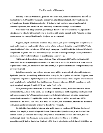 The University of Plymouth Jmenuji se Lukáš Widomski, je mi 19 let a tento rok jsem udělal maturitu na SPŠ EI Kratochvílova 7. Označil bych se jako průměrný, cílevědomý student, který vzal osud do svých rukou a dneska již tuto práci píše v UK, konkrétně v přístavním, slunném městě jménem Plymouth, kde začátkem září nastupuji ke studiu na zdejší vysoké škole. Nehodlám vám zde popisovat, jak těžké je dostat se na vysokou školu v Anglii anebo vám jmenovat věci, kvůli kterým byste tu jezdit neměli anebo naopak měli. Pokusím se vám pouze popsat to, co se přihodilo mě a jak jsem na to reagoval. Nejprve, abych vás trochu uvedl do děje, popíšu, jak jsem vlastně přišel k myšlence, že bych mohl studovat v zahraničí. Vše to začalo někdy ke konci školního roku 2008/09. Tehdy jsem chodil do třetího ročníku na SPŠei, když jsem poprvé uviděl nabídku jednoměsíční stáže v Plymouth. Zájem o tuto stáž moc velký nebyl. Pokud si dobře pamatuju, tak se přihlásilo 8 studentů, ze kterých byli vybrání 4, mezi kterými jsem byl i já. Stáž trvala jeden měsíc, a to na přelomu října a listopadu 2009. Již před touto stáží jsem věděl, že zde je vynikající univerzita, ale naskytla se mi skvělá příležitost k tomu, abych se přesvědčil o tom, jak moc dobrá tato univerzita je. V průběhu stáže zde totiž probíhaly dny otevřených dveří. Začal jsem se tedy více zajímat o to, co mám udělat pro to, abych zde mohl studovat. Zpočátku jsem byl jen zvědavý a říkal si něco ve smyslu, že za pokus nic nedám. Nejprve jsem se zajímal o angličtinu. Zjišťoval jsem si na univerzitě informace o tom, na jaké úrovni musím umět anglicky, aby mě přijali. Dozvěděl jsem se, že uznávají pouze IELTS zkoušky a v nich bych musel mít alespoň 7 bodů (FCE za 1 nebo CAE za 3). Dále jsem se ptal na maturitu. Všude na internetu uvádějí, kolik bodů musíte mít ze státní maturity, A-level testu apod., ale nikde jsem nenašel, za kolik nejhůře potřebuji udělat naši „starou maturitu“. Nakonec jsem se dozvěděl, že tuto informaci mi může poskytnout pouze daná univerzita. Pro přijetí ke studiu jsem potřeboval udělat maturitu na 68%. Počítáme-li 1 za 100%, 2 za 75%, 3 za 50% a 4 za 25%, tak ze známek, které mi na maturitu vyšly, jsem udělal aritmetický průměr a dostal svůj výsledek. Co dále člověk potřebuje k tomu, aby mohl studovat v zahraničí? Peníze. Je obecně známo, že v Anglii je poměrně vysoké školné. Momentálně jeho hranice je na zhruba 3300 librách za rok (za klasické univerzity). Díky tomu, že se školné zavedlo už i u nás, tak vás nepřekvapí, když vám řeknu, že máte možnost dostat úvěr. Zde je to trošičku komplikovanější kolem školného. Studenti z UK dostávají od státu ročně dotaci 3000 liber na školné a dalších 300 liber od města, takže se dá říct, že neplatí nic (v závislosti na ročním příjmu rodičů). Pro ty, kteří nesplňují podmínky pro to, aby dostali tyto příspěvky (minimální roční příjem rodiny, apod.) a pro studenty ze zahraničí je zde však možnost půjčky. Tato půjčka (úvěr) každý rok, při započetí školního roku, za vás zaplatí školné na daný rok. Splácení této půjčky je zde řešeno až po ukončení studia a to pouze v případě, že váš roční příjem je vyšší než minimum stanovené státem. Je zde pak ještě mnoho upřesnění pro okolní země. V případě, že po dobu 20 let této hranice nedosáhnete, pak je půjčka promlčena a vy ji už nemusíte splatit. Na obrázku níže jsou popsány některé informace týkající se této půjčky. Konkrétně je zde i tabulka, která ukazuje nejnižší hranice ročního výdělku v daných zemích (přepočtené na libry), při kterých student začíná splácet půjčku. K půjčce se ještě dostanu. První věc, kterou jsem udělal pro to, abych zde mohl studovat, bylo to, že jsem poslal přihlášku. No nedá se říct, že poslal. V UK se všechny přihlášky na univerzity a vůbec všechno vyřizování ohledně univerzit dělá skrz firmu UCAS. Všechno funguje internetově, to znamená, že jsem se na stránkách firmy UCAS zaregistroval a vyplnil všechny informace o mně. Některé otázky se týkaly spíše studentů z UK, tak ne všechny bylo nutné vyplnit. Avšak co bylo nutné vyplnit bylo moje osobní prohlášení, kde jsem měl napsat, proč chci studovat VŠ, proč tento obor, proč tato škola, proč v zahraničí, proč si myslím, že zrovna mě by to mělo být umožněno atp. Dále byl také povinný posudek od učitele, nebo někoho kdo vás dobře zná, má titul a není členem rodiny. Tento posudek jsem si sám přeložil a opsal do dotazníku. Pak už zbývá jen vybrat školu a obor, o který má člověk zájem. Jsou zde tabulky se všemi školami a obory v UK. Výši poplatku za přihlášku si už nepamatuji, ale byla nižší než u nás a s počtem oborů se cena nenásobila, ale pouze zvyšovala o nějakou menší symbolickou částku. Po odeslání všech informací, jsem asi do týdne obdržel brožuru o všem, co mě během přijímacího cyklu čeká. Je dobré často kontrolovat status svého účtu na stránkách UCAS. V podstatě mě tato firma vedla celým procesem. Posílala mi různé formuláře a dotazy ať co se už týče ubytování, tak třeba i nemocí nebo financí. Co se týče úvěru, tak to jsem obdržel také formulář, který mě krok po kroku navedl k tomu, co mám do něj vepsat. Jakožto zahraniční student jsem musel splňovat dvě kritéria pro to, abych dostal tento úvěr: 1. - během studia musím bydlet v UK, 2. - musím být z EU. Pro ověření toho, že jsem v UK jim prozatím stačilo to, že jsem to napsal do dotazníku. Je možné, že po mně budou ještě chtít ověření adresy, ale to není problé