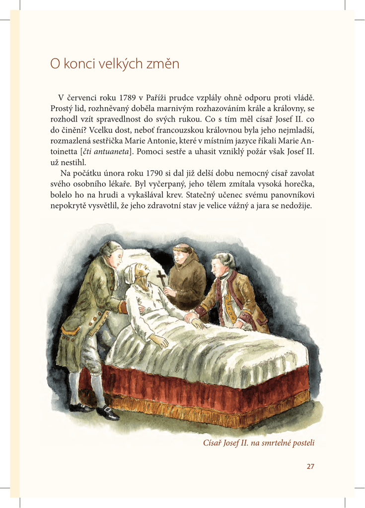 O konci velkých změn V červenci roku 1789 v Paříži prudce vzplály ohně odporu proti vládě. Prostý lid, rozhněvaný doběla marnivým rozhazováním krále a královny, se rozhodl vzít spravedlnost do svých rukou. Co s tím měl císař Josef II. co do činění? Vcelku dost, neboť francouzskou královnou byla jeho nejmladší, rozmazlená sestřička Marie Antonie, které v místním jazyce říkali Marie Antoinetta [čti antuaneta]. Pomoci sestře a uhasit vzniklý požár však Josef II. už nestihl. Na počátku února roku 1790 si dal již delší dobu nemocný císař zavolat svého osobního lékaře. Byl vyčerpaný, jeho tělem zmítala vysoká horečka, bolelo ho na hrudi a vykašlával krev. Statečný učenec svému panovníkovi nepokrytě vysvětlil, že jeho zdravotní stav je velice vážný a jara se nedožije. Císař Josef II. na smrtelné posteli 27 Habsburk přijal špatnou zprávu klidně, s rozumnou věcností: „Dovedu ocenit pravdu, i když hořce chutná,“ a svého lékaře odměnil za jeho upřímnost deseti tisíci zlatými. Pak se stejnou účelností, se kterou nahlížel na práci, pohlédl i na závěr vlastního života. Velkomyslně přikázal rozdat půl milionu zlatých chudým lidem, přiměřeně odměnil služebnictvo a na dva týdny zvýšil žold svým vojákům. Poté dal vyslat rychlého posla ke svému mladšímu bratru Leopoldovi, aby neprodleně spěchal do Vídně a převzal od něj těžké habsburské žezlo. Na hromadné modlení penězi neplýtval, vždyť ti, kteří ho opravdu měli rádi, se za něj pomodlí potichu a ty, kteří jej nenávidí, nutit nehodlá. I na smrtelné posteli Josef II. ještě pracoval a podepisoval jednu listinu za druhou, i když nejspíše už nebyl schopen přesně rozpoznat jejich důležitost. Císař Josef II. zemřel v osamění brzy ráno 20. února 1790. Leopold II. přijel do Vídně až 12. března. Nastoupil na habsburský trůn v rozbolavělé době, kdy národy v říši byly nedůvěřivé a ostražitě číhaly, jaká nařízení Vídeň zase vymyslí, z Francie se pomalu, ale jistě šířilo horko ze vzbouřeneckých ohňů prostého lidu a podpalovalo celou Evropu. Nový císař se svému staršímu bratrovi příliš nepodobal ani vzhledově, ani povahou. Habsburská říše 28 Byl sice také bystrý a vzdělaný, ovšem jeho postava byla obtloustlá, mírně se hrbil a o svůj zevnějšek příliš nedbal. Krom toho, v žádném případě nesdílel Josefovu vojenskou střídmost a panovnickou horlivost. Spíše matčinu trpělivost, obezřetnost a poživačnost. Hlavně zbrkle nedělat druhý krok před prvním. Když chci skočit daleko vpřed, musím nejprve pružně ukročit vzad. V duchu smířlivých státnických kroků zrušil některá Josefova nařízení, čímž uklidnil zejména reptající panstvo. Avšak pouštět se do sporů s Francií se mu příliš nechtělo, přestože jej Marie Antonie naléhavě žádala o pomoc. Bylo léto roku 1791. 1. Co se na konci vlády Josefa II. dělo ve Francii a jak toto dění souviselo s habsburskou říší? a) hladový pařížský lid se vzbouřil proti vládě krále a královny, kterou byla nejmladší dcera zesnulé Marie Terezie b) v Paříži propukl obrovský požár, který zničil téměř celé město a zahynula v něm i Josefova sestra c) mladší sestra Josefa II., provdaná za francouzského krále, nečekaně zemřela 2. Vyberte povahové vlastnosti, kterými oplýval Josef II. paličatý/umíněný/marnivý/chytrý/upjatý/líný/nedočkavý/umění milovný/ velkorysý 29 Znáte mě? Za časů mého života byla značně vysoká úmrtnost novorozeňat a malých dětí. Založil jsem porodnickou školu, z níž vyšla řada výborných ženských lékařů a porodních pomocnic. Díky mně získala pražská porodnická škola věhlas po celé Evropě. Vytvořil jsem základní odborné pojmy pro pojmenování lidského těla (lebka, čelist, patro, řezák, stolička, hrdlo, játra, žláza, šlacha, nárt, …). Kdo jsem? a) Karel Dobrovský (*1775 – † 1854), starší bratr jazykovědce Josefa Dobrovského b) Martin Jan Stamic (*1775 – † 1854), dvojče vynikajícího hudebníka Jana Václava Stamice c) Antonín Jungmann (*1775 – † 1854), mladší bratr jazykovědce Josefa Jungmanna 30 Pověst o marnivé princezně Celá hladová, na samé dno trpké bídy vržená Paříž se vzbouřila, spojila se v jednotnou rozezlenou sílu. „Vyvoleným není všechno dovoleno. Rovnost, volnost, bratrství!“ zněla hesla v ulicích. Početný dav běsnící pařížské chudiny přinutil krále i královnu, aby přesídlili do Tuilerijského paláce, ležícím na pravém břehu řeky Seiny, kde byli drženi v domácím vězení. „Život v Paříži je den ze dne bezvýchodnější, a tak tě prosím Poldíku, při památce naší matky, abys přispěl k záchraně mé královské rodiny.“ Končila Marie Antoinetta tajnou zprávu adresovanou Leopoldovi do Vídně již před měsíci. Ale žádná odpověď doposud nedorazila. Marie přecházela po komnatě královského paláce a nahlas přemýšlela. „S bratrem jsem se naposledy viděla, když mně bylo deset let, ale copak Poldík necítí ani trochu mravní a lidské povinnosti pomoci své mladší sestře, švagrovi a dětem za takto svízelných okolností. Copak na mě bratr zapomněl?“ Pak se pohrdavě ušklíbla. „Asi má strach míchat se do ošemetných událostí ve Francii?“ Toinetta, jak jí říkali v Paříži, vzdorně zvedla bradu. „Vždyť je to jeho povinnost,“ a vztekle dupla nožkou. Nebyla zvyklá, že jí někdo ihned nevyhoví, že bratr okamžitě nezasáhne a nepomůže nebohé sestřičce, které všichni nespravedlivě ubližují. Královna přešla k zrcadlu a prohlížela si jednoduché fialové šaty, pak zvolna přešla k oknu a dívala se na letním sluncem rozveselenou hladinu Seiny. Král Ludvík, mu