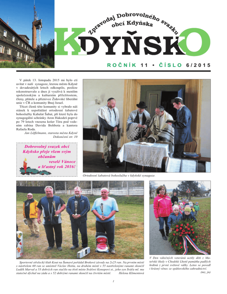 Zp ku Dobrovolného j a od bcí Kdyňska sva v o z ra ROČNÍK 11 • ČÍSLO 6/2015 V pátek 13. listopadu 2015 mi bylo ctí uvítat v naší synagoze, kterou město Kdyně v devadesátých letech odkoupilo, posléze rekonstruovalo a dnes ji využívá k menším společenským a kulturním příležitostem, členy, přátele a příznivce Židovské liberální unie v ČR a komunity Bnej Israel. Třicet členů této komunity si vybralo náš stánek k uspořádání ortodoxní šabatové bohoslužby Kabalat Šabat, při které byla do synagogální schránky Aron Hakodeš poprvé po 79 letech vnesena košer Tóra pod vedením rabína Davida Bohbota a kantora Rafaela Roda. Jan Löffelmann, starosta města Kdyně Dokončení str. 10 Dobrovolný svazek obcí Kdyňsko přeje všem svým občanům veselé Vánoce a šťastný rok 2016! Ortodoxní šabatová bohoslužba v kdyňské synagoze. Sportovně střelecký klub Kout na Šumavě pořádal Brokové závody na 2x25 ran. Na prvním místě s nástřelem 60 ran se umístnil Václav Hošta, na druhém místě s 55 nastřelenými ranami skončil Luděk Marval a 53 dobrých ran stačilo na třetí místo Sváťovi Konopovi st., jeho syn Sváťa ml. mu statečně dýchal na záda a s 52 dobrými ranami skončil na čtvrtém místě. Helena Klimentová 1 V Den válečných veteránů uctily děti z Mateřské školy v Chodské Lhotě památku padlých hrdinů z první světové války. Letos se povedl i krásný věnec ze spáňovského zahradnictví. (mz, jn) Dvojí křest v kapli sv. Václava v Chodské Lhotě Kafková. Děti Jakub a Gabriela byly pokřtěny Monsignorem Miroslavem Kratochvílem. Křtu se zúčastnila celá rodina včetně nejstaršího 92letého pradědečka Václava Kafky a prababičky Zdeňky Švábové z Loučimi. V křesťanství je křest jednou ze svátostí a představuje očištění od hříchů a sjednocení věřícího s Kristem. Počátky křesťanské praxe křtít sahají k osobě Jana Křtitele, který podle Nového zákona pokřtil Ježíše v řece Jordánu. Křesťané křtí v závislosti na tradici pokropením, politím nebo plným ponořením do vody. V posledních letech se vždy týden po pouti v místní kapli konalo hned několik křtů. Ale i tak by kapli sv. Václava slušelo takových akcí více, kaple, která je v majetku obce, je rovněž na seznamu památek UNESCO. Milan Zajíc V kapli sv. Václava pokřtili své děti manželé Altmanovi. Foto Jaroslav Nunvář Pokřtít své děti v kapli sv. Václava v Chodské Lhotě se rozhodli manželé Vendula a Tomáš Altmanovi. „Děda našich dětí je Václav, praděda je také Václav, i proto jsme pro křest zvolili kapli v Chodské Lhotě, která je tomuto jménu zasvěcená,“ říká s úsměvem maminka Vendula Altman Strašící procházka Super den s Jump Aero Pionýrská skupina Jitřenka Kdyně pořádala večerní strašící procházku po okolí Kdyně. U hřbitova se sešlo téměř 600 zájemců, kteří se dobrovolně chtěli bát. Velké poděkování patří všem dobrovolníkům, kteří si našli čas a přišli ze sebe udělat strašidlo. Škoda jen, že jsou mezi námi účastníci, kteří se chovají velmi hrubě, vulgárně a znepříjemňují tak jinak klidný průběh akce. (redakčně kráceno) Ivana Mochurová, vedoucí PS Jitřenka Kdyně Jump Aero Kdyně pořádala sportovní den v sokolovně. Na akci byl pozván starosta pan Jan Löffelmann a známá instruktorka a cvičitelka Hanka Kynychová, kteří úvodem pokřtili skupinové logo žabáka Jaka. Hanka zahájila cvičení formováním postavy a břišního pekáče. Dále proběhla ukázka Kickboxu s Janou Váchalovou. Po přestávce a občerstvení se do cvičení pustila naše Jump skupinka ve složení: Renata, Míša, Iveta, Lenka, Šárka, Anička a Petr. Příznivci si užili propracovaný zábavný program, motivující hudbu a balancování na trampolínách. Závěrečnou třešničkou byla Alena Šustrová s Bossem a Power jógou. Chtěla bych poděkovat všem aktérům sobotního dne za jejich energii, chuť i čas. A co Jump vůbec je? Jump program byl sestaven tak, aby oslovil širokou veřejnost , aby si na své přišel opravdu každý. Díky kombinacím rychlých a pomalých poskoků se silovými prvky a rychlých sprintů, efektivně spalujete tuky. Komplexnost cviků zaručuje posílení celého těla a tvarování partií. Jde o skupinové ,,Jumpování“, kde má každý svojí trampolínu, a ta vyhrazuje pouze váš osobní prostor na cvičení. Začátkem roku 2016 skupina Jump Aero Kdyně oslaví první výročí svého působení. Najdete nás ve sportovní hale ve Kdyni v Komenského ulici. Telefonní kontakt: 721 973 943. Těšíme se na vás. Renata Pešťáková 2 K DYŇ S KO informační zpravodaj vydává: Dobrovolný svazek obcí Kdyňsko Adresa redakce: TIC Kdyně, Nádražní 314 345 06 Kdyně e-mail: [email protected], [email protected] Za obsah zpravodaje odpovídá vydavatel. Redakční rada DSO Kdyňsko si vyhrazuje právo příspěvky nezveřejnit, krátit a redigovat. Odpovědná redaktorka: Sylva Heidlerová Evidence periodického tisku pod č. MK ČR E 15943 uzávěrka příštího čísla: 25. 1. 2016 Do příštího roku méně malichernosti, více úsměvů K zvyklostem Vladislava Vilímce (zprava) patří vánoční koncertování s bratrem Miroslavem. Vážení čtenáři, město Kdyně patřívalo před listopadem 1989 sice k průmyslovým, ale zároveň také velmi zašpiněným městům. Každodenně jsme z parapetů odstraňovali černý popílek z mnoha kotelen a dalších zdrojů znečištění. Tento všudypřítomný prach již je dávno minulostí a považuji to za jeden z úspěchů proměny města. Mnozí návštěvníci Kdyně v poslední době často opakují, že u nás ve Kdyni máme mnoho fungujících služeb, které nemají ani větší města. Ano. Můžeme se pochlubit moderním bazénem, novou 