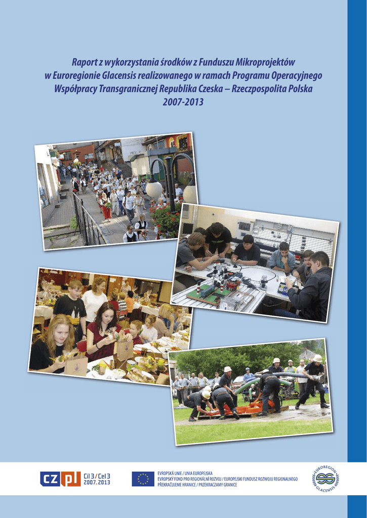 Raport z wykorzystania środków z Funduszu Mikroprojektów w Euroregionie Glacensis realizowanego w ramach Programu Operacyjnego Współpracy Transgranicznej Republika Czeska – Rzeczpospolita Polska 2007-2013 Szanowni Państwo, oddajemy w Państwa ręce publikację podsumowującą Fundusz Mikroprojektów w Euroregionie Glacensis realizowany w ramach Programu Współpracy Transgranicznej Republika Czeska – Rzeczpospolita Polska 2007 – 2013. W ramach Funduszu Mikroprojektów zrealizowano wiele ciekawych mikroprojektów. Realizacja projektów w ramach FM przyczyniła się do zwiększenia aktywności współpracy jednostek samorządu terytorialnego, instytucji kultury, szkół oraz wielu podmiotów naszego regionu. Dzięki realizacji mikroprojektów udało się rozwinąć bezpośrednie kontakty międzyludzkie oraz zbliżyć społeczeństwa żyjące na obszarach przygranicznych. Fundusz Mikroprojektów w Euroregionie Glacensis realizowany był wraz z parterem czeskim, gdzie czeska część Euroregionu była parterem wiodącym projektu parasolowego, a polska część partnerem projektu. W imieniu polskiej części Euroregionu Glacensis dziękuję naszym czeskim parterom za wspólną realizację Funduszu Mikroprojektów. Szczególne podziękowanie kieruję do Instytucji Zarządzającej - Ministerstwa Rozwoju Regionalnego RCz, a szczególnie do Pana Dyrektora RNDr. Jiříego Horáčka oraz do Koordynatora Krajowego – Ministerstwa Infrastruktury i Rozwoju RP. Dziękuję Członkom Euroregionalengo Komitetu Sterującego i Zarządowi Stowarzyszenia Gmin Polskich Euroregionu Glacensis Wielkie słowa uznania kieruję do pracowników obu sekretariatów Euroregionu za sprawną realizację Funduszu po obu stronach granicy. Życzę miłej lektury, Czesław Kręcichwost Prezes Zarządu Stowarzyszenia Gmin Polskich Euroregionów Glacensis Szanowni Państwo, szanowni zwolennicy polsko-czeskiej współpracy, jest moim miłym obowiązkiem podsumować krótko kończący się właśnie program współpracy transgranicznej – Fundusz Mikroprojektów w Euroregionie Glacensis. Od razu na wstępie mogę z radością stwierdzić, że fundusz ten był w czasie swojego siedmioletniego funkcjonowania bardzo udanym instrumentem finansowania rozwoju polsko-czeskiego pogranicza. Jego celem nie było budowanie kosztownych inwestycji, lecz wspieranie przede wszystkim współpracy pomiędzy miastami i gminami, instytucjami edukacyjnymi, sektorem non profit oraz związkami i stowarzyszeniami. Był to fundusz dostępny dla prawie wszystkich kwalifikowalnych wnioskodawców, fundusz, który nie udawał żadnego narzędzia dla wąskiego grona wybrańców, fundusz, który swoimi rezultatami efektywnie pomógł i pomaga w rozwoju polsko-czeskich stosunków w jednoczącej się Europie. Z zadowoleniem mogę też oświadczyć, że Euroregion Glacensis należy pod względem ilości wykorzystanych środków z Funduszu Mikroprojektów do najbardziej udanych na wspólnej granicy i słusznie jest przez Instytucję Zarządzającą uważany za lidera w rozwijaniu współpracy obu krajów. Gdy spojrzymy na dane statystyczne za miniony okres budżetowy, to stwierdzimy, że z EFRR dofinansowano 444 z 595 zarejestrowanych wniosków na ogólną kwotę 5,8 miliona euro. Oczywiste jest, że najbardziej z Funduszu korzystały miasta i gminy kraju kralowohradeckiego, gdzie wspólna granica jest najdłuższa. Rekordzistą było miasto Hronov, które skorzystało z funduszu na rzecz wspólnych projektów w 18 przypadkach. Pod tym względem na kolejnych miejscach są miasta Žacléř i Náchod. Sukces osiągnęli również wnioskodawcy z małych gmin i placówek oświatowych. Tak udana obsługa Funduszu nie byłaby możliwa bez wyraźnego zaangażowania pracowników Euroregionu i wybieranych organów stowarzyszenia. Do takiego wyniku w dużym stopniu przyczynił się także sekretarz Euroregionu Glacensis pan Jaroslav Štefek, który dzięki wieloletnim doświadczeniom i swojemu entuzjazmowi nadał działalności stowarzyszenia wysoki profesjonalny poziom. Ogromnie się cieszę z bardzo dobrej współpracy zespołowej z naszymi polskimi współpracownikami, bez których przychylności i zrozumienia niemożliwe byłoby osiągnięcie tych celów. Wszystkim im należą się duże podziękowania! Petr Hudousek Przewodniczący czeskiej części Euroregionu Glacensis 2 Szanowni Państwo, nadszedł czas podsumowania Funduszu Mikroprojektów realizowanego w perspektywie finansowej 2007 – 2013. W ramach Funduszu Mikroprojektów w Euroregionie Glacensis realizowanego w ramach POWT RCz – RP 2007 – 2013 zostało zrealizowanych ponad 750 mikroprojektów po obu stronach granicy. Dzięki Funduszowi możliwe było rozwijanie i wspomaganie współpracy pomiędzy społecznościami po obu stronach granicy oraz poprawa stosunków kulturalnych, społecznych i gospodarczych. Poprzez realizację mikroprojektów nastąpił rozwój transgranicznych stosunków międzyludzkich, działań oświatowych i kulturalnych oraz inicjatyw obywatelskich. Dzięki możliwości realizacji w ramach Funduszu małych projektów infrastrukturalnych, nastąpiła poprawa infrastruktury turystycznej. Poprzez realizację wspólnych mikroprojektów nawiązano wiele nowych partnerstw oraz pogłębiono i rozwinięto istniejące. W ramach Funduszu zrealizowano dużo ciekawych i innowacyjnych mikroprojektów. Wiele z nich zasługuje na wyróżnienie. W niniejszym raporcie przedstawiamy Państwu kilkanaście z nich. Pragnę podziękować Instytucji Zarządzającej oraz Koordynatorowi Krajowemu w szczególności Panu Witoldowi Wieczorkowi – przedstawicielowi polskiego Ministerstwa Infrastruktury i Rozwoju. Dziękuję Członkom Euroregionalnego Komitetu Sterującego. Szczególnie dziękuję panu Czesławowi Kręcichwostowi – Prezesowi Zarządu SGPEG oraz Członkom Zarządu Stowarzyszenia Gmin Polskich Euroregionu Glacensis. Dziękuję moim współpracownikom z polskiego i czeskiego Sekreta