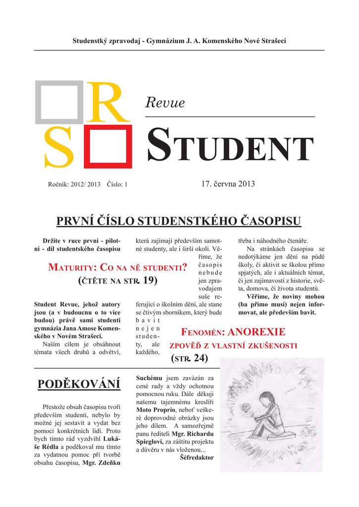 Studenstký zpravodaj - Gymnázium J. A. Komenského Nové Strašecí Revue Student 17. června 2013 Ročník: 2012/ 2013 Číslo: 1 První číslo studenstkého časopisu Držíte v ruce první - pilotní - díl studentského časopisu která zajímají především samottřeba i náhodného čtenáře. né studenty, ale i širší okolí. VěNa stránkách časopisu se říme, že nedotýkáme jen dění na půdě časopis školy, či aktivit se školou přímo aturity o na ně studenti nebude spjatých, ale i aktuálních témat, jen zprači jen zajímavostí z historie, svěčtěte na str vodajem ta, domova, či života studentů. suše reVěříme, že noviny mohou Student Revue, jehož autory ferující o školním dění, ale stane (ba přímo musí) nejen inforjsou (a v budoucnu o to více se čtivým sborníkem, který bude movat, ale především bavit. budou) právě sami studenti b a v i t gymnázia Jana Amose Komennejen enomén ského v Novém Strašecí. studenNaším cílem je obsáhnout ty, ale zpověď z vlastní zkušenosti témata všech druhů a odvětví, každého, M ( :C . 19) ? F (str. 24) Poděkování Přestože obsah časopisu tvoří především studenti, nebylo by možné jej sestavit a vydat bez pomoci konkrétních lidí. Proto bych tímto rád vyzdvihl Lukáše Rédla a poděkoval mu tímto za vydatnou pomoc při tvorbě obsahu časopisu, Mgr. Zdeňku Suchému jsem zavázán za cené rady a vždy ochotnou pomocnou ruku. Dále děkuji našemu tajemnému kreslíři Moto Proprio, neboť veškeré doprovodné obrázky jsou jeho dílem. A samozřejmě panu řediteli Mgr. Richardu Spieglovi, za záštitu projektu a důvěru v nás vloženou... Šéfredaktor : ANOREXIE ÚVODNÍK Student Revue Strana: 3 Úvodník ...nebo si stavte vlaštovky Školní časopis je jenom snůška nezáživnejch, suchejch informací o škole, který se hoděj tak akorát na dělání vlaštovek a beztak do něj píše jen pár šprtů… A co když ne? Možná by bylo fajn říct na úvod něco, co zboří tyhle zažité stereotypy o školních časopisech. (Mezi námi – něco na těch stereotypech bude, tak je zašlapejme do země.) Hlad po informacích byl vždy a všude, ale často se zapomíná na touhu vyjádřit vlastní myšlenku, proto se širší redakcí školního časopisu od nynějška stává každý jeden student našeho gymnázia. My nechceme psát: „Dne toho a toho jsme byli tam a tam…“ – Fuj! Chceme Váš osobitý pohled na nepřeberné množství témat – totiž na všechna témata – nás zajímá všechno. Proč psát jen o škole? – Chodíme sem všichni. Chceme Vaše nápady, Vaše články, Vaše obrázky a Vaše vize. Není na tom nic těžkého, jen k nám přijďte a nekompromisně prohlaste: „Tohle chci otisknout,“ nebo nám to pošlete anonymně. Ale jedině pokud studentský časopis píší studenti, pak ho studenti také budou číst nebo si z něj stavět vlaštovky – i to je osobitý projev zájmu… Jakub Černý Šéfredaktor OBSAH Strana: 4 Student Revue Obsah 5 Soutěže 6R Pochlubme se našimi úspěchy ozhovor S Jakubem Černým o olympiádách a o životě 8 Ze školních akcí Školní akce v kostce podávané s humorem Čabárna, Lyžařský kurz, Pobyt v Polsku, Cykloturistický kurz, Anglie 11 D en 14 M Země ajáles Ekoskládka, Zoo, Obora v Lánech 19 Studenti na prknech, která znamenají svět Naše téma 20 R Maturity, maturitní glosa ozhovor S čerstvým maturantem Janem Zelenkou 22 Studentská tvorba Studentské zájmy, názory, koníčky - co studenty zajímá 22 S onda do historie Anglický dlouhý luk 29 30 24 F enomén Anorexie z vlastní zkušenosti Čtenářský deník Hypnotizér od Larse Keplera Fejeton Nevážné povídání o vážných věcech - tentokrát na téma Facebook Student Revue SOUTĚŽE Strana: 5 Soutěže Studenti našeho gymnázia se účastní mnoha a mnoha soutěží, a to jak vědomostních, tak sportovních. Pravidelně se umísťujeme v horních částech výsledkové listiny a byli bychom bláhoví, kdybychom se naším výkvětem nepochlubili. Ze sportovních turnajů zmiňme Corny cup 20. září 2012, kde naše dívky obsadily stříbrné druhé místo a chlapci bronzové třetí místo. Podobný úspěch jsme zaznamenali na turnaji ve volejbale 15. listopadu 2012, kde byly dívky opět druhé a chplaci opět třetí. Ani basketbal nám není cizí, což naše dívky předvedly 21. března 2013, když obsadily medailové druhé místo. Nejen, že excelují naši sportovci, ale ani ve vědomostních soutěžích nezaostáváme. Kupříkladu v soutěži Vánoční kapr naši žáci obsadili medailová místa, když Pavel Haužvic uvíznul těsně pod vrcholem na krásném druhém místě a Václav Tůma těsně pod ním uzavřel se třetím místem medailové pozice. Pavel Haužvic je všeobecně úspěšným olypionikem. Na zeměpisné olympiádě ukořistil bronzovou medaili a na krajském kole fyzikální olympiády dokonce stříbro. Ovládli jsme i okresní kolo češtinářské olympiády, kdy Jakub Černý získal pomyslné zlato a Anna Křivánková se nenechala zahanbit, když vybojovala třetí pozici. Oba studenti postoupili do krajského kola. Corny cup Volejbal Basketbal SOUTĚŽE Strana: 6 Student Revue Rozhovor Se spolužákem o olympiádách a o životě Jakub Černý Olympionik Jakub je nenápadný mladý muž štíhlé postavy. Když ho někde potkáte, vždy se něčím na něčem činí a je věčně zamyšlený. Je to přísný puntičkář a detailista. On sám o sobě říká, že musí být u každého “hovna“. Pokud tato slova bereme obrazně, pak je to opravdu trefný výrok. Ve škole je vždy středem pozornosti a působí jako hlavní mozek u valné většiny studentských akcí. Mimo školu se věnuje hlavně badmintonu, airsoftu a je členem rynholeckého sboru dobrovolných hasičů, ve kterém se pilně připravuje na rozhodcovské zkoušky. A 