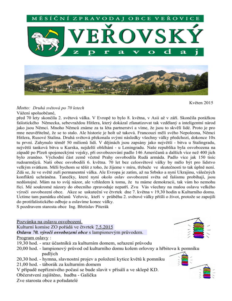 Květen 2015 Motto: Druhá světová po 70 letech Vážení spoluobčané, před 70 lety skončila 2. světová válka. V Evropě to bylo 8. května, v Asii až v září. Skončila porážkou fašistického Německa, sebevraždou Hitlera, který dokázal zfanatizovat tak vzdělaný a inteligentní národ jako jsou Němci. Mnoho Němců známe za ta léta partnerství a víme, že jsou to skvělí lidé. Proto je pro mne neuvěřitelné, že se to stalo. Ale historie je holt už taková. Francouzi měli svého Nepoleona, Němci Hitlera, Rusové Stalina. Druhá světová překonala svými následky všechny války předchozí, dokonce 10x tu první. Zahynulo téměř 50 milionů lidí. V dějinách jsou zapsány jako největší - bitva u Stalingradu, největší tanková bitva u Kurska, nejdelší obléhání - u Leningradu. Naše republika byla osvobozena na západě po Plzeň spojeneckými vojsky, při osvobozování padlo 146 Američanů a dalších více než 400 jich bylo zraněno. Východní část země včetně Prahy osvobodila Rudá armáda. Padlo více jak 150 tisíc rudoarmějců. Naši obec osvobodili 6. května. 70 let bez celosvětové války by mělo být pro lidstvo velkým svátkem. Měli bychom se těšit z toho, že žijeme v míru, třebaže ve skutečnosti to tak úplně není. Zdá se, že ve světě zuří permanentní válka. Ale Evropa je zatím, až na Srbsko a nyní Ukrajinu, válečných konfliktů uchráněna. Tanečky, které nyní okolo oslav osvobození světa od fašismu probíhají, jsou nedůstojné. Mám na to svůj názor, ale vzhledem k tomu, že tu máme demokracii, tak vám ho nemohu říci. Mé soukromé názory do obecního zpravodaje nepatří. Zvu Vás všechny na malou oslavu velkého výročí osvobození obce. Akce se uskuteční ve čtvrtek dne 7. května v 19,30 hodin u Kulturního domu. Uctíme tam památku občanů Veřovic, kteří v průběhu 2. světové války přišli o život, protože se zapojili do protifašistického odboje a oslavíme konec války. S pozdravem starosta obce Ing. Břetislav Piterák Pozvánka na oslavu osvobození. Kulturní komise ZO pořádá ve čtvrtek 7.5.2015 Oslavu 70. výročí osvobození obce s lampionovým průvodem. Program oslavy : 19,30 hod. - sraz účastníků za kulturním domem, seřazení průvodu 20,00 hod. - lampionový průvod od kulturního domu kolem orlovny a hřbitova k pomníku padlých 20,30 hod. - hymna, slavnostní projev a položení kytice květů k pomníku 21,00 hod. - táborák za kulturním domem V případě nepříznivého počasí se bude slavit v přísálí a ve sklepě KD. Občerstvení zajištěno, hudba - Galička Zve starosta obce a pořadatelé USNESENÍ z 6. zasedání Zastupitelstva obce Veřovice, konaného dne 21.4.2015 Zastupitelstvo obce Veřovice v souladu se zákonem č. 128/2000 Sb. o obcích, v platném znění: 6/1 určuje ověřovatele zápisu ve složení: Ing. Ondřej Matuš, Jaroslav Kocián 6/2 schvaluje program 6. zasedání ZO dle návrhu předloženého starostou obce beze změn 6/3 volí návrhovou komisi ve složení: Bc. Gabriela Lošáková, František Černoch 6/4 bere na vědomí zprávu předsedy kontrolního výboru o plnění usnesení z 5. zasedání zastupitelstva obce a o činnosti výboru 6/5 bere na vědomí zprávu předsedy finančního výboru o činnosti finančního výboru od 5. zasedání zastupitelstva obce 6/6 bere na vědomí informaci o činnosti orgánů obce od 5. zasedání zastupitelstva obce předloženou starostou a místostarostou obce 6/7 bere na vědomí informaci o novele nařízení vlády č. 37/2003 Sb., o odměnách za výkon funkce členům zastupitelstev 6/8 stanovuje výši měsíční odměny neuvolněným členům zastupitelstva obce takto: člen zastupitelstva obce 559,- Kč člen výboru nebo komise 1.097,- Kč předseda výboru nebo komise 1.345,- Kč s účinností od 1.5.2015 6/9 schvaluje Pojistnou smlouvu č. 8603138136 mezi obcí Veřovice a Kooperativa pojišťovna, a.s., Vienna Insurance Group se sídlem Pobřežní 665/21, 186 00 Praha 8, IČ: 47116617 pro pojištění budov a staveb v majetku obce Veřovice a pojištění odpovědnosti za újmu s pojistným obdobím 12 měsíců za celkové roční pojistné 54.660,- Kč 6/10 bere na vědomí informaci k některým ustanovením zákona č. 250/2000 Sb., ve znění zákona č. 24/2015 Sb., o rozpočtových pravidlech územních rozpočtů 6/11 schvaluje rozpočtová opatření č. 1/2015 takto: příjmy: 23,132.900,- Kč navýšení na 23,785.900,- Kč výdaje: 32,975.200,- Kč navýšení na 33,651.200,- Kč financování: 9,842.300,- Kč na 9,842.300,- Kč Rozpočtové opatření č. 1 je nedílnou součástí tohoto usnesení 6/12 schvaluje přijetí Rozhodnutí o poskytnutí dotace z Operačního programu Životní prostředí na realizaci akce: "Realizace úspor energie ZŠ - Veřovice" včetně příloh 6/13 schvaluje smlouvu č. 14196463 o poskytnutí podpory ze Státního fondu životního prostředí ČR v rámci Operačního programu Životní prostředí mezi Státním fondem životního prostředí ČR se sídlem Kaplanova 1931/1, 148 00 Praha 11, IČ: 00020729 a obcí Veřovice, Veřovice 70, 742 73 Veřovice, IČ: 00298531 na poskytnutí dotace ze SFŽP obci Veřovice ve výši 69.066,65 Kč výhradně na akci: "Realizace úspor energie - ZŠ Veřovice" 6/14 bere na vědomí informaci o plnění úkolů v sociální oblasti 6/15 bere na vědomí informace o začátku platnosti VPS o výkonu úkolů městské policie a o stavu projednávání OZV č. 1/2015 o místních záležitostech veřejného pořádku 6/16 bere na vědomí informaci o stavu pořízení změny územního plánu Mořkov a změny územního plánu Veřovice 6/17 schvaluje v souladu s § 45 odst. 4 zákona č. 183/2006 Sb., stavební zákon v platném znění, výši částečné úhrady nákladů na pořízení změny územního plánu, na vyhodnocení vlivů na