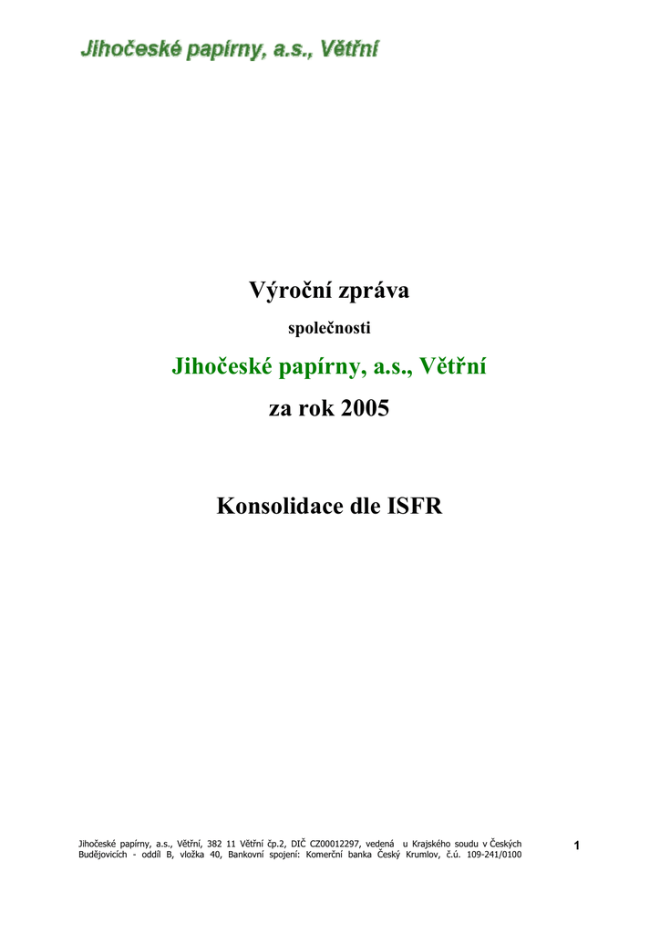 Výroþní zpráva spoleþnosti Jihoþeské papírny, a.s., VČtĜní za rok 2005 Konsolidace dle ISFR Jihoþeské papírny, a.s., VČtĜní, 382 11 VČtĜní þp.2, DIý CZ00012297, vedená u Krajského soudu v ýeských BudČjovicích - oddíl B, vložka 40, Bankovní spojení: Komerþní banka ýeský Krumlov, þ.ú. 109-241/0100 1 Obsah 1. Základní údaje o spoleþnostech konsolidaþního celku........................................................................ 3 1.1. Údaje o mateĜské spoleþnosti ......................................................................................................... 3 1.2. Údaje o dceĜiných spoleþnostech ................................................................................................... 3 1.2.1. JIP-Papírny VČtĜní, a.s. ............................................................................................................. 3 1.2.2. JIP-Papírny Vrané, s.r.o., „v likvidaci“..................................................................................... 4 2. Údaje o základním kapitálu ................................................................................................................. 4 3. Údaje o cenných papírech ................................................................................................................... 5 3.1. MateĜská spoleþnost: ...................................................................................................................... 5 3.2. DceĜiné spoleþnosti: ....................................................................................................................... 5 3.2.1. JIP-Papírny VČtĜní, a.s. ............................................................................................................. 5 3.2.2. JIP-Papírny Vrané spol. s r.o. ,,v likvidaci" .............................................................................. 6 4. Údaje o þinnosti................................................................................................................................... 6 5. Údaje o majetku a finanþní situaci emitenta........................................................................................ 7 6. Zpráva pĜedstavenstva o podnikatelské þinnosti a o stavu jejího majetku .......................................... 8 6.1. Stav majetku spoleþnosti ................................................................................................................ 8 6.1.1. 100% podíl v dceĜinné spoleþnosti JIP-Papírny VČtĜní, a.s. ..................................................... 8 6.1.2. 100% podíl v dceĜinné spoleþnosti JIP-Papírny Vrané spol. s r.o. ,,v likvidaci" ...................... 8 6.1.3. Rekreaþní stĜedisko Armin v obci Lipno .................................................................................. 8 6.2. HospodaĜení spoleþnosti ................................................................................................................ 8 6.3. Vývoj Spoleþnosti v roce 2004 ...................................................................................................... 8 7. Údaje o statutárních a dozorþích orgánech emitenta ........................................................................... 9 7.1. MateĜská spoleþnost Jihoþeské papírny,a.s., VČtĜní ....................................................................... 9 7.2. DceĜinné spoleþnosti ...................................................................................................................... 9 7.2.1. JIP-Papírny VČtĜní, a.s. ............................................................................................................. 9 7.2.2. JIP-Papírny Vrané spol. s r.o. ,,v likvidaci" ............................................................................ 10 7.3. Další údaje:................................................................................................................................... 10 8. Údaje o osobách odpovČdných za výroþní zprávu a ovČĜení úþetní závČrky .................................... 10 Jihoþeské papírny, a.s., VČtĜní, 382 11 VČtĜní þp.2, DIý CZ00012297, vedená u Krajského soudu v ýeských BudČjovicích - oddíl B, vložka 40, Bankovní spojení: Komerþní banka ýeský Krumlov, þ.ú. 109-241/0100 2 Jihoþeské papírny, a.s. uveĜejĖují podle § 80a odst.1 zákona þ. 591/92 Sb. v platném znČní výroþní zprávu za rok 2005. Výroþní zpráva obsahuje rovnČž konsolidovanou úþetní závČrku vzhledem k tomu, že Jihoþeské papírny, a.s. jsou mateĜskou spoleþností konsolidaþního celku. Spoleþnosti zahrnuté do konsolidaþního celku Konsolidaþní celek tvoĜí mateĜská spoleþnost bez výrobní þinnosti a dceĜiné spoleþnosti, které splĖují stanovené podmínky a jejichž souþet vlastního jmČní pĜesahuje 350 mil. Kþ a souþasnČ souþet jejich þistého obratu pĜesahuje 700 mil. Kþ. DceĜiné spoleþnosti zahrnuté do konsolidaþního celku a konsolidované plnou metodou: Název Sídlo JIP-Papírny VČtĜní, a.s. VČtĜní 2 JIP-Papírny Vrané spol. s r.o. ,,v likvidaci" Nádražní 101 Vrané n.Vlt. podíl JIP 100 % 100 % závislost rozhodující rozhodující Do konsolidaþního celku nebyla zaþlenČna spoleþnost ARMIN, pension JIP, s.r.o. se sídlem Lipno nad Vltavou, jejíž podíl na þistém obratu a vlastním kapitálu konsolidaþního celku není významný. 1. Základní údaje o spoleþnostech konsolidaþního celku 1.1. Údaje o mateĜské spoleþnosti Název: Jihoþeské papírny, a.s., VČtĜní Sídlo: VČtĜní 2, PSý 382 11 IýO: 00012297 Datum založení: 29.12.1990 Spoleþnost byla založena podle práva ýSFR jednorázovČ rozhodnutím ministra prĤmyslu ýeské republiky þ. 528/1990 ze dne 27.12.1990. Právní forma: akciová spoleþnost PĜedmČt podnikání (þlánek 2 stanov spoleþnosti): þinnost o