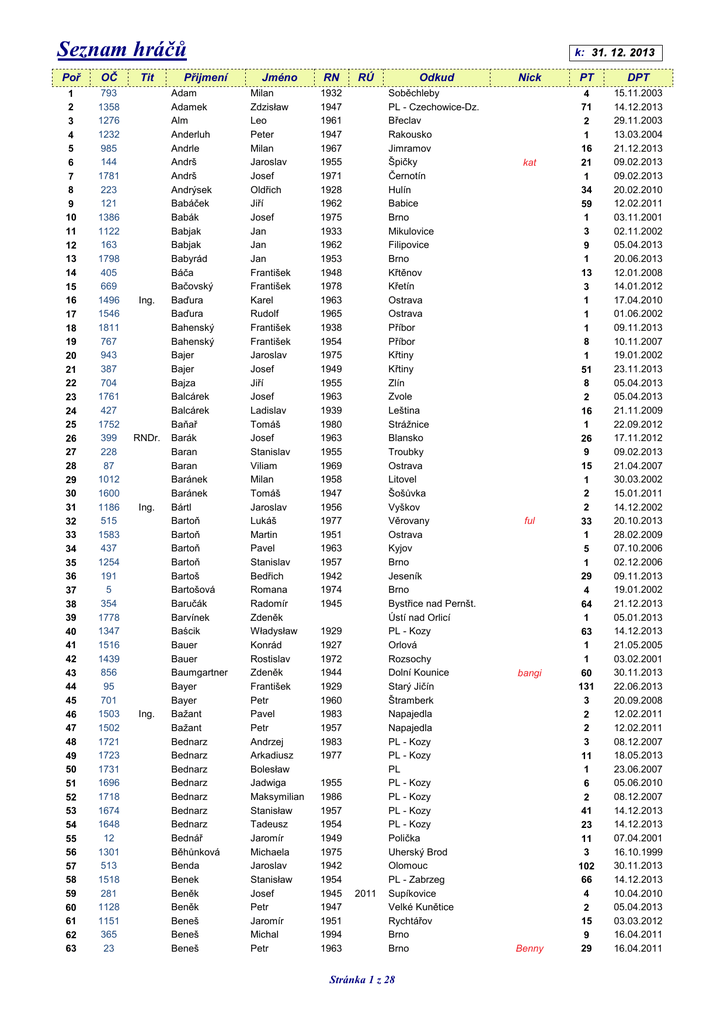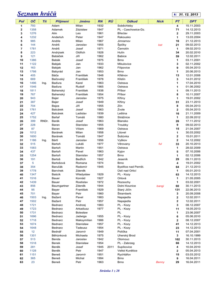 Seznam hráčů Poř OČ 1 2 3 4 5 6 7 8 9 10 11 12 13 14 15 16 17 18 19 20 21 22 23 24 25 26 27 28 29 30 31 32 33 34 35 36 37 38 39 40 41 42 43 44 45 46 47 48 49 50 51 52 53 54 55 56 57 58 59 60 61 62 63 793 1358 1276 1232 985 144 1781 223 121 1386 1122 163 1798 405 669 1496 1546 1811 767 943 387 704 1761 427 1752 399 228 87 1012 1600 1186 515 1583 437 1254 191 5 354 1778 1347 1516 1439 856 95 701 1503 1502 1721 1723 1731 1696 1718 1674 1648 12 1301 513 1518 281 1128 1151 365 23 Tit Ing. RNDr. Ing. Ing. Přijmení Adam Adamek Alm Anderluh Andrle Andrš Andrš Andrýsek Babáček Babák Babjak Babjak Babyrád Báča Bačovský Baďura Baďura Bahenský Bahenský Bajer Bajer Bajza Balcárek Balcárek Baňař Barák Baran Baran Baránek Baránek Bártl Bartoň Bartoň Bartoň Bartoň Bartoš Bartošová Baručák Barvínek Baścik Bauer Bauer Baumgartner Bayer Bayer Bažant Bažant Bednarz Bednarz Bednarz Bednarz Bednarz Bednarz Bednarz Bednář Běhůnková Benda Benek Beněk Beněk Beneš Beneš Beneš k: 31. 12. 2013 Jméno RN Milan Zdzisław Leo Peter Milan Jaroslav Josef Oldřich Jiří Josef Jan Jan Jan František František Karel Rudolf František František Jaroslav Josef Jiří Josef Ladislav Tomáš Josef Stanislav Viliam Milan Tomáš Jaroslav Lukáš Martin Pavel Stanislav Bedřich Romana Radomír Zdeněk Władysław Konrád Rostislav Zdeněk František Petr Pavel Petr Andrzej Arkadiusz Bolesław Jadwiga Maksymilian Stanisław Tadeusz Jaromír Michaela Jaroslav Stanisław Josef Petr Jaromír Michal Petr 1932 1947 1961 1947 1967 1955 1971 1928 1962 1975 1933 1962 1953 1948 1978 1963 1965 1938 1954 1975 1949 1955 1963 1939 1980 1963 1955 1969 1958 1947 1956 1977 1951 1963 1957 1942 1974 1945 RÚ 1929 1927 1972 1944 1929 1960 1983 1957 1983 1977 1955 1986 1957 1954 1949 1975 1942 1954 1945 1947 1951 1994 1963 2011 Odkud Soběchleby PL - Czechowice-Dz. Břeclav Rakousko Jimramov Špičky Černotín Hulín Babice Brno Mikulovice Filipovice Brno Křtěnov Křetín Ostrava Ostrava Příbor Příbor Křtiny Křtiny Zlín Zvole Leština Strážnice Blansko Troubky Ostrava Litovel Šošůvka Vyškov Věrovany Ostrava Kyjov Brno Jeseník Brno Bystřice nad Pernšt. Ústí nad Orlicí PL - Kozy Orlová Rozsochy Dolní Kounice Starý Jičín Štramberk Napajedla Napajedla PL - Kozy PL - Kozy PL PL - Kozy PL - Kozy PL - Kozy PL - Kozy Polička Uherský Brod Olomouc PL - Zabrzeg Supíkovice Velké Kunětice Rychtářov Brno Brno Stránka 1 z 28 Nick kat ful bangi Benny PT DPT 4 71 2 1 16 21 1 34 59 1 3 9 1 13 3 1 1 1 8 1 51 8 2 16 1 26 9 15 1 2 2 33 1 5 1 29 4 64 1 63 1 1 60 131 3 2 2 3 11 1 6 2 41 23 11 3 102 66 4 2 15 9 29 15.11.2003 14.12.2013 29.11.2003 13.03.2004 21.12.2013 09.02.2013 09.02.2013 20.02.2010 12.02.2011 03.11.2001 02.11.2002 05.04.2013 20.06.2013 12.01.2008 14.01.2012 17.04.2010 01.06.2002 09.11.2013 10.11.2007 19.01.2002 23.11.2013 05.04.2013 05.04.2013 21.11.2009 22.09.2012 17.11.2012 09.02.2013 21.04.2007 30.03.2002 15.01.2011 14.12.2002 20.10.2013 28.02.2009 07.10.2006 02.12.2006 09.11.2013 19.01.2002 21.12.2013 05.01.2013 14.12.2013 21.05.2005 03.02.2001 30.11.2013 22.06.2013 20.09.2008 12.02.2011 12.02.2011 08.12.2007 18.05.2013 23.06.2007 05.06.2010 08.12.2007 14.12.2013 14.12.2013 07.04.2001 16.10.1999 30.11.2013 14.12.2013 10.04.2010 05.04.2013 03.03.2012 16.04.2011 16.04.2011 Poř OČ 64 65 66 67 68 69 70 71 72 73 74 75 76 77 78 79 80 81 82 83 84 85 86 87 88 89 90 91 92 93 94 95 96 97 98 99 100 101 102 103 104 105 106 107 108 109 110 111 112 113 114 115 116 117 118 119 120 121 122 123 124 125 126 127 128 129 109 1135 1418 1579 1269 1424 1790 1751 628 1616 896 423 2 54 1210 1245 1705 1547 1700 1081 1463 1688 263 739 1046 438 1642 1785 1786 1584 1770 1577 402 1489 1694 1393 1645 720 893 1581 533 1507 474 1649 463 648 462 624 1736 124 1788 240 1484 47 1420 1429 484 1215 1225 826 22 56 1345 530 522 261 Tit Ing. Ing. Ing. Ing. Ing. Přijmení Beniš Beníšek Benža Beran Beránek Berger Bergloviec Besarabová Beseda Beserle Bezděk Bezděk Bezděk Bezděk ml. Bezděková Bezucký Białek Białek Białek Bidmon Biernot Biesok Biječek Bílek Bílý Binder Biolek Biolek Biolková Biskup Blaha Blaha Bláha Bláha Blachura Blažek Bobál Bocek Boháč Bohuš Bohuš Bochořák Bojanovský Bojdys Boleslav Boleslav Boleslav Bolf Bombera Bonczek Borek Borek Boštík Botko Botko Brada Bradávka Brázda Brázda Brothánková Brtnický Brtnický Brzák Březina Březina Březina Jméno Václav Jan David Mirko Dimitrij Ladislav Jiří Jindřiška Petr František Jaromír Petr Vladimír Vladimír Jana Mojmír Bolesław Stanisław Tadeusz Bohdan Alojzy Stanisław Robert Otakar Zdeněk Tomáš Jaroslav Richard Jana Jiří Břetislav Ivan Josef Stanislav Józef Pavel Josef Augustýn Pavel Ivo Petr Tomáš Bohumil Maria Josef Josef st. Libor Rudolf Milan Petr Jiří Vladimír František Dalibor Přemysl Antonín Martin Jaroslav Zdeněk Ivana Jiří Roman Martin Lubomír Martin Rudolf RN 1939 1965 1976 1944 1957 1935 1958 1939 1945 1953 1974 1945 1942 1974 1942 1945 RÚ 2010 1958 1934 1941 1968 1950 1938 1987 1961 1970 1970 1958 1946 1952 1939 1953 1974 1951 1979 1979 1948 1948 1928 1954 1956 1930 1977 1950 1979 1964 1972 1944 1941 1948 1980 1946 1977 1953 1978 1965 1969 1967 1980 1936 1971 1952 2007 2004 Odkud Ostrava Olešnice Brno Ostrava Břeclav Havlíčkův Brod Budišov n. Budiš. Olomouc Fulnek Městečko Trnávka Dobřichovice Praha Velké Opatovice Velké Opatovice Velké Opatovice Břeclav PL PL - Bielsko-Biała PL - Bielsko-Biała Nové Město na Mor. PL - Czechowice-Dz. PL - Biery Oldřichov Brno Olší Praha Přerov Přerov Přerov Ostrava Hustopeče Ostrava Kunštát Olešnice PL Letovice Popice Frýdek-Místek Zlín Ostrava Ostrava Kunštát Křižanov PL - Kozy Prace Prace Prace Olomouc Jevíčko Paskov Kunštát Troubky Ostrava Kunštát Brno Kokory Brno Blansko Svitavy Šumperk Letovice Letovice Havířov Ostravice Ostravice Kyjov Stránka 2 z 28 Nick fíra warrick P