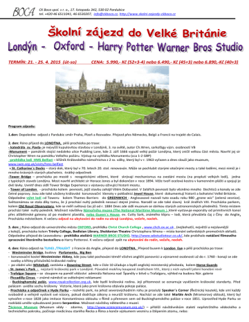 CK Boca spol. s r. o., 17. listopadu 342, 530 02 Pardubice tel. +420 46 6511041, 46 6530207, [email protected], http://www.skolni-zajezdy-ckboca.cz TERMÍN: 21. - 25. 4. 2015 (út-so) CENA: 5.990,- Kč (52+3-4) nebo 6.490,- Kč (45+3) nebo 6.890,-Kč (40+3) Program zájezdu: 1.den: Dopoledne odjezd z Pardubic směr Praha, Plzeň a Rozvadov. Přejezd přes Německo, Belgii a Francii na trajekt do Calais. 2. den: Ráno příjezd do LONDÝNA, pěší procházka po trase: - katedrála sv. Pavla- je nejvyšší kupulovitou stavbou v Londýně, 3. na světě, autor Ch.Wren, sarkofágy význ. osobností VB -Monument – památník stojící nedaleko ulice Pudding Lane, kde 2. září 1666 vypukl velký požár Londýna, který zničil velkou část města. Navrhl jej sir Christopher Wren na památku Velkého požáru. Výstup na vyhlídku Monumentu (cca 1-2 GBP) -prohlídka lodi HMS Belfast – křižník Královského námořnictva z 2 sv. války, který byl v r. 1963 vyřazen a dnes slouží jako muzeum, www.iwm.org.uk/visits/hms-belfast v St. Catharine´s Docks – starý dok, který byl v 70. letech 20. stol. renovován. Může se pochlubit starými otočnými mosty a také loděmi, mezi nimiž je i mnoho krásných starých plachetnic. -krátký odpočinek -Tower Bridge – procházka po mostě s neogotickými věžemi, které skrývají mechanismus na zvedání mostu (na proplutí velkých lodí), jedna z typických staveb Londýna. Most navrhl architekt sir Horace Jones a byl dokončen v roce 1894. Věže tvoří ocelová kostra v kamenném plášti a spojují je dvě lávky. Uvnitř dnes sídlí Tower Bridge Experience s výstavou oživující historii mostu. - Tower of London - procházka kolem pevnosti, jejíž stavbu zahájil Vilém Dobyvatel. V žalářích pevnosti bylo vězněno mnoho šlechticů a konaly se zde četné popravy. Jsou zde také uloženy královské korunovační klenoty v pokladnici Jewel House, které dokumentují historii a bohatství Velké Británie. Odpoledne výlet lodí od Toweru kolem Thames Barriers do GREENWICH - Anglosasové nazvali tuto osadu roku 980 „grone wic“ (zelená vesnice). Světoznámou se stala díky tomu, že jí prochází nultý poledník nesoucí stejné jméno. Narodil se zde také slavný král Jindřich VIII. Procházka parkem, kolem Old Royal Observatory, kde se měří světový čas již od r. 1884 Dnes zde sídlí muzeum se sbírkou starých astronomických předmětů. Tímto místem prochází také nultý poledník. Možnost návštěvy Námořního muzea (The National Maritime Museum ), které vystavuje exponáty od primitivních kanoí přes alžbětinské galeony až po moderní plavidla, nebo Gueen´s House, ev. Cutty Sark, známého klipru – lodi, která převážela čaj z Číny do Anglie. Procházka městečkem. K večeru odjezd na ubytování do rodin na okraji Londýna, večeře, nocleh. 3. den: : Ráno odjezd do univerzitního města OXFORD, prohlídka Christ Church College , www.chch.ox.ac.uk , (nejbohatší, největší a nejslavnější z kolejí), procházka kolem Trinity College, Bodleian Library, Sheldonian Theatre Christophera Wrena – místo konání oxfordských promočních obřadů. Odpoledne přejezd do Leavesdenu - prohlídka ateliérů WARNER BROS STUDIO, http://www.wbstudiotour.co.uk/, kde probíhalo natáčení filmového zpracování literárního bestselleru o Harry Potterovi. K večeru odjezd zpět na ubytování do rodin, večeře, nocleh. 4. den: Ráno odjezd na TUNEL /TRAJEKT z Francie do Anglie, přejezd do LONDÝNA. Přejezd busem k London Eye a pěší procházka po trase: - Westminster Bridge, budovy Parlamentu, Big Ben - korunovační kostel Westminster Abbey, kde jsou také pochováni téměř všichni angličtí panovníci a významné osobnosti až do r. 1760 - konají se zde svatby a křtiny příslušníků královské rodiny - po vládní ulici Whitehall, zastávka u Downing Street, kde v čísle 10 úřaduje a bydlí anglický ministerský předseda, kolem Horse Guards - St. James´s Park - nejstarší královský park v Londýně. Původně mokřiny koupené Jindřichem VIII., který z nich vytvořil jelení honební revír - Trafalgar Square – se sloupem na paměť vítězství admirála Nelsona nad Španěly v bitvě u Trafalgaru, výhled na budovu Nár. galerie - Piccadilly Circus – známé náměstí se světelnými reklamami - Buckinghamský palác, www.royalcollection.org.uk, kde bydlí královská rodina. Její přítomnost se oznamuje vyvěšením královské standarty. Před palácem uvidíte sochu královny Victorie, která jako první královna obývala pokoje paláce. - Procházka a odpočinek v Hyde Parku – rozlehlý park, na jehož severovýchodním rohu je proslulý Speaker´s Corner (Řečnický koutek), kde smí každý svobodně a veřejně vyslovit své názory, pokud dodržuje zákony a neuráží královnu. Nachází se zde také Marble Arch (Mramorový oblouk), který byl vytvořen v roce 1828 jako imitace Konstantinova oblouku v Římě a přenesen sem od Buckinghamského paláce v roce 1851. Uprostřed Hyde Parku se rozkládá uměle vybudované jezero Serpentine. Možnost návštěvy některého z muzeí: *Science Museum (Muzeum vědy - zdarma, http://www.sciencemuseum.org.uk/) – přiblíží návštěvníkům staletí nepřetržitého vědeckého a technického pokroku, počínaje medicínou starého Řecka a Říma a konče výzkumem vesmíru a štěpením atomu, nebo: *Natural History Museum (Přírodovědné muzeum, zdarma, http://www.nhm.ac.uk/ ) – expozice věnované ekologii, vývoji naší planety a člověka. Největší pozornosti se těší exponáty v oddělení dinosaurů (např. impozantní kostra dinosaura), nebo : * fotbalový stadion Chealsea http://www.chelseafc.com/ nebo * Museum Madame Tussauds – muzeum voskových figurín K večeru osobní volno na drobné nákupy (Sports Direct nebo Primark – levné nákupy). Večer o