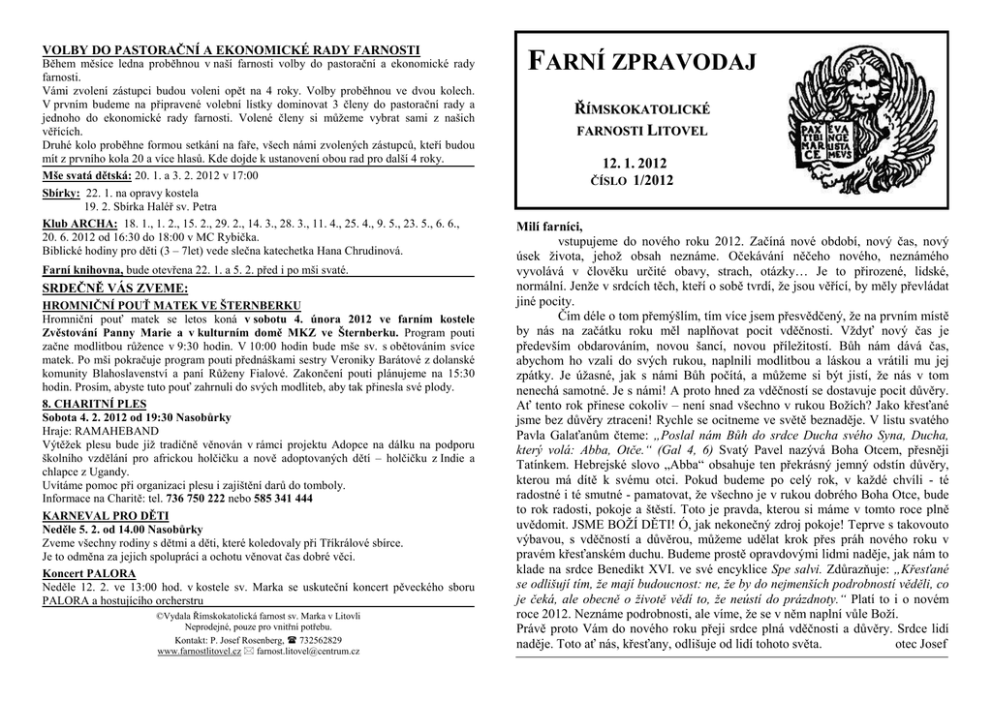 VOLBY DO PASTORAČNÍ A EKONOMICKÉ RADY FARNOSTI Během měsíce ledna proběhnou v naší farnosti volby do pastorační a ekonomické rady farnosti. Vámi zvolení zástupci budou voleni opět na 4 roky. Volby proběhnou ve dvou kolech. V prvním budeme na připravené volební lístky dominovat 3 členy do pastorační rady a jednoho do ekonomické rady farnosti. Volené členy si můžeme vybrat sami z našich věřících. Druhé kolo proběhne formou setkání na faře, všech námi zvolených zástupců, kteří budou mít z prvního kola 20 a více hlasů. Kde dojde k ustanovení obou rad pro další 4 roky. Mše svatá dětská: 20. 1. a 3. 2. 2012 v 17:00 Sbírky: 22. 1. na opravy kostela 19. 2. Sbírka Haléř sv. Petra Klub ARCHA: 18. 1., 1. 2., 15. 2., 29. 2., 14. 3., 28. 3., 11. 4., 25. 4., 9. 5., 23. 5., 6. 6., 20. 6. 2012 od 16:30 do 18:00 v MC Rybička. Biblické hodiny pro děti (3 – 7let) vede slečna katechetka Hana Chrudinová. Farní knihovna, bude otevřena 22. 1. a 5. 2. před i po mši svaté. SRDEČNĚ VÁS ZVEME: HROMNIČNÍ POUŤ MATEK VE ŠTERNBERKU Hromniční pouť matek se letos koná v sobotu 4. února 2012 ve farním kostele Zvěstování Panny Marie a v kulturním domě MKZ ve Šternberku. Program pouti začne modlitbou růžence v 9:30 hodin. V 10:00 hodin bude mše sv. s obětováním svíce matek. Po mši pokračuje program pouti přednáškami sestry Veroniky Barátové z dolanské komunity Blahoslavenství a paní Růženy Fialové. Zakončení pouti plánujeme na 15:30 hodin. Prosím, abyste tuto pouť zahrnuli do svých modliteb, aby tak přinesla své plody. 8. CHARITNÍ PLES Sobota 4. 2. 2012 od 19:30 Nasobůrky Hraje: RAMAHEBAND Výtěžek plesu bude již tradičně věnován v rámci projektu Adopce na dálku na podporu školního vzdělání pro africkou holčičku a nově adoptovaných dětí – holčičku z Indie a chlapce z Ugandy. Uvítáme pomoc při organizaci plesu i zajištění darů do tomboly. Informace na Charitě: tel. 736 750 222 nebo 585 341 444 KARNEVAL PRO DĚTI Neděle 5. 2. od 14.00 Nasobůrky Zveme všechny rodiny s dětmi a děti, které koledovaly při Tříkrálové sbírce. Je to odměna za jejich spolupráci a ochotu věnovat čas dobré věci. Koncert PALORA Neděle 12. 2. ve 13:00 hod. v kostele sv. Marka se uskuteční koncert pěveckého sboru PALORA a hostujícího orcherstru ©Vydala Římskokatolická farnost sv. Marka v Litovli Neprodejné, pouze pro vnitřní potřebu. Kontakt: P. Josef Rosenberg, 732562829 www.farnostlitovel.cz [email protected] FARNÍ ZPRAVODAJ ŘÍMSKOKATOLICKÉ FARNOSTI LITOVEL 12. 1. 2012 ČÍSLO 1/2012 Milí farníci, vstupujeme do nového roku 2012. Začíná nové období, nový čas, nový úsek života, jehož obsah neznáme. Očekávání něčeho nového, neznámého vyvolává v člověku určité obavy, strach, otázky… Je to přirozené, lidské, normální. Jenže v srdcích těch, kteří o sobě tvrdí, že jsou věřící, by měly převládat jiné pocity. Čím déle o tom přemýšlím, tím více jsem přesvědčený, že na prvním místě by nás na začátku roku měl naplňovat pocit vděčnosti. Vždyť nový čas je především obdarováním, novou šancí, novou příležitostí. Bůh nám dává čas, abychom ho vzali do svých rukou, naplnili modlitbou a láskou a vrátili mu jej zpátky. Je úžasné, jak s námi Bůh počítá, a můžeme si být jistí, že nás v tom nenechá samotné. Je s námi! A proto hned za vděčností se dostavuje pocit důvěry. Ať tento rok přinese cokoliv – není snad všechno v rukou Božích? Jako křesťané jsme bez důvěry ztraceni! Rychle se ocitneme ve světě beznaděje. V listu svatého Pavla Galaťanům čteme: „Poslal nám Bůh do srdce Ducha svého Syna, Ducha, který volá: Abba, Otče.“ (Gal 4, 6) Svatý Pavel nazývá Boha Otcem, přesněji Tatínkem. Hebrejské slovo „Abba“ obsahuje ten překrásný jemný odstín důvěry, kterou má dítě k svému otci. Pokud budeme po celý rok, v každé chvíli - té radostné i té smutné - pamatovat, že všechno je v rukou dobrého Boha Otce, bude to rok radosti, pokoje a štěstí. Toto je pravda, kterou si máme v tomto roce plně uvědomit. JSME BOŽÍ DĚTI! Ó, jak nekonečný zdroj pokoje! Teprve s takovouto výbavou, s vděčností a důvěrou, můžeme udělat krok přes práh nového roku v pravém křesťanském duchu. Budeme prostě opravdovými lidmi naděje, jak nám to klade na srdce Benedikt XVI. ve své encyklice Spe salvi. Zdůrazňuje: „Křesťané se odlišují tím, že mají budoucnost: ne, že by do nejmenších podrobností věděli, co je čeká, ale obecně o životě vědí to, že neústí do prázdnoty.“ Platí to i o novém roce 2012. Neznáme podrobnosti, ale víme, že se v něm naplní vůle Boží. Právě proto Vám do nového roku přeji srdce plná vděčnosti a důvěry. Srdce lidí naděje. Toto ať nás, křesťany, odlišuje od lidí tohoto světa. otec Josef Milí farníci, milí přátelé! Vděčnosti není nikdy Dost. Díky za vaši víru a za trvalou snahu žít z Božího slova. Všichni nějak cítíme, že v našich srdcích roste vědomí, že jsme rodinou Božích dětí, že patříme k sobě. Přirozeně život farního společenství má konkrétní podobu, a proto díky těm, kdo 1) pomáhají při liturgii - ministrantům,schole, varhaníkům, sboru. Zvláštní dík patří kostelníkům a těm, kteří kostel uklízejí a zdobí. 2) Díky těm, kteří cítí zodpovědnost za finanční stránku farnosti a přispívají - vám všem Pán Bůh zaplať. 3) Díky členům pastorační rady a ekonomické rady farnosti. Díky za vaše nápady, ochotu se angažovat a vůbec za vaši starost o všechny potřeby farního společenství. Váš otec Josef PŘEHLED HOSPODAŘENÍ FARNOSTI LITOVEL ZA ROK 2011: Příjmy nájemné 91.252,-Kč prodej energie 101.156,-Kč sbírky 287.492,-Kč dary 56.000,-K