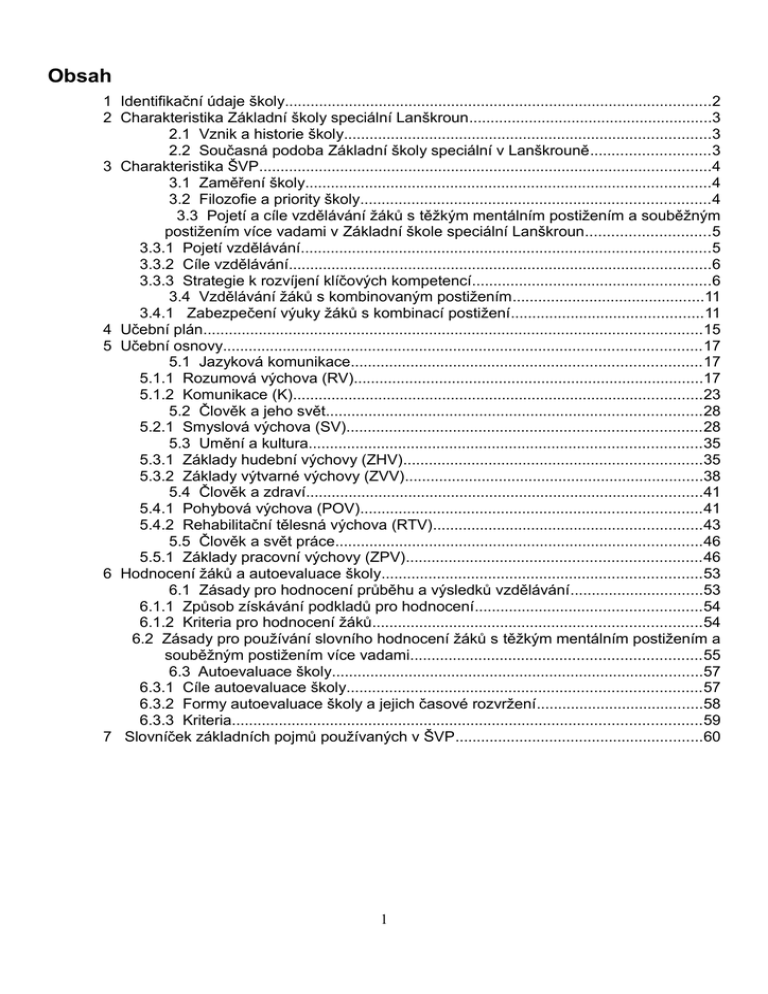Obsah 1 Identifikační údaje školy....................................................................................................2 2 Charakteristika Základní školy speciální Lanškroun.........................................................3 2.1 Vznik a historie školy......................................................................................3 2.2 Současná podoba Základní školy speciální v Lanškrouně............................3 3 Charakteristika ŠVP..........................................................................................................4 3.1 Zaměření školy...............................................................................................4 3.2 Filozofie a priority školy..................................................................................4 3.3 Pojetí a cíle vzdělávání žáků s těžkým mentálním postižením a souběžným postižením více vadami v Základní škole speciální Lanškroun.............................5 3.3.1 Pojetí vzdělávání................................................................................................5 3.3.2 Cíle vzdělávání...................................................................................................6 3.3.3 Strategie k rozvíjení klíčových kompetencí........................................................6 3.4 Vzdělávání žáků s kombinovaným postižením.............................................11 3.4.1 Zabezpečení výuky žáků s kombinací postižení.............................................11 4 Učební plán.....................................................................................................................15 5 Učební osnovy................................................................................................................17 5.1 Jazyková komunikace..................................................................................17 5.1.1 Rozumová výchova (RV)..................................................................................17 5.1.2 Komunikace (K)................................................................................................23 5.2 Člověk a jeho svět........................................................................................28 5.2.1 Smyslová výchova (SV)...................................................................................28 5.3 Umění a kultura............................................................................................35 5.3.1 Základy hudební výchovy (ZHV)......................................................................35 5.3.2 Základy výtvarné výchovy (ZVV)......................................................................38 5.4 Člověk a zdraví.............................................................................................41 5.4.1 Pohybová výchova (POV)................................................................................41 5.4.2 Rehabilitační tělesná výchova (RTV)...............................................................43 5.5 Člověk a svět práce......................................................................................46 5.5.1 Základy pracovní výchovy (ZPV).....................................................................46 6 Hodnocení žáků a autoevaluace školy...........................................................................53 6.1 Zásady pro hodnocení průběhu a výsledků vzdělávání...............................53 6.1.1 Způsob získávání podkladů pro hodnocení.....................................................54 6.1.2 Kriteria pro hodnocení žáků.............................................................................54 6.2 Zásady pro používání slovního hodnocení žáků s těžkým mentálním postižením a souběžným postižením více vadami....................................................................55 6.3 Autoevaluace školy.......................................................................................57 6.3.1 Cíle autoevaluace školy...................................................................................57 6.3.2 Formy autoevaluace školy a jejich časové rozvržení.......................................58 6.3.3 Kriteria..............................................................................................................59 7 Slovníček základních pojmů používaných v ŠVP..........................................................60 1 1 Identifikační údaje školy Název ŠVP: ŠVP pro obor vzdělání základní škola speciální Motivační název: Učení je velká radost (Díl II.), č.j.: ZšspecLa 164/2010 Motto: "Není možné naučit všechny děti všemu, ale je možné učinit každé dítě šťastným". Koordinátor: Mgr. Hana Šilarová, Mgr. Jana Kupsová Metodik prevence: Mgr. Libuše Paščenková Metodik EV: Mgr. Jana Kupsová Předkladatel: Adresa: Základní škola speciální Lanškroun Základní škola speciální Lanškroun Olbrachtova 206 563 01, Lanškroun-Žichlínské předměstí 708 45 361 110007344 600024768 Mgr. Stanislava Švarcová telefon:+420 465 322 732 e-mail: [email protected] www.skolaradost.cz IČO: IZO: RED-IZO: Statutární osoba: Kontakty: Zřizovatel: Adresa: Kontakty: Krajský úřad Pardubického kraje Komenského náměstí 125 532 11, Pardubice tel.: +420 466 026 111 fax: +420 466 611 220 e-mail: [email protected] www.pardubickykraj.cz Schváleno pedagogickou radou: 23. 08. 2010 Schváleno školskou radou: 25. 08. 2010 Platnost dokumentu od: 01. 09. 2010 V Lanškrouně 01. 09. 2010 Mgr. Stanislava Švarcová 2 2 Charakteristika Základní školy speciální Lanškroun 2.1 Vznik a historie školy Od 1. září 1995 byla v Lanškrouně zřízena Pomocná škola. Škola vznikla z potřeby vzdělávat a vychovávat děti s mentálním postižením a kombinovanými vadami. Jedním z 