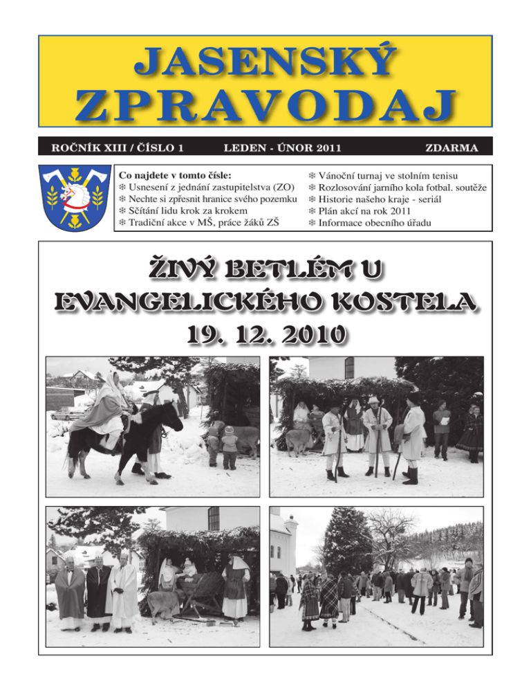 Jasenský z p rav odaj ROČNÍK XIII / ČÍSLO 1 LEDEN - ÚNOR 2011 Co najdete v tomto čísle: d Usnesení z jednání zastupitelstva (ZO) d Nechte si zpřesnit hranice svého pozemku d Sčítání lidu krok za krokem d Tradiční akce v MŠ, práce žáků ZŠ ZDARMA d Vánoční turnaj ve stolním tenisu d Rozlosování jarního kola fotbal. soutěže d Historie našeho kraje - seriál d Plán akcí na rok 2011 d Informace obecního úřadu Živý betlém u evangelického kostela 19. 12. 2010 Usnesení z jednání zastupitelstva obce (ZO) Dne 21. 12. 2010 schválili zastupitelé tato usnesení: 6/III/1/2010 - ZO schvaluje navržený program jednání. Dne 24. 1. 2011 schválili zastupitelé tato usnesení: 6/IV/1/2011 - ZO schvaluje navržený program jednání. 6/III/2/2010- ZO schvaluje rozpočtové opatření č. 3/2010 v příjmové i výdajové části ve výši 493.000,– Kč a pověřuje starostu a účetní provedením závěrečných úprav rozpočtu k 31. 12. 2010. 6/IV/2/2011 - ZO schvaluje volbu ověřovatelů zápisů. 6/III/3/2010 - ZO schvaluje rozpočtové provizorium na 1. čtvrtletí 2011 v měsíčním čerpání 1/12 rozpočtu roku 2010. 6/IV/3/2011 - ZO schvaluje prodej „Prodloužení STL plynovodu k RD Helštýn III“ společnosti JMP Net s. r. o. podle návrhu Kupní smlouvy č. 1210001079 a pověřuje starostu k podpisu smlouvy. 6/III/4/2010 - ZO schvaluje složení sociální komise: Zdeňka Turková, MUDr. Vladan Polášek, Helena Polášková, Jaroslava Mojžíšová, Libuše Kovářová s účinností od 1. 1. 2011. Předsedkyní komise je paní Zdeňka Turková. 6/IV/4/2011 - ZO schvaluje odměny neuvolněným členům ZO podle Nařízení vlády č. 375/2010 Sb. s účinností od 1. 1. 2011. 6/IV/5/2011 - ZO schvaluje zřízení věcného břemene – sloup telefonního vedení na pozemku p. č. 3136 v k. ú. Jasenná na Moravě pro společnost Telefonica O2 Czech Republic a. s. a pověřuje starostu k podpisu smlouvy. 6/III/5/2010 - ZO schvaluje záměr prodeje prodloužení plynovodu Helštýn III. 6/IV/6/2011 - ZO schvaluje plán činnosti finančního a kontrolního výboru v roce 2011. 6/III/6/2010 - ZO pověřuje starostu Pavla Machovského zastupováním obce v MAS Vizovicko a Slušovicko. 6/IV/7/2011 - ZO schvaluje příspěvek Mikroregionu Vizovicko na rok 2011 ve výši 12,– Kč/občan/rok. 6/III/7/2010 - ZO prohlašuje, že pozemky p. č. 308/1 dle GP č. 611-3/2010, 305/1, 305/2, 306/1 vše v k. ú. Jasenná na Moravě budou trvale využívány pro sport a tělovýchovu. 6/IV/8/2011 - ZO schvaluje poskytnutí půjčky Místní akční skupině Vizovicko a Slušovicko ve výši 26.404,– Kč a pověřuje starostu k podpisu smlouvy. 6/III/8/2010 - ZO schvaluje záměr nabytí pozemků p. č. 308/1 dle GP č. 611-3/2010 a 305/1 v k. ú. Jasenná na Moravě. 6/III/9/2010 - ZO schvaluje prodloužení smlouvy o pronájmu plochy pro reklamu na čp. 54 pro p. Radima Lehmana, Mikulůvka 51 o 1 rok a pověřuje starostu uzavřením dodatku smlouvy. Komunální odpad V roce 2010 byly výdaje naší obce na svoz a odstraňování odpadů v následující výši: Plasty 43.719,– Kč Papír 8.580,– Kč Sklo 19.815,– Kč Směsný komunální odpad (popelnice) 397.588,– Kč Objemný odpad (kontejnery) 87.963,– Kč Nebezpečný odpad 56.075,– Kč Celkem 613.740,– Kč Příjmy obce za vybrané poplatky na komunální odpad byly 417.856,– Kč. Z třídění plastů, papíru a skla jsme ze 2 Jasenský zpravodaj 6/IV/9/2011 - ZO schvaluje záměr směny pozemku p. č. 352/1 (373 m 2) za pozemek p. č. 3214/6 (476 m 2) a převod pozemku p. č. 3220/57 (63 m 2) v k. ú. Jasenná na Moravě – vypořádání pozemků MK Sokolská a MK Prostřední. 6/IV/10/2011 - ZO schvaluje záměr prodeje pozemků p. č. 3109/7 – 38 m2 a 3109/9 – 48 m2 v k. ú. Jasenná na Moravě – vypořádání pozemků MK Sokolská. systému EKO-KOM obdrželi 49.667,– Kč. Je potěšitelné, že odpady jsou tříděny a díky tomu nedochází k nárůstu množství směsného a objemného odpadu ukládaného na skládky, kde průměrná cena skládkovného je 1.400,– Kč/t. Jsou ale jiné případy, které nepotěší. Na pasekách máme pro pasekáře, hlavně pro zimní období, umístěny menší kontejnery pro směsný komunální odpad. Na podzim někdo jeden kontejner zaplnil nábytkem. Přitom předtím byla možnost tento nábytek dovézt do velkých kontejnerů, které pro tyto účely jsou 2 x ročně k dispozici. Ve velkém objemu vyjde likvidace odpadu levněji ve vztahu k dopravě. Pavel Machovský, starosta Nechte si zpřesnit hranice svého pozemku Předejděte sporům se sousedy Není hranice jako hranice Vlivem nejednotného původu katastrálních map na našem území a různé přesnosti zaměřování změn v minulosti obsahuje katastr nemovitostí údaje o poloze lomových bodů hranic pozemků s různou polohovou přesností, na které záleží i míra spolehlivosti výsledku případného vytyčení hranice podle údajů katastru a přesnost evidované výměry. Dokud sousedé užívají pozemky ve vzájemné shodě, případná nižší přesnost údajů katastru nemovitostí o společné hranici jim nečiní praktické komplikace. V případě sporu o průběh hranice pozemku však mohou přesnější údaje katastru významným způsobem přispět k urovnání tohoto sporu. Co tedy dělat? Nejprve je nutné si vyjasnit, jak přesné údaje o Vašem pozemku katastr nemovitostí aktuálně obsahuje. Pokud evidované údaje nejsou dostatečně spolehlivé, je třeba posoudit, zda je reálné se sousedy dosáhnout shody na průběh hranice. Pokud by zpřesnění mělo být realizováno v souvislosti s jinou změnou, například s dělením pozemku, informace o přesnosti údajů katastru o hranicích děleného pozemku a o možnosti a podmínkách jejich zpřesnění Vám může nejsnadněji poskytnout vyhotovitel geometrického plánu.