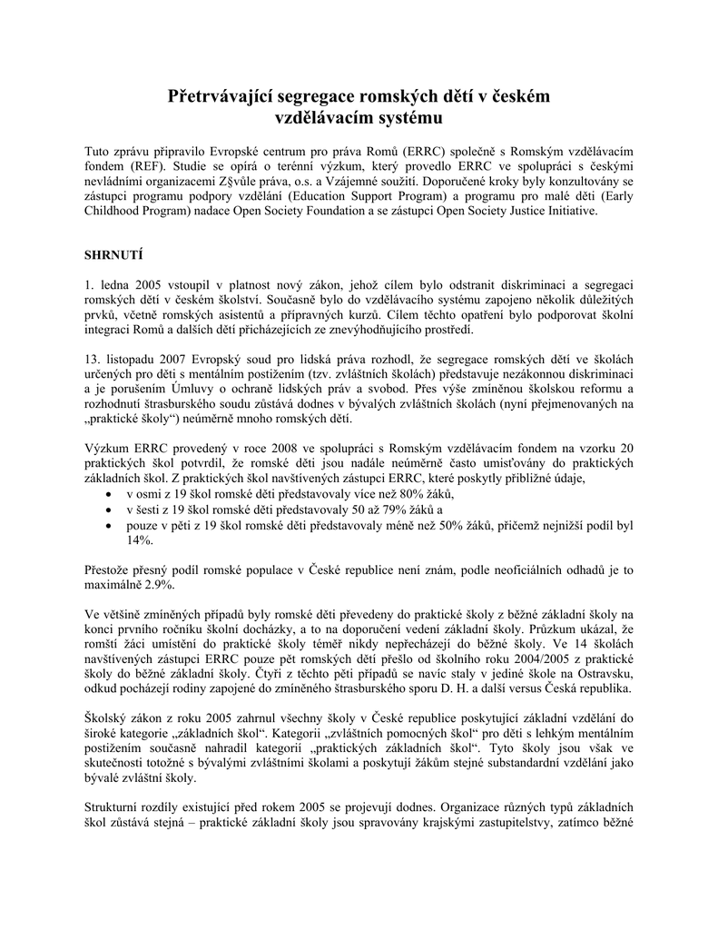 Přetrvávající segregace romských dětí v českém vzdělávacím systému Tuto zprávu připravilo Evropské centrum pro práva Romů (ERRC) společně s Romským vzdělávacím fondem (REF). Studie se opírá o terénní výzkum, který provedlo ERRC ve spolupráci s českými nevládními organizacemi Z§vůle práva, o.s. a Vzájemné soužití. Doporučené kroky byly konzultovány se zástupci programu podpory vzdělání (Education Support Program) a programu pro malé děti (Early Childhood Program) nadace Open Society Foundation a se zástupci Open Society Justice Initiative. SHRNUTÍ 1. ledna 2005 vstoupil v platnost nový zákon, jehož cílem bylo odstranit diskriminaci a segregaci romských dětí v českém školství. Současně bylo do vzdělávacího systému zapojeno několik důležitých prvků, včetně romských asistentů a přípravných kurzů. Cílem těchto opatření bylo podporovat školní integraci Romů a dalších dětí přicházejících ze znevýhodňujícího prostředí. 13. listopadu 2007 Evropský soud pro lidská práva rozhodl, že segregace romských dětí ve školách určených pro děti s mentálním postižením (tzv. zvláštních školách) představuje nezákonnou diskriminaci a je porušením Úmluvy o ochraně lidských práv a svobod. Přes výše zmíněnou školskou reformu a rozhodnutí štrasburského soudu zůstává dodnes v bývalých zvláštních školách (nyní přejmenovaných na „praktické školy“) neúměrně mnoho romských dětí. Výzkum ERRC provedený v roce 2008 ve spolupráci s Romským vzdělávacím fondem na vzorku 20 praktických škol potvrdil, že romské děti jsou nadále neúměrně často umisťovány do praktických základních škol. Z praktických škol navštívených zástupci ERRC, které poskytly přibližné údaje, • v osmi z 19 škol romské děti představovaly více než 80% žáků, • v šesti z 19 škol romské děti představovaly 50 až 79% žáků a • pouze v pěti z 19 škol romské děti představovaly méně než 50% žáků, přičemž nejnižší podíl byl 14%. Přestože přesný podíl romské populace v České republice není znám, podle neoficiálních odhadů je to maximálně 2.9%. Ve většině zmíněných případů byly romské děti převedeny do praktické školy z běžné základní školy na konci prvního ročníku školní docházky, a to na doporučení vedení základní školy. Průzkum ukázal, že romští žáci umístění do praktické školy téměř nikdy nepřecházejí do běžné školy. Ve 14 školách navštívených zástupci ERRC pouze pět romských dětí přešlo od školního roku 2004/2005 z praktické školy do běžné základní školy. Čtyři z těchto pěti případů se navíc staly v jediné škole na Ostravsku, odkud pocházejí rodiny zapojené do zmíněného štrasburského sporu D. H. a další versus Česká republika. Školský zákon z roku 2005 zahrnul všechny školy v České republice poskytující základní vzdělání do široké kategorie „základních škol“. Kategorii „zvláštních pomocných škol“ pro děti s lehkým mentálním postižením současně nahradil kategorií „praktických základních škol“. Tyto školy jsou však ve skutečnosti totožné s bývalými zvláštními školami a poskytují žákům stejné substandardní vzdělání jako bývalé zvláštní školy. Strukturní rozdíly existující před rokem 2005 se projevují dodnes. Organizace různých typů základních škol zůstává stejná – praktické základní školy jsou spravovány krajskými zastupitelstvy, zatímco běžné základní školy zřizují obce. Tato praxe pouze posiluje již existující strukturní rozdíly a nerovnosti mezi těmito dvěma typy základních škol. Děti navštěvující praktické základní školy se nadále učí podle upravených osnov pro děti s mírným mentálním postižením, čímž jsou v oblasti vzdělání výrazně znevýhodňovány. Rámcový vzdělávací program nemění osnovy praktických škol tak, aby byly rovnocenné s osnovami běžných základních škol, ale naopak místo vědomostního vzdělání klade důraz na rozvoj „praktických“ dovedností. Jedinou viditelnou změnou je zavedení výuky anglického jazyka a výtvarné výchovy ve většině škol. Navíc přibývá učitelů praktických základních škol, kteří navštěvují kurzy speciální pedagogiky zaměřené na výuku dětí se zvláštními vzdělávacími potřebami. Výrazné nedostatky v zákonech a v praxi při pedagogicko-psychologickém hodnocení romských dětí nadále podporují neoprávněné umisťování romských dětí do škol a tříd se substandardními osnovami omezujícími možnosti dalšího vzdělání a budoucího zaměstnání. Pedagogicko-psychologické poradny nadále používají stejnou metodologii jako před rokem 2005. Rovněž neexistuje zákonná povinnost opakovaného hodnocení dětí umístěných do praktických škol, pokud o to rodiče nepožádají, ani komplexní hodnocení odborných posudků vydaných pedagogicko-psychologickými poradnami. Většina romských dětí zůstává v praktických školách až do deváté třídy a poté školství opouští. Nové kategorie zavedené do českého vzdělávacího systému v roce 2005 – jako například „sociálně znevýhodněné dítě“ – jsou zdrojem stále častějších nedorozumění, neboť pro zařazování dětí do těchto kategorií neexistují žádná kritéria. Účinek postupů navazujících na změny v české legislativě, jakým je například Koncepce (projekt) včasné péče o děti ze sociokulturně znevýhodňujícího prostředí v oblasti vzdělání, je tudíž obtížné hodnotit, neboť systematické kvantitativní údaje o dotčené cílové skupině – sociálně znevýhodněných dětech – nejsou k dispozici. Pohovory ERRC s romskými rodiči