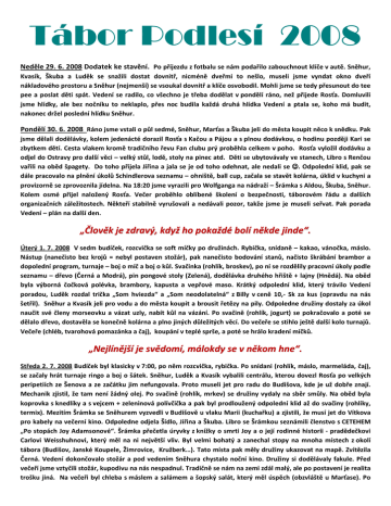 Tábor Podlesí 2008 Neděle 29. 6. 2008 Dodatek ke stavění. Po příjezdu z fotbalu se nám podařilo zabouchnout klíče v autě. Sněhur, Kvasík, Škuba a Luděk se snažili dostat dovnitř, nicméně dveřmi to nešlo, museli jsme vyndat okno dveří nákladového prostoru a Sněhur (nejmenší) se vsoukal dovnitř a klíče osvobodil. Mohli jsme se tedy přesunout do tee pee a poslat děti spát. Vedení se radilo, co všechno je třeba dodělat v pondělí ráno, než přijede Rosťa. Domluvili jsme hlídky, ale bez nočníku to neklaplo, přes noc budila každá druhá hlídka Vedení a ptala se, koho má budit, nakonec držel poslední hlídku Sněhur. Pondělí 30. 6. 2008 Ráno jsme vstali o půl sedmé, Sněhur, Marťas a Škuba jeli do města koupit něco k snědku. Pak jsme dělali dodělávky, kolem jedenácté dorazil Rosťa s Kačou a Pájou a s plnou dodávkou, o hodinu později Kari se zbytkem dětí. Cesta vlakem kromě tradičního řevu Fan clubu prý proběhla celkem v poho. Rosťa vyložil dodávku a odjel do Ostravy pro další věci – velký stůl, lodě, stoly na pinec atd. Děti se ubytovávaly ve stanech, Libro s Renčou vařili na oběd špagety. Do toho přijela Jiřina a jala se je od toho odehnat, ale nedali se ☺. Odpolední klid, pak se dále pracovalo na plnění úkolů Schindlerova seznamu – ohniště, ball cup, začala se stavět kolárna, úklid v kuchyni a provizorně se zprovoznila jídelna. Na 18:20 jsme vyrazili pro Wolfganga na nádraží – Šrámka s Aldou, Škuba, Sněhur. Kolem osmé přijel naložený Rosťa. Večer proběhlo oblíbené školení o bezpečnosti, táborovém řádu a dalších organizačních záležitostech. Někteří stabilně vyrušovali a nedávali pozor, takže jsme je museli seřvat. Pak porada Vedení – plán na další den. „Člověk je zdravý, když ho pokaždé bolí někde jinde“. Úterý 1. 7. 2008 V sedm budíček, rozcvička se soft míčky po družinách. Rybička, snídaně – kakao, vánočka, máslo. Nástup (nanečisto bez krojů = nebyl postaven stožár), pak nanečisto bodování stanů, načisto škrábání brambor a dopolední program, turnaje – boj o míč a boj o kůl. Svačinka (rohlík, broskev), po ní se rozdělily pracovní úkoly podle seznamu – dřevo (Černá a Modrá), pin pongové stoly (Zelená), dodělávka druhého hřiště + lajny (Hnědá). Na oběd byla výborná čočková polévka, brambory, kapusta a vepřové maso. Krátký odpolední klid, který trávilo Vedení poradou, Luděk rozdal trička „Som hviezda“ a „Som neodolatelná“ z Billy v ceně 10,- Sk za kus (opravdu na nás šetřil). Sněhur a Kvasík jeli pro vodu a do města koupit a brousit řetězy na pily. Odpoledne družiny dostaly za úkol naučit své členy morseovku a vázat uzly, nabít kůl na vázání. Po svačině (rohlík, jogurt) se pokračovalo a poté se dělalo dřevo, dostavěla se konečně kolárna a plno jiných důležitých věcí. Do večeře se stihlo ještě další kolo turnajů. Večeře (chléb, tvarohová pomazánka a čaj), koupání v teplé sprše, a poté se hrálo kradení míčků. „Nejlínější je svědomí, málokdy se v někom hne“. Středa 2. 7. 2008 Budíček byl klasicky v 7:00, po něm rozcvička, rybička. Po snídani (rohlík, máslo, marmeláda, čaj), se začaly hrát turnaje ringo a boj o šátek. Sněhur, Luděk a Kvasík vybalili centrálu, kterou dovezl Rosťa po velkých peripetiích ze Šenova a ze začátku jim nefungovala. Proto museli jet pro radu do Budišova, kde je už dobře znají. Mechanik zjistil, že tam není žádný olej. Po svačině (rohlík, mrkev) se družiny vydaly na sběr smůly. Na oběd byla koprovka s knedlíky a s vejcem + zeleninová polívčička a pak byl prodloužený odpolední klid až do svačiny (rohlíky, termix). Mezitím Šrámka se Sněhurem vyzvedli v Budišově u vlaku Marii (kuchařku) a zjistili, že musí jet do Vítkova pro kabely na večerní kino. Odpoledne odjela Šídlo, Jiřina a Škuba. Libro se Šrámkou seznámili členstvo s CETEHEM „Po stopách Joy Adamsonové“. Šrámka přečetla úryvky z knížky o smrti Joy a o její rodinné historii - pradědečkovi Carlovi Weisshuhnovi, který měl na ni největší vliv. Byl velmi bohatý a zanechal stopy na mnoha místech z okolí tábora (Budišov, Janské Koupele, Žimrovice, Kružberk…). Tato místa pak měly družiny ukazovat na mapě. Zvítězila Černá. Vedení dokončovalo stožár a pod vedením Sněhura chystalo noční kino. Družiny si dodělávaly fakule. Před večeří jsme vztyčili stožár, kupodivu na nás nespadnul. Tradičně se nám na zemi zdál malý, ale po postavení je realita trošku jiná. Na večeři byl chleba s máslem a salámem a šopský salát, který měl úspěch (obzvláště u Marťase). Po večeři následovaly teplé sprchy. Libro s Renčou nachystali občerstvení a každá družina si koupila vstupenku do kina, jejíž součástí byly brambůrky, tyčinky a Cola. Cena 1,-- Kč za osobu, děti do 6 let, důchodci, vojáci a ZTP a Vedení zdarma. Náš promítač nám pustil představení firmy BASF kde Wolfgang pracuje (podílí se na vývoji a výrobě zvláštních nehořlavých a samozhášících materiálů) a Harryho Moučku. Pak následoval hlavní film Volání divočiny. Konec byl až kolem půl dvanácté a celý příběh byl samozřejmě dojemný. „Nenávist má lepší paměť než láska“. Čtvrtek 3. 7. 2008 Ráno byl posunutý budíček až na osmou hodinu. Rozcvička se nekonala, ale rybička ano. Na snídani byly makovce a záviny různých příchutí (maková, ořechová,…) a kakao. Na prvním ranním nástupu v krojích vztyčovali vlajky Meloun, Bobeš, Wíťa a Tomáš za první čtyři místa v celoročním bodování. Po hádance, šifře (dokolečka) a bodování stanů jsme se sbalili, naložili lodě a proviant a jeli na kolech do Budišova, kam jsme dora