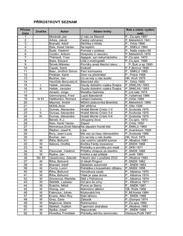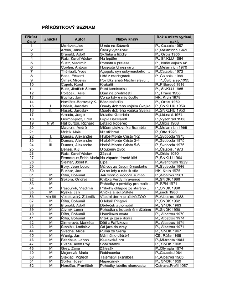 PŘÍRÚSTKOVÝ SEZNAM Přírůst. číslo 1 2 3 4 5 6 7 8 9 10 11 12 13 14 15 16 17 18 19 20 21 22 23 24 25 26 27 28 29 30 31 32 33 34 35 36 37 38 39 40 41 42 43 44 45 46 47 48 49 50 51 52 Značka I. II. N 91 I. II. III. M M M M M Mn 59 M M M M M M M M M M M M M M M M Rok a místo vydání, nakl. Morávek,Jan U nás na Sázavě P., Čs.spis.1957 Arbes, Jakub Český vyhnanec P.,Melantrich 1941 Branald, Adolf Skříňka s líčidly P., Orbis 1966 Rais, Karel Václav Na lepším P., SNKLU 1964 Šustr, Vladimír Pomsta v pralese P., Naše vojsko 68 Coolen, Antoon Hospoda U nesváru P.,Melantrich 1970 Thériault, Yves Agaguk, syn eskymáckého … P.,Čs.spis. 1972 Bass, Eduard Lidé z maringotek P.,Čs.spis. 1966 Šimek,Miloslav Povídky aneb Nechci slevu … P.,Šulc a sp.1995 Čapek, Karel Krakatit P.,F.Borový 1946 Baar, Jindřich Šimon Paní komisarka P., SNKLU 1965 Poláček, Karel Dům na předměstí P., Práce 1958 Buchar, Jan Co se kdy u nás šustlo HK, Kruh 1975 Havlíček-Borovský,K. Básnické dílo P., Orbis 1950 Hašek, Jaroslav Osudy dobrého vojáka Švejka P.,SNKLHU 1953 Hašek, Jaroslav Osudy dobrého vojáka Švejka P.,SNKLHU 1953 Amado, Jorge Mulatka Gabriela P.,Lid.nakl.1974 Germonprez, Fred Lupič Bakelandt P.,Vyšehrad 1986 Halliburton, Richard Létající koberec P.,Orbis 1968 Maurois, André Mlčení plukovníka Brambla P.,Melantrich 1969 Mrštík,Alois Niť stříbrná P.,Otto 1926 Dumas, Alexandre Hrabě Monte Cristo 1-2 P.,Svoboda 1975 Dumas, Alexandre Hrabě Monte Cristo 3-4 P.,Svoboda 1975 Dumas, Alexandre Hrabě Monte Cristo 5-6 P.,Svoboda 1975 Beneš, K.J. Uloupený život P.,Čs.spis. 1973 Rais, Karel Václav Západ P.,Orbis 1950 Remarque,Erich Maria Na západní frontě klid P.,SNKLU 1964 Šlejhar, Josef K. Lípa P.,Aventinum 1929 Bory, Jean-Louis Má ves za času německého P.,Svoboda 1966 Buchar, Jan Co se kdy u nás šustlo HK, Kruh 1975 Říha, Bohumil Jak vodníci udobřili sumce P.,Albatros 1981 Sekora, Ondřej Knížka Ferdy mravence P.,SNDK 1968 Pohádky a povídky pro malé … P.,SPN 1971 Pazourek, Vladimír Příběhy chlapce ze starého .. P.,SNDK 1968 Ryska, Jan Anička a její přátelé P.,sndk 1960 Veselovský, Zdeněk Všední den v pražské ZOO P.,Albatros 1983 Říha, Bohumil O lékaři Pingovi P.,SNDK 1962 Branald, Adolf Dědeček automobil P., SNDK 1963 Čivrný, Lumír Pohádka o kouzelném džbánu P.,SNDK 1958 Říha, Bohumil Honzíkova cesta P., Albatros 1970 Říha, Bohumil Vítek je zase doma P., Albatros 1974 Zinnerová, Markéta Děti z Pařízkova P., Albatros 1974 Stehlék, Ladislav Od jara do zimy P., Albatros 1971 Švácha, Miloš Puma ze Sierry P., SNDK 1967 Wenig, Jan Márinčino dětství ČB, Růže 1968 Fabricius, Johan Klukovská hra P.,Ml.fronta 1984 Evans, Allen Roy Sobi táhnou P., SNDK 1968 Grey, Zane Zálesák P.,Olympia 1974 Majerová, Marie Robinsonka P.,Čs.spis.1984 Steklač, Vojtěch Tajemství skarabea P.,Albatros 1983 Spilka, Josef Napucánek P., SNDK 1959 Horečka, František Pohádky letního slunovratu Ostrava,Profil 1967 Autor Název knihy 53 54 55 56 57 58 59 60 61 62 63 64 65 66 67 68 69 70 71 72 73 74 75 76 77 78 79 80 81 82 83 84 85 86 87 88 89 90 91 92 93 94 95 96 97 98 99 100 101 102 103 104 105 106 107 108 M M M M M M M M M M M M M M M M M M M M N 908 N 908 N 908 N 58 N 92 N 58 N 943.7 N 79 N 943.7 N 03 N 92 N 59 N 908 N 968 Dostál,Karel Dufek, Zdeněk Čtvrtek, Václav Bass, Eduard Němcová, Božena Hugo, Victor Jürgen, Anna Hiob, Eberhard Štorch, Eduard Štorch, Eduard Hellberg, Hans-Eric Rampa, Miroslav Glazarová, Jarmila Fuks, Ladislav Fiedler, Arkady Pařízek, L.M. Solet, Bertrand Nový, Karel Kubka, František Luskač, Rudolf Rais, Karel Václav Sinclair, Upton Manzoni, Alessandro Dostojevskij, F.M. Pecinovský, Josef Ptáčník, Karel Dumas, Alexandre Dumas, Alexandre Dumas, Alexandre Kubín, Josef Štefan Kohout, Pavel Hrubín, František Kriebel, Zdeněk Lobel, Arnold Procházková, Iva Pazourek, Vladimír Pleva, Josef V. Lada, Josef Čapek, Karel Neruda, Jan Neff, Vladimír Stifter, Adalbert Plicka, Karel Dostál, Josef Plch, Jaromír Haager, Jiří Hůrka,Karel Janů, Otakar Spalová, Olga Neff, Ondřej Anděra, Miloš Sekal, Josef Byl jednou jeden nebo nebyl Pohádky z hor Císařská vojna se sultánem Klapzubova jedenáctka Sůl nad zlato a jiné pohádky Veliký jargal Modrý pták Novou zemi pro divoká zvířata Minehava Zlomený meč Vzhůru do povětří Na hřebenech vichřice Advent Příběh kriminálního rady Robinsonův ostrov Mé cesty za dobrodružstvím Byl jeden kapitán Rytíři a lapkové Romance o Ječmínkovi Závoj zeleného ticha Povídky I. Petrolej Snoubenci Bílé noci Abbey Road Ta malička, ta je má Tři mušketýři ještě po 10 …(1) Tři mušketýři ještě po 10 …(2) Tři mušketýři ještě po 10 …(3) Čarovná besídka Říkali mu Frkos Dvakrát sedm pohádek Koulej se, sluníčko, kutálej Kvak a Žbluňk jsou kamarádi Čas tajných přání Vašek a Lenka Malý Bobeš O chytré kmotře lišce Věci kolem nás Povídky malostranské Srpnovští páni Pozdní léto Paměť měst Pražský hrad Hrady,zámky a tvrze v … Klíč k úplné květeně ČSR Souhvězdí domova Kapesní atlas pěstovaných … Dějiny Prahy Rozmnožování a vývoj hmyzu Rok 1948 v Podkrkonoší Co to je, když se řekne Podivuhodný svět J.Verna Poznáváme naše savce Příroda KRNAPu Slovensko Plzeň,Záp.n. 1967 P., SNDK 1963 P., Panton 1973 P.,Čs.spis.1967 P.,SPN 1967 P., Albatros 1971 P., Ml.fronta 1972 P., Albatros 1974 P., SNDK 1964 P., SNDK 1967 P., Albatros 1983 H.Brod,Vč.n. 1963 P.,Čs.spis. 1966 P., Čs.spis. 1975 P.,Ml.fronta 1963 Č.Budějovice 1967 P., Ml.fronta 1981 P.,Čs.spis. 1957 P., Čs.spis. 1967 P.,Svět Sovětů 66 P., SNKLHU 1959 P., Práce 1972 P., Odeon 1973 P.,Svět Sovětů 58 P., Svoboda 1991 P.,Čs.spis. 1967 P., Albatros 1978 P., Albatros 1978 P., Albatros 1978 Třebechovice 1944 P., SNDK 1963 P., Albatros 1982 P., SNDK