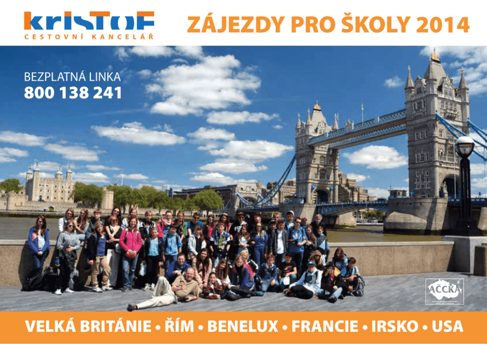 ZÁJEZDY PRO ŠKOLY 2014 BEZPLATNÁ LINKA 800 138 241 VELKÁ BRITÁNIE • ŘÍM • BENELUX • FRANCIE • IRSKO • USA c e s t o v n í rma a d Z e c a t n e z e Pr k a n c e l á ř Nevíte, co se v rámci zájezdu dá navštívit? Chcete studentům přiblížit reálie navštívené země? Nedokážete zodpovědět dotazy o pojištění, o způsobu výběru a hodnocení rodin? Nabízíme Vám možnost návštěvy na Vaší škole s prezentací zájezdu a to buď v rámci vyučovací hodiny nebo v odpoledních hodinách na třídních schůzkách. - promítneme fotky z plánovaného zájezdu - zodpovíme dotazy pedagogů / studentů - přijedeme i na třídní schůzky c e s t o v n í Angličtina, němčina, francouzština PRO PEDAGOGICKÉ PRACOVNÍKY 14-ti denní jazykový kurz ubytování v hostitelské rodině s polopenzí nebo na koleji doprava z ČR až na místo pobytu pojištění NE VÁHE J TE VO LE J TE MAILUJ TE V YUŽIJ TE PŘÍLE ŽITO ST Bezplatná linka: 800 138 241, e-mail: [email protected] přihlášky a nabídky jazykových kurzů budou k dispozici na podzim 2013 dp ro jaz gr z fo ykov am nd á vě C u E te O vro v h M psk raze E é u ná N nie IU S Zavolejte nám na naši bezplatnou linku 800 138 241 a domluvte Vám vyhovující termín návštěvy. Návštěva školy je bezplatná, není zavazující a není vázána na budoucí spolupráci. zy r u k é k c i d o Met h jazyků cizíc k a n c e l á ř c e s t o v n í k a n c e l á ř Moskevská 28, 460 01 Liberec 1, tel.: 800 138 241, fax: 485 102 863, e-mail: [email protected], [email protected] po 2 10 důvodů proč jezdit s námi Obsah s novým školním rokem se do Vašich rukou dostává i náš nový katalog. Už tradičně naše nabídka zájezdů a akcí přesahuje rámec a rozsah tohoto katalogu. Berte jej proto, prosím, jako pozvánku k cestám do zahraničí, jako inspiraci, co je možné vidět a co navštívit. Naši stálí zákazníci dobře vědí, že o finální podobě zájezdu rozhodují sami. Jsou to pedagogové a studenti, podle jejichž požadavků a přání sestavujeme zájezd. Stejně jako v minulosti, i letos přicházíme s nabídkou osvědčených zájezdů a kurzů. Některé jsme inovovali a jiné zcela nově zařazujeme do naší nabídky. V méně turisticky frekventovaných termínech Vám nabízíme významné slevy pro cestování za krásami Evropy. Do katalogu jsme zařadili spoustu nových fotek z odjetých zájezdů a našich cest do zahraničí. Letos jsme nafotili nové atrakce Londýna, nádhernou skotskou přírodu, skvosty Rakouska, ale i nejčastěji navštěvované kouty jižní Anglie. Naše databáze fotek je opravdu velmi bohatá, budete–li chtít, rádi Vám pošleme či uděláme prezentaci na Vaší škole. Proto doufáme, že Vás opět navnadíme k cestování s námi a budeme se těšit na setkání na některém z našich zájezdů. 1) Autobusy - Jezdíme komfortními zahraničními zájezdovými autobusy, vybavenými WC, klimatizací a bezpečnostními pásy. Obsah Mapa pobytových míst Naši průvodci Kdo se podílí na přípravě Prožili jsme Děkujeme Vám za důvěru a věříme v brzké setkání. 2) Pojištění - Zájezdy obsahují nadstandardní pojištění studentů i pedagogů (např. neomezené léčebné výlohy v zahraničí a nejnižší spoluúčast při neúmyslně způsobené škodě). 3) Informace - Podáváme nejrozsáhlejší informace studentům, jejich rodičům a pedagogům (viz. brožury Informace pro účastníky, Odpovědi na nejčastěji kladené otázky, orientační ceny potravin, slovníček, mapy apod.). 4) Bezplatná infolinka - V pracovní době nás můžete kontaktovat na naší bezplatné lince 800 138 241. Mimo tuto dobu na NONSTOP HELPLINKU 602 530 643. 5) Osobní přístup – Váš zájezd bude vždy vyřizovat specialista, který Vám podá maximum informací. Zaručujeme Vám osobní přístup po celou dobu vyřizování zájezdu a samozřejmě kontakt na naší bezplatné lince. kolektiv pracovníků firmy Kristof Speciální poděkování Rádi bychom poděkovali Pavlu Jonešovi, Pavlu Liborovi, Janě Kulhánkové, Janě Mivaltové, Kláře Jones-Newton, Monice Grohové a všem ostatním, kteří nám zaslali fotky a podíleli se na přípravě katalogu a nabídkových listů. 6) Osobní návštěva – Rádi za Vámi přijedeme kamkoliv po České republice a vše osobně vysvětlíme. Naše návštěva je bezplatná a není podmíněna objednávkou či platbou. Pořádáte-li informativní schůzku se studenty či rodiči, neváhejte nás kontaktovat. 7) Slide show – Novinka od roku 2007. Máme tisíce fotek z našich cest, rádi Vám vytvoříme, v rámci výuky, prezentaci Velké Británie či Irska nebo promítneme zájemcům fotografie z plánovaného zájezdu. Tato nabídka platí samozřejmě i pro tzv. třídní schůzky s rodiči. 8) Průvodci – Jsou s Vámi osobně po celou dobu zájezdu. V nočních hodinách pak k zastižení na mobilním telefonu, jehož číslo pedagogové i studenti obdrží na zájezdu. Téměř všichni naši průvodci mají vysokoškolské vzdělání. 9) Program + služby - rádi uzpůsobíme Vašim požadavkům a přáním. Bezplatně Vám sestavíme program na míru. 10) Zkušenosti – Pobyty pro školní skupiny organizujeme již přes 15 let, máme bohaté zkušenosti s přípravou i realizací zájezdů. Jsme ve spojení s ambasádami a cizineckou policií a máme aktuální informace o podmínkách vycestování pro studenty z cizích zemí. Poznávací zájezdy Itálie Řím Benelux Francie Provence Francie Normandie Paříž Paříž + Londýn Brusel + Londýn Nejlevnější Londýn To nejlepší z Londýna Krásy jižní Anglie + Londýn var. 1 Krásy jižní Anglie + Londýn var. 2 Krásy jižní Anglie + Londýn var. 3 Londýn + Oxford a rodiště Shakespeara Londýn + Oxford a megality Cornwall a Devon Lake District a severní Anglie Skotsko Skotsko