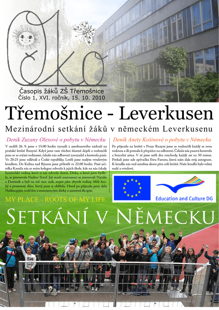 Časopis žáků ZŠ Třemošnice Číslo 1, XVI. ročník, 15. 10. 2010 Třemošnice - Leverkusen Mezinárodní setkání žáků v německém Leverkusenu Deník Zuzany Olexové o pobytu v Německu Deník Anety Košinové o pobytu v Německu V neděli 26. 9. jsme v 15:00 hodin vyrazili z autobusového nádraží na pražské letiště Ruzyně. Když jsme tam všichni šťastně dojeli a rozloučili jsme se se svými rodinami, čekalo nás odbavení zavazadel a kontrola pasů. Ve 20:25 jsme odlétali z České republiky. Letěli jsme malým vrtulovým letadlem. Do Kolína nad Rýnem jsme přiletěli ve 22:00 hodin. Paní učitelka Kamila nás se svým kolegou odvezla k jejich škole, kde na nás čekaly hostitelské rodiny, které si nás odvezly domů. Dívka, u které jsem bydlela, se jmenovala Nadine Stauf. Její starší sourozenci se jmenovali Natalie a Dominik a byli na mě moc milí, stejně jako zbytek rodiny. Měli hezký a prostorný dům, který jsem si oblíbila. Hned po příjezdu jsem dala Nadine,jejím rodičům a sourozencům dárky a unavená šla spát. Po přijezdu na letiště v Praze Ruzyni jsme se rozloučili každý se svou rodinou a šli pomalu k přepážce na odbavení. Čekala nás pasová kontrola a bezcelní zóna. V ní jsme měli dva rozchody, každý asi na 30 minut. Potkali jsme zde zpěvačku Ewu Farnou, která nám dala svůj autogram. K letadlu nás vezl autobus skoro přes celé letiště. Naše letadlo bylo velmi malé a vrtulové. MY PLACE - ROOTS OF MY LIFE Setkání v Německu Severní Porýní-Vestfálsko Spolková země Severní Porýní-Vestfálsko, které původně tvořily dvě samostatné provincie s poněkud rozdílnou minulostí, se dnes vyznačuje vlastní výraznou identitou. Zahrnuje široké údolí řeky Ruhr,bohaté na nerostná ložiska, kde se za posledních 2OO let vytvořila rozsáhlá konurbace(souměstí) tvořená desítkami průmyslových měst, jež pozvolna splývají v jednu souvisle zastavěnou plochu. Jako provincie existovalo Severní Porýní, prostírající se v údolí řeky Rýn už za Římanů. Ve středověku v převážné části vládli kolínští biskupové. Severorýnská města se rozrůstala a vzkvétala díky obchodním stykům a v 19. století se stala významnými centry těžebního a těžkého průmyslu. Vestfálsko zaujímá východní část spolkové země. Dějiny bývalého saského území se často prolínaly s historií Porýní. Průmysl je soustředěn pouze v jeho západním cípu. Severní Porýní-Vestfálsko sice není nejrozlehlejší spolkovou zemí Německa, ale s bezmála 18 miliony obyvatel je rozhodně nejlidnatější. Obvykle se předpokládá, že region, zejména průmyslové Porúří, nemá návštěvníkům co nabídnout. To je ovšem naprosto mylná představa. Návštěvníci rozvinuté země mají připraveno rozličné množství lákadel. Na historické skvosty Kolína nad Rýnem je třeba si vyhradit alespoň dva dny. Ti, kdo dávají přednost muzeím nebo nákupům, by si měli rezervovat více času pro Düsseldorf. V plánech žádného turisty by však neměly chybět ani Bonn, Cáchy a Münster. Nejlepšími oblastmi jsou pohoří Eifel a Teutoburský les, obě jako stvořené pro pěší turistiku a projížďky na kole. Nesmíne zapomenout, že díky bohaté minulosti se tu dochovaly četné nesmírně cenné historické památky a průmyslová města se v uplynutých letech zásluhou štědrých investic proměnila v přitažlivá kulturní centra. Minulost měst, jako jsou Bonn, Cáchy, Kolín nad Rýnem a Xanten, jež si podržela značnou část historického dědictví, sahá až do římské éry. Rozkvět románského umění v Porýní dodnes dokládá nejen řada působivých klášterů roztroušených po celé oblasti, ale i kostely v Kolíně nad Rýnem, jež se rovněž pyšní kolosálním gotickým dómem. Velkou část Severního Porýní-Vestfálska tvoří venkov. Země nabízí tisíce kilometrů turistických stezek v Teutoburském lese a v severní části pohoří Eifel a ideální podmínky pro vodní sporty a rybolov v Sauerlandu. Kupodivu tady najdete i kvalitní lyžařské svahy, například ve vrchovině Rothaar. Martin Stříška, 7. ročník Phantasialand v Brühlu Výlet za odměnu pro žáky podílejících se na uspěchu školy - získání Národní ceny (1. místo) v eTwinningu Setkání českých a německých žáků v rámci výletu do Brühlu Deník Zuzany Olexové o pobytu v Německu Druhý den mě Nadine vzala do aquaparku California. Moc jsme si to tam užily a asi v 13:25 jsme se autobusem vracely k ní domů. Daly jsme si oběd, který její mamka uvařila, a šly jsme do jejího pokoje. Tam jsme si dělaly, co jsme chtěly. Já jsem poslouchala písničky a Nadine hrála hry. Potom jsme odjely na její fotbalový trénink, a když jsme se vrátily, tak se mě zeptala, jestli si nechci zahrát na playstationu, a já souhlasila. Hrály jsme hru Letní olympiáda a docela mě to bavilo, až na to, že Nadine vždycky vyhrála. Uběhlo pár hodin a paní Staufová nás volala k večeři. Po skvělé večeři jsme šly spát, protože jsme další den musely vstávat do školy v 7:10. Deník Anety Košinové o pobytu v Německu Odlétali jsme asi v 20:30 hodin a délka letu byla asi 1 hodinu a 15 minut. V letadle jsme se kochali osvětlenou Prahou a ostatními městy. Do Kolína jsme přilétali asi v 21:35. Po vyzvednutí kufrů nás uvítala paní učitelka Kamila s panem učitelem a odvezli nás před školu za našimi novými kamarády. Po příjezdu ke škole jsme se rozešli za kamarády, kteří nás odvezli k sobě domů. Pondělí - 27.9. 2010: Rodiny si mohly vybrat, jestli pojedeme na výlet dnes nebo v pátek. Moje rodina si vybrala, že dnes. Vzali mě na koně, kde jsem měla možnost jet na projížďku. Po obědě jsme jeli do aquaparku California se Sarah a Sandrou. Tam jsme se vydováděli a okolo 18: