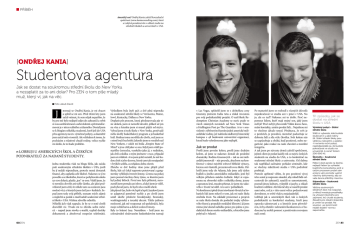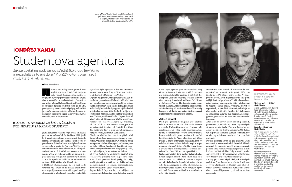příběh Americký sen? Ondřej Kania založil konzultační společnost (www.kaniaconsulting.com), která se zabývá poradenstvím v oblasti studia na středních školách a univerzitách v USA. [Ondřej Kania] Studentova agentura Jak se dostat na soukromou střední školu do New Yorku a nezaplatit za to ani dolar? Pro ZEN o tom píše mladý muž, který ví, jak na věc. Foto Jakub David J menuji se Ondřej Kania, je mi dvacet a splnil se mi sen. Před třemi lety jsem začal vnímat, že sem nějak nepatřím, že by pro mě bylo nejlepší odjet do zahraničí a vybít si svou ambicióznost a sebevědomí a přetransformovat je v něco reálného a úžasného. Dostal jsem se k blogům několika studentů, kteří jeli do USA přes agentury na tzv. výměnné pobyty, a okamžitě jsem začal snít o tomtéž. Ale vzhledem k tomu, že pocházím z relativně chudé rodiny, velice rychle mi došlo, že to bude problém. n lobbuji u amerických škol a českých podnikatelů za nadané studenty. Jedna studentka však na blogu líčila, jak začala psát soukromým středním školám v USA, jestli by jí nedali stipendium, protože nemá dostatek financí, aby zaplatila celé školné. Nakonec se jí to povedlo a ze školného, které se pohybovalo okolo 50 000 dolarů, platila „jen“ 10 000. Věděl jsem, že si nemůžu dovolit ani tuhle částku, ale jaksi podvědomě jsem cítil, že někde tam za oceánem jsou možné věci, o kterých jsem četl jen v knihách. Sepsal jsem tedy svůj příběh, seznam svých zájmů a úspěchů a poslal e-mail každé soukromé střední škole v USA. Většina zdvořile odmítla. Několik jich však napsalo, že by se o mně chtěli dozvědět víc. Trvalo mi to zhruba sedm měsíců – napsal jsem stovky e-mailů, vyplnil desítky dokumentů a absolvoval nespočet telefonátů. 60ZEN Výsledkem byla čtyři 95% a dvě plná stipendia na soukromé střední školy ve Vermontu, Maine, Iowě, Kentucky, Dallasu a New Yorku. Doplatit pět procent, která představovala pár tisíc dolarů, jsem si nemohl dovolit, jelikož už jen na víza a letenku jsem si musel půjčit od strýce. Vybral jsem si tedy školu v New Yorku, poněvadž měla skvělý basketbalový program a já basketbal hrál. Rodina tomu nevěřila do chvíle, než jsem se s nimi loučil na letišti. Jakmile jsem se vznášel nad New Yorkem, v uších mi hrála „Empire State of Mind“ a já se cítil jako ve snu. Když jsem viděl postaršího černocha, vysokého jako já, s rodinkou, jak drží cedulku s mým jménem v ruce, připadal jsem si zvláštně. A to jsem ještě netušil, že mě budou chtít s jeho dcerou, která tam tak nenápadně v brýlích seděla, za nějakou dobu oženit. Zhruba ve dvě hodiny ráno jsme přijeli před školu, kde už čekal naprosto potetovaný a gangstersky vyhlížející trenér Jimmy. Cestou na pokoj jsem poznal všechny členy týmu, ve kterém jsem byl jediný běloch. První noc byla příšerná, nerozuměl jsem pomalu ani slovo, a když jsem je viděl, pochyboval jsem, že bych něco mohl uhrát. Jak plynul čas, bylo vše lepší a lepší. Jazykově jsem se adaptoval poměrně rychle a po chvíli jsem uměl skvěle předvést brooklynský, bronxský, washingtonský a texaský akcent. Takže jedinou možností, jak mě rozpoznat od spoluhráčů, byla moje světlá barva a deficit svalové hmoty. Byly to krásné časy. Namátkou – hrál jsem na celonárodně sledovaném basketbalovém turnaji v Las Vegas, spřátelil jsem se s držitelkou ceny Grammy jménem India Aria a získal investora pro svůj podnikatelský projekt. O naší škole Redemption Christian Academy se navíc psalo ve všech známých novinách od New York Times a Huffington Post po The Guardian. A to v souvislosti s výběrovým řízením jedné americké miliardářské rodiny, jež nabízela nádherný historický kampus s 48 budovami univerzitní organizaci, která bude vyhodnocena jako nejlepší. Jak se prodat Prošli jsme prvním kolem, prošli jsme druhým kolem, až jsme se nakonec dostali do poslední dvanáctky. Rodina Greenových – tak se oni miliardáři jmenovali – nás pozvala, abychom na konferenci v rámci největší světové biblické výstavy, kterou oni vlastnili, prezentovali svou školu. Odletěli jsme tedy do Atlanty, kde jsme celý týden bydleli u jiného amerického miliardáře, jenž byl velkým přítelem našeho ředitele. Když si vzpomenu na obrovské sídlo s několika domy, jezery a spoustou lesů, musím přiznat, že jsem nic takového v životě neviděl. A to ani v pohádkách. Na konferenci před třemi stovkami vlivných a bohatých lidí jsem mluvil o tom, jak mi naše škola změnila život. Na základě prezentací a projevů se naše škola dostala do poslední trojky výběrového řízení a propuklo mediální šílenství. Já jsem mimo jiné dostal nabídku práce pro jednu z produkčních firem onoho miliardáře, u kterého jsme pobývali v Atlantě. Po maturitě jsem se rozhodl z různých důvodů nepokračovat ve studiu ani v práci v USA. No jo, ale co teď? Nakonec mi to došlo. Proč nepomoct lidem, kteří mají stejný sen, jaký jsem měl já? Proč nebýt převozník? Mám know-how, mám kontakty, umím prodat lidi... Najednou mi to všechno dávalo smysl. Představa, že svět je o penězích, je pravdivá, nicméně podceňuje se dobrota lidí a síla vůle člověka. Svět kolem nás se uzpůsobuje a ohýbá, buď pozitivně, nebo negativně, jako reakce na naše chování a morální integritu. A tak jsem po návratu domů založil společnost, jejímž cílem je poslat každý rok co nejvíc českých studentů na studia do USA, a to konkrétně na soukromé střední školy a univerzity. Od dubna tak například začínáme pořádat semináře, kde se všechny náležitosti studia v USA podrobně probírají. Protože upřímně věřím, že pro pozitivní vývoj této země je n