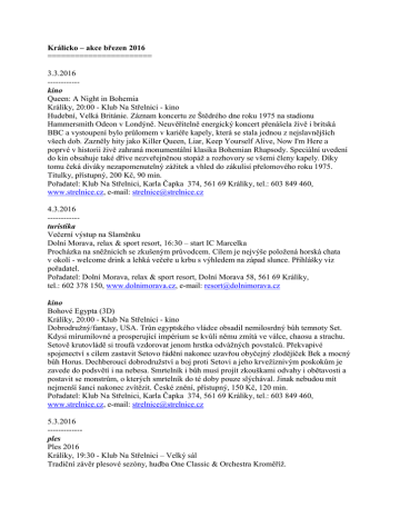 Králicko – akce březen 2016 ======================= 3.3.2016 -----------kino Queen: A Night in Bohemia Králíky, 20:00 - Klub Na Střelnici - kino Hudební, Velká Británie. Záznam koncertu ze Štědrého dne roku 1975 na stadionu Hammersmith Odeon v Londýně. Neuvěřitelně energický koncert přenášela živě i britská BBC a vystoupení bylo průlomem v kariéře kapely, která se stala jednou z nejslavnějších všech dob. Zazněly hity jako Killer Queen, Liar, Keep Yourself Alive, Now I'm Here a poprvé v historii živě zahraná monumentální klasika Bohemian Rhapsody. Speciální uvedení do kin obsahuje také dříve nezveřejněnou stopáž a rozhovory se všemi členy kapely. Díky tomu čeká diváky nezapomenutelný zážitek a vhled do zákulisí přelomového roku 1975. Titulky, přístupný, 200 Kč, 90 min. Pořadatel: Klub Na Střelnici, Karla Čapka 374, 561 69 Králíky, tel.: 603 849 460, www.strelnice.cz, e-mail: [email protected] 4.3.2016 -----------turistika Večerní výstup na Slaměnku Dolní Morava, relax & sport resort, 16:30 – start IC Marcelka Procházka na sněžnicích se zkušeným průvodcem. Cílem je nejvýše položená horská chata v okolí - welcome drink a lehká večeře u krbu s výhledem na západ slunce. Přihlášky viz pořadatel. Pořadatel: Dolní Morava, relax & sport resort, Dolní Morava 58, 561 69 Králíky, tel.: 602 378 150, www.dolnimorava.cz, e-mail: [email protected] kino Bohové Egypta (3D) Králíky, 20:00 - Klub Na Střelnici - kino Dobrodružný/fantasy, USA. Trůn egyptského vládce obsadil nemilosrdný bůh temnoty Set. Kdysi mírumilovné a prosperující impérium se kvůli němu zmítá ve válce, chaosu a strachu. Setově krutovládě si troufá vzdorovat jenom hrstka odvážných povstalců. Překvapivé spojenectví s cílem zastavit Setovo řádění nakonec uzavřou obyčejný zlodějíček Bek a mocný bůh Horus. Dechberoucí dobrodružství a boj proti Setovi a jeho krvežíznivým poskokům je zavede do podsvětí i na nebesa. Smrtelník i bůh musí projít zkouškami odvahy i obětavosti a postavit se monstrům, o kterých smrtelník do té doby pouze slýchával. Jinak nebudou mít nejmenší šanci nakonec zvítězit. České znění, přístupný, 150 Kč, 120 min. Pořadatel: Klub Na Střelnici, Karla Čapka 374, 561 69 Králíky, tel.: 603 849 460, www.strelnice.cz, e-mail: [email protected] 5.3.2016 ------------ples Ples 2016 Králíky, 19:30 - Klub Na Střelnici – Velký sál Tradiční závěr plesové sezóny, hudba One Classic & Orchestra Kroměříž. Pořadatel: Lyžařský oddíl TJ Jiskra Králíky, vstupenky tel.: 734 743 948 nebo 737 754 286 a Klub Na Střelnici, Karla Čapka 374, 561 69 Králíky, tel.: 603 849 460, www.strelnice.cz, email: [email protected] lyžování Adventure night vol. 8 Dolní Morava, 20:00 – Dolní Morava, relax & sport resort, sjezdovka Kamila u hotelu Vista Show v podání lyžařské školy resortu Dolní Morava - demo jízdy, rolby Pisten Bully, fire a laser show, ohňostroj, after party. Pořadatel: Dolní Morava, relax & sport resort, Dolní Morava 58, 561 69 Králíky, tel.: 602 378 150, www.dolnimorava.cz, e-mail: [email protected] 5. – 6.3.2016 ---------------lyžování Teleweekend Dolní Morava – Dolní Morava, relax & sport resort, sjezdovka Kamila u hotelu Vista Sobota 5.3.2016 - Mistrovství České republiky 2016 v telemarku (zároveň 3. závod Českého telemarkového poháru), neděle 6.3.2016 - 4. závod Českého telemarkového poháru 2016, včetně ukázek nejrůznějších disciplín, výuky pro začátečníky a testování vybavení. Pořadatel: Dolní Morava, relax & sport resort, Dolní Morava 58, 561 69 Králíky, tel.: 602 378 150, www.dolnimorava.cz, e-mail: [email protected] 8.3.2016 -----------kino Řachanda Králíky, 17:00 - Klub Na Střelnici – kino Pohádka, ČR. Pohádka o rozmazlené princezně a dvou kamarádech, kteří se neživí vždycky úplně poctivě. Až když se trojice ocitne shodou okolností v kouzelném Černém lese, kde žijí podivné lesní bytosti, naučí se od nich to, co je nedokázali do té doby naučit sami lidé - že tak, jak se chováme k ostatním, tak se pak oni chovají k nám. Neboli že co dáváš, to se ti vrátí. Ale co by to bylo za příběh, kdyby kromě ponaučení, zábavy a milých postav chyběla láska? A tak se stane, že kromě toho, že se princezna Markétka napraví, se také zamiluje do obyčejného Matěje... České znění, přístupný, 120 Kč, 100 min. Pořadatel: Klub Na Střelnici, Karla Čapka 374, 561 69 Králíky, tel.: 603 849 460, www.strelnice.cz, e-mail: [email protected] kino Suburra Králíky, 20:00 - Klub Na Střelnici - kino Krimi thriller, Itálie. Stefano Sollima, režisér mafiánského seriálu Gomorra, se ve svém novém filmu vrací k tématu italské mafie. Neapol tentokrát vystřídá Řím a boj o přístav v Ostii, který se má změnit v evropské Las Vegas. Překvapivě kvalitní a notně drsná gangsterka, která dokazuje, že v Itálii se stále točí dobré filmy. Titulky, od 12 let, 110 Kč, 130 min. Pořadatel: Klub Na Střelnici, Karla Čapka 374, 561 69 Králíky, tel.: 603 849 460, www.strelnice.cz, e-mail: [email protected] 10.3.2016 -----------koncert Koncert žáků Králíky, 18:00 - sál Základní umělecké školy Králíky Koncert žáků hudebního oboru ZUŠ Pořadatel: ZUŠ Králíky, Nádražní 383, 561 69 Králíky, tel.: 465 631 242, www.zuskraliky.cz, e-mail: [email protected] kino Kmotr Králíky, 20:00 - Klub Na Střelnici - kino Kriminální drama, USA. Gangsterské drama Kmotr, natočené podle stejnojmenného bestselleru Maria Puza, patří mezi přelomová díla tzv. Nového Hollywoodu, a to jak komerčně, tak umělecky. Příběh newyorské mafiánské rodiny Corleonů, jíž tvrdou rukou šéfuje starý don Vito (Marlon Brando), se odehrává v letech 1945-1955 a zaznamenává prudký rozmach