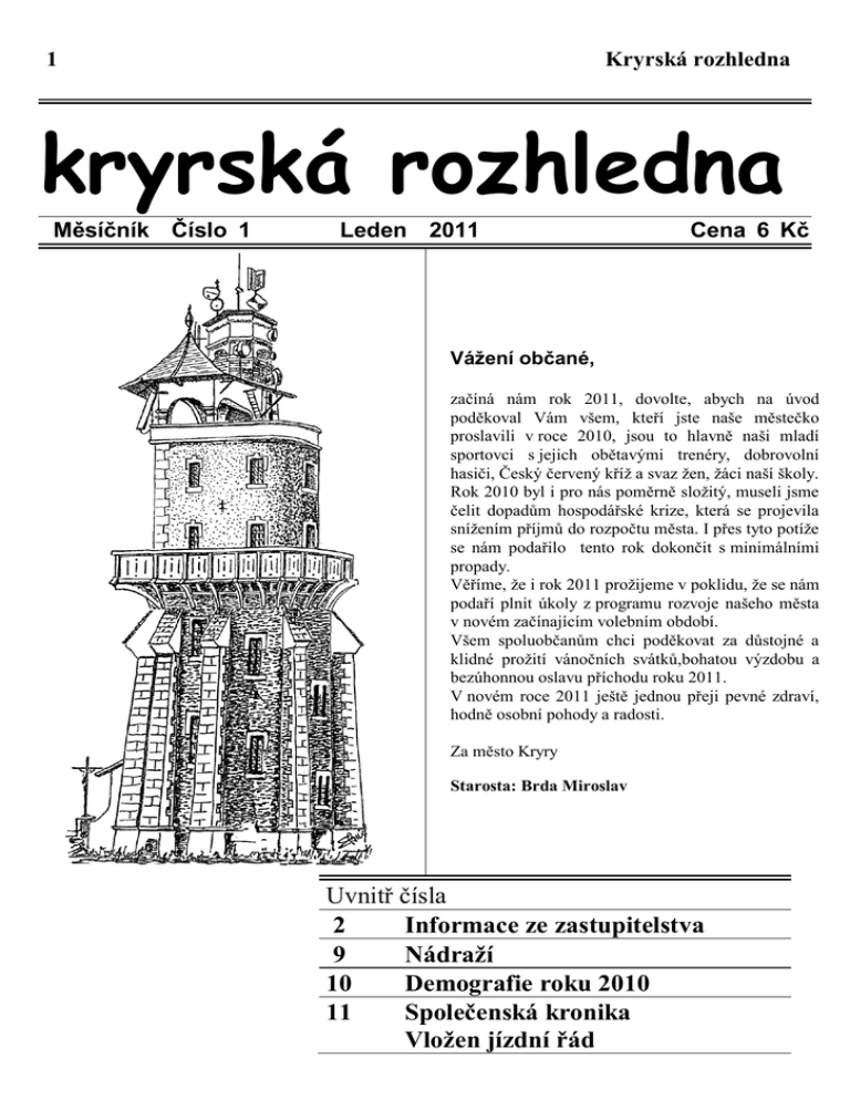 Kryrská rozhledna 1 kryrská rozhledna Měsíčník Číslo 1 Leden 2011 Cena 6 Kč Vážení občané, začíná nám rok 2011, dovolte, abych na úvod poděkoval Vám všem, kteří jste naše městečko proslavili v roce 2010, jsou to hlavně naši mladí sportovci s jejich obětavými trenéry, dobrovolní hasiči, Český červený kříţ a svaz ţen, ţáci naší školy. Rok 2010 byl i pro nás poměrně sloţitý, museli jsme čelit dopadům hospodářské krize, která se projevila sníţením příjmů do rozpočtu města. I přes tyto potíţe se nám podařilo tento rok dokončit s minimálními propady. Věříme, ţe i rok 2011 proţijeme v poklidu, ţe se nám podaří plnit úkoly z programu rozvoje našeho města v novém začínajícím volebním období. Všem spoluobčanům chci poděkovat za důstojné a klidné proţití vánočních svátků,bohatou výzdobu a bezúhonnou oslavu příchodu roku 2011. V novém roce 2011 ještě jednou přeji pevné zdraví, hodně osobní pohody a radosti. Za město Kryry Starosta: Brda Miroslav Uvnitř čísla 2 Informace ze zastupitelstva 9 Nádraţí 10 Demografie roku 2010 11 Společenská kronika Vloţen jízdní řád 2 Informace z jednání Zastupitelstva Města Kryry konaného v prosinci 2010 Starosta města seznámil ZM s tím, ţe dne 6.12.2010 bylo vyhlášeno konkursní řízení na obsazení místa ředitele Základní školy Kryry. Byly obeslány – Krajská školní inspekce Ústí nad Labem, Krajský úřad Ústí nad Labem, Základní škola Kryry a rozeslány inzeráty do novin. Uzávěrka ţádostí je dne 18.2.2011. ZN projednalo a schválilo ţádost Krajského úřadu Ústí nad Labem na provozování autobusové dopravy na lince 520672 Most-Ţatec-Podbořany-Kralovice-Plzeň firmou Autobusy KAVKA Most. Starosta informoval o tom, ţe osadní výbory a všechny sloţky v Kryrech a obcích musí předloţit plány práce na rok 2011, aby jim na základě poţadavků byly přiděleny finanční prostředky na akce pořádané v průběhu roku 2011 . ZM souhlasí , aby plány byly předloţeny v termínu do 20.1.2011. Kryrská rozhledna maţoretkovskými hůlkami v rukou, to v přímé konfrontaci se skupinou maţoretek z Podbořan, starších, nepoměrně zkušenějších, přičemţ si s nimi rozhodně nezadala. Tehdy za své vystoupení obdrţela svůj první, ať jakkoli pouze naturální honorář – a i ten byl samozřejmě pobídkou do další práce. Moţná si Kryrští vzpomenou i na to, ţe jejich vedoucí, někdejší slečna Irena Jandová – vychovatelka ze školní druţiny základní školy, dnešní paní Uldrichová, dostávala 1. května jako vedoucí souboru Cvrčci kytičku růţí z rukou Mgr. Kamila Krause v okamţiku, kdy bylo jasné, ţe v budoucnosti nebude pečovat pouze o výkvět dětiček ze školních lavic kryrské školy, ale i o potomka vlastního. To také byl důvod, proč se krouţek maţoretek na škole nerozeběhl hned se začátkem školního roku, ale aţ o několik týdnů později – tedy aţ poté, co se malý Zbyněk vydral na světlo světa a prvně na tuhle děsivou nespravedlnost, z plných plic, zanadával. Cvrčci se tak sešli aţ koncem října, aby se připravili na další sezónu. ZM projednalo návrh sloţení Osadního výboru Strojetice: Předseda: Josef Kolář Členové: Zdeňka Trinerová, Alena Zrníková, Jarmila Ţáčková Osadní výbor Stebno: Předseda: Gerlinda Jánská Členové: Ing.František Jelínek, Ing.Miroslava Skálová, Vladimíra Kubíková Osadní výbor Běsno: Předseda: Zlata Drimlová Členové:Antonín Mojţíš, Antonín Kováč ZM souhlasí se sloţením osadních výborů. V diskusi byla vznesena připomínka p.Pavla Koláře, ţe by bylo vhodné poţádat Správu a údrţbu silnic Ţatec o osazení značky-sníţení rychlosti směrem od Cihelny Kryry, protoţe v tomto úseku dochází k častým dopravním nehodám. Celé znění zápisu z jednání ZM Kryry, si můţete přečíst na úřední desce nebo na internetových stránkách www.kryry.cz. CVRČCI CHYSTAJÍ NOVÁ VYSTOUPENÍ Skupina kryrských maţoretek, která v tuto dobu oslavuje teprve rok od svého vzniku, výsledky své práce představila našemu městu prvně o Svátcích dobré nálady v květnu minulého roku. Mnoho kryrských jistě vzpomene na děvčátka z místní školy, jeţ v bílých trikotech a květovaných sukénkách neohroţeně točila Nácvik nových vystoupení je v těchto dnech jiţ v plném proudu. Pouţil-li jsem plurálu, pak zcela záměrně, protoţe krouţek kryrských maţoretek se rozrostl natolik – dnes se k nácviku kaţdý čtvrtek schází v tělocvičně školy bezmála dvacet dívek - ţe jej bylo nutno rozdělit na dvě skupiny: těch nejmenších a těch větších. Cvrčci tak chystají vystoupení - hnedle dvě najednou. „Všechna děvčata se učí skladbu na písničku Ivana Mládka Joţin z baţin,“ prozradila Kryrské rozhledně šéfová souboru Irena Uldrichová, „přičemţ ty starší a větší nacvičují také sestavu jinou.“ Bude na skladbu, kterou hraje populární houslistka Vanessa Mae a uţ z prvních nácviků je zřejmé, ţe obě sestavy budou náročnější debutu Cvrčků, tedy skladby „Večerníček“. I kdyţ je pravda, ţe na tohle vystoupení děvčata nezapomněla a o svých čtvrtečních setkáních a zkouškách se zopakování sestavy doţadují. „To je ale problém,“ usmívá se trenérka a choreografka souboru Irena Uldrichová, „děvčata by sama dohromady Kryrská rozhledna 3 skladbu po půl roce, kdy ji cvičila naposledy, asi nedala a upřímně řečeno, nepamatuji si ji celou ani já.“ Nezbývá tedy, neţ se těšit na vystoupení Cvrčků nová.Uţ jen výběr hudebního doprovodu slibuje- myslím- pěknou podívanou – pokud ne dřív, měli by se Kryrští seznámit s výsledky snaţení tohoto školního krouţku o Svátcích dobré nálady, v rámci 