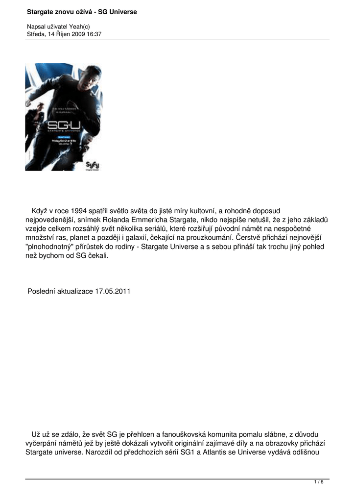 Stargate znovu ožívá - SG Universe Napsal uživatel Yeah(c) Středa, 14 Říjen 2009 16:37 Když v roce 1994 spatřil světlo světa do jisté míry kultovní, a rohodně doposud nejpovedenější, snímek Rolanda Emmericha Stargate, nikdo nejspíše netušil, že z jeho základů vzejde celkem rozsáhlý svět několika seriálů, které rozšiřují původní námět na nespočetné množství ras, planet a později i galaxií, čekající na prouzkoumání. Čerstvě přichází nejnovější "plnohodnotný" přírůstek do rodiny - Stargate Universe a s sebou přináší tak trochu jiný pohled než bychom od SG čekali. Poslední aktualizace 17.05.2011 Už už se zdálo, že svět SG je přehlcen a fanouškovská komunita pomalu slábne, z důvodu vyčerpání námětů jež by ještě dokázali vytvořit originální zajímavé díly a na obrazovky přichází Stargate universe. Narozdíl od předchozích sérií SG1 a Atlantis se Universe vydává odlišnou 1/6 Stargate znovu ožívá - SG Universe Napsal uživatel Yeah(c) Středa, 14 Říjen 2009 16:37 cestou. Nečekejte základny, z nichž budou vysílány teamy na průzkum, nečekejte zázemí mateřské planety. Pilotní díl přivádí hlavní hrdiny v důsledku náhlé evakuace skrze hvězdnou bránu na palubu velmi staré Antické vesmírné lodi "Destiny". V průběhu pilotu se divák dozvídá klasické nečekané informace jakože loď má nedostatek kyslíku, nefunguje filtrace a pokud něco neuděláme všichni do dne umřeme, nicméně dozvídá se i zajímavější info jako například, že loď je vzdálena miliardy světelných let od země a že původní účel plavidla bylo automatické umisťování hvězdných bran na obyvatelné planety. 2/6 Stargate znovu ožívá - SG Universe Napsal uživatel Yeah(c) Středa, 14 Říjen 2009 16:37 Jak bylo řečeno výše, z důvodu nečekané evakuace se na loď dostane jakási všehosměs lidí z nichž většina nebyla určena k průchodum hvězdnou bránou natožpak k účasti na průzkumu archaické antické lodi miliardy světelných let vzdálené bez možnosti návratu zpět. Zde vidíme výrazný odklon od původní koncepce seriálů Stargate. Jak si tato skupinka povede na rozpadající se rozsáhlé lodi s minimem zásob v neznámém prostředí už se musíme nechat pžekvapit, každopádně každý Sci-fař je jistě rád že SG pokrařuje dál. Zajímavosti: - Nová SG má zajímavou kameru, není tak statická jako u předchozích seriálů a působí velmi dobře. - Hudbu skládá opět Jerry Goldsmith jež dělal hudbu i pro předchozí SG, nicméně už v pilotu Vás zaujme, působí zajímavě a dobře odráží atmosféru jež se seriál snaží navodit, dle mého názoru výborná práce. - Pominu-li jsitého tlouštíka který se dostal do seriálu dle tvůrců proto, aby seriál více přiblížil publiku, jsou hlavní postavy vybrány zdařile. Velké plus za Roberta Carlyle jež se pro roli dokonale hodí. - Destiny je stařičká loď - mnohem starší než kousky na které jsme byli zvyklí v Atlantis a tvůrci zdá se tento fakt akceptují. Zatím víme, že má primitivní energetické bariéry, jež v případě prolomení trupu sice dokáží udržet integritu, avšak neudrží tlak a propouští atmosféru. Také se jedná o pomalou loď jež letí rychleji než světlo avšak nedosahuje subprostoru. Na druhou stranu je velmi rozsáhlá, a dokázala uletět miliardy světelných let což je nepravděpodobné zhlediska zásob energie. Dojmy z prvních 3 dílů (v podstatě se jedná o pilotní trojdíl točící se kolem nutného obnovení podpory života, resp. filtrace CO2 na lodi) jsou u mě rozporuplné. Na jednu stranu se mi líbí nová koncepce kterou se Universe ubírá, na druhou stranu je faktem, že jsem nebyl zatím nijak 3/6 Stargate znovu ožívá - SG Universe Napsal uživatel Yeah(c) Středa, 14 Říjen 2009 16:37 překvapen nečekaným, ale ani zklamán. Zatím bych seriál hodnotil velmi neutrálně, a vemu-li podobnost s prvními díly atlantis (seznamování se se základnou) řekl bych, že Atlantis byla propracovanější. Uvidíme dál. Můžete mrknout níže na ubjektivní hodnocení. - SGU s01e01 "Air part 1" - 3,5/5 - SGU s01e02 "Air part 2" - 3,0/5 - SGU s01e03 "Air part 3" - 2,5/5 - SGU s01e04 "Darkness" - 3,0/5 - SGU s01e05 "Light" - 2,0/5 - Ani pátý díl není nic extra, navíc obsahuje poměrně dost opravdu divných věcí, jako například schopnost poškozené stařičké lodi prolétnout sluneční koronou, nebo nouzové přistání raketoplánu na Destiny, jemuž by neuvěřil ani jezevčík s půlkou mozku. - SGU s01e06 "Water" - 3,5/5 - SGU s01e07 "Earth" - 3,5/5 - rozhodně méně monotóní díl, než předchozí, vyniká zejména rozpory a zvraty které se prvně objevují ve větší míře. - SGU s01e08 "Time" - 4,0/5 - asi doposud nejlepší díl, s hezkými efekty i když zbytečně brzo ukončený. - SGU s01e09 "Life" - 2.0/5 - nuda - SGU s01e10 "Justice" - 3,0/5 - SGU s01e11 "Space" - 3,5/5 - první fyzické setkání s cizí rasou schopnou mezihvězdných letů a první boj Destiny proti jiné lodi. Zajímavé, že nepřítel je více primitivní jak milióny let stará Destiny. - SGU s01e12 "Divided" - 3,0/5 - SGU s01e13 "Faith" - 3,0/5 - SGU s01e14 "Human" - 2,5/5 - SGU s01e15 "Lost" - 2,0/5 - polovina hlavních hrdinů zůstala odříznuta od lodi v dalším celkem nudném díle. Bude vtipné sledovat, jakým způsobem se vrátí - v těchto oblastech tvůrci moc nápaditosti zatím nepředvedli. - SGU s01e16 "Sabotage" - 3,5/5 - SGU s01e17 "Pain" - 3,5/5 - SGU s01e18 "Subversion" - 3,0/5 - O'neill je tlustej jak prase na porážku... - SGU s01e19 "Incursion pt. I" - 4,0/5 - tohle je dobrej díl. - SGU s01e20 "Incursion pt. II" - 3,5/5 - začátek druhé řady někdy v září... - SGU s02e01 "Intervention" - 2,5/5 - tak SGčko máme zpět. Překvapení se nekoná, loď je 4/6 Stargat