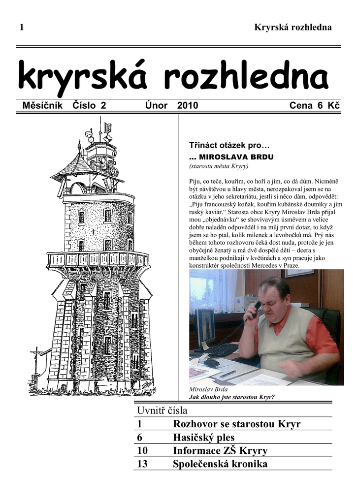 Kryrská rozhledna 1 A kryrská rozhledna Měsíčník Číslo 2 Únor 2010 Cena 6 Kč Třináct otázek pro… … MIROSLAVA BRDU (starostu města Kryry) Piju, co teče, kouřím, co hoří a jím, co dá dům. Nicméně být návštěvou u hlavy města, nerozpakoval jsem se na otázku v jeho sekretariátu, jestli si něco dám, odpovědět: „Piju francouzský koňak, kouřím kubánské doutníky a jím ruský kaviár.“ Starosta obce Kryry Miroslav Brda přijal mou „objednávku“ se shovívavým úsměvem a velice dobře naladěn odpověděl i na můj první dotaz, to kdyţ jsem se ho ptal, kolik milenek a levobočků má. Prý nás během tohoto rozhovoru čeká dost nuda, protoţe je jen obyčejně ţenatý a má dvě dospělé děti – dcera s manţelkou podnikají v květinách a syn pracuje jako konstruktér společnosti Mercedes v Praze. Miroslav Brda Jak dlouho jste starostou Kryr? Uvnitř čísla 1 Rozhovor se starostou Kryr 6 Hasičský ples 10 Informace ZŠ Kryry 13 Společenská kronika 2 To je trošičku komplikovanější, protoţe jsem působil jako místopředseda národního výboru v lidosprávě uţ od roku 1986, to zhruba do devadesátého roku a od té doby jsem do roku 1998 byl místním starostou. Tehdy jsem byl „odejit“, to v Kryrech nastoupilo jiné politické uskupení, abych se v roce 2002 do funkce starosty vrátil. Co vlastně znamená být starostou, co to reprezentuje? Být starostou znamená práci skutečně na plný, stoprocentní úvazek. Starostou jste prostě dvacet čtyři hodin denně. Jsou momenty, kdy za vámi přijdou lidé domů, přijede za vámi třeba policie, kdyţ je potřeba něco řešit, zkrátka to není jen o tom, ţe sedíte v kanceláři a za to pobíráte mzdu, jak si mnozí třeba myslí, ale jde o celodenní zapojení, kdy musíte mít neustále na zřeteli otázky obce, všechny její problémy, protoţe lidi se na vás obracejí především s tím, kdyţ se nějaký problém naskytne a vy se ho pak nějakým způsobem snaţíte řešit. Obracejí se na vás i s prosbou o radu, ptají se, „co ty na to říkáš, co si o tom myslíš…“ Nestěţuji si, v ţádném případě. Být starostou je práce zajímavá, různorodá a baví mě. Jsem rád, kdyţ dokáţu pomoci, coţ samozřejmě nejde vţdycky. Nejsem všemohoucí. Takţe jestli se ptáte na to, jestli jsem víc Brda – starosta nebo Brda - člověk, tak v současnosti určitě to první. Určitě máte nějaké své zájmy, koníčky – asi na ně příliš času nezbývá, přesto: jaké jsou? Tak je to sport a houbaření. Jsem aktivně zapojen v tělovýchovné jednotě SK Kryry. Tělovýchovu se snaţím podporovat i v rámci města; kaţdý rok dáváme do rozpočtu určitou finanční částku, abychom udrţeli v nějakém rozumném stavu náš sportovní areál, a snaţíme se, aby tady bylo co nejvíce sportovních, především mládeţnických druţstev, coţ se daří – máme v Kryrech ve fotbale přípravku, ţáky, dorost, muţe, dokonce i ţeny – ty hrají svou třetí fotbalovou ligu, v současnosti se nám tu rozvíjí i stolní tenis, kdy se zaloţilo druţstvo muţů a v souvislosti s tím i obětaví tatínkové trénují ţáčky. Letos prvním rokem – ta děcka jezdí po turnajích a přiváţejí uţ i první cenná vítězství… To souvisí s tou organizační stránkou věci. Mě ale zajímá, jestli se „hýbete“ vy sám? Občas taky (smích…). Já osobně dvakrát týdně chodím hrát nohejbal. Jsem aktivním členem sportklubu Kryry, coţ je sdruţení chlapů nad třicet let, kteří mají zájem nejen o sport, ale třeba i o kulturu. Pořádáme spoustu akcí, jak pro členy klubu, tak i pro veřejnost. Skončil rok 2009 a je pomalu čas bilancovat: co se tedy kryrské radnici povedlo, co se jí podařilo méně a kde se nevedlo vůbec? Asi se nedá hodnotit pouze jediný rok. Řekněme to ale tak, ţe kdyţ jsme nastoupili v roce 2002, tak jsme si pro volební období vytkli několik cílů. Jeden z nich, asi bych řekl, ţe patřil k těm největším, se nám podařilo v loňském roce uzavřít. Jde o projekt naší školy a my jsme si dali za úkol opravit areál naší základní i mateřské školy, aby Kryrská rozhledna tamní prostředí bylo co nejlepší. To se nám průběţně dařilo, takţe jsme opravili fasády, natřeli okna, na budovách školy, kde byly rovné střechy a v souvislosti s tím tu byly stálé problémy se zatékáním vody, tak tam jsme zvládli udělat střechy sedlové, takţe těch problémů je teď o poznání méně, povedlo se nám zmodernizovat nebo respektive zrekonstruovat kuchyni a topný systém v základní škole, to vyšlo na dvacet miliónů korun, coţ je nezanedbatelná investiční akce, upravili jsme i objekty pro školníka a v areálu školy chodníky a cesty. Aby se něco nezdařilo vůbec, aby něco bylo úplně špatně, to se snad říci nedá. Problémy samozřejmě jsou, nakonec od toho, abychom je řešili, jsme tady. Kde nám to trochu vázne, to je v přípravě infrastruktury pro stavby nových rodinných domů. Je to záleţitost peněz, jejich získání, protoţe inţenýrské sítě dnes reprezentují mnohamiliónové poloţky. Tady bychom potřebovali, aby stát na tyto projekty přispíval v daleko větší míře, neţ přispívá dnes. Ono to sice něco je, něco je i od organizací, které následně tyto objekty převezmou do své správy, do svého vlastnictví, ale je to právě jen asi dvacet procent z částky, která je na vybudování této infrastruktury potřeba. Jestli se tedy obec chce nějakým způsobem rozšiřovat, musí do toho investovat sama. Takţe my v současnosti připravujeme parcely pro stavbu dvanácti rodinných domků, částečně uţ je máme i zasíťované, ale všechno závisí, jak uţ jsem uvedl, na financích, které sháníme jen velmi těţko. S jakými plány jdou Kryry do roku 2010? V roce 2006 