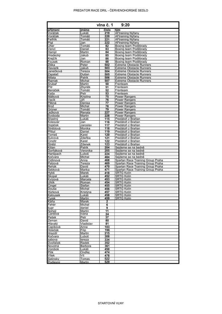 PREDATOR RACE DRIL - ČERVENOHORSKÉ SEDLO vlna č. 1 příjmení Voráček Voráček Feifrlík Pígl Uher Vencl Hampl Hradecký Krejčík Fousek Žiška Haviarik Janečková Zapalač Milata Rajniak Šrubař Pítr Benáček Kaša Málková Vacík Pěkná Brož Grüner Ježková Svoboda Šťastný Koleszár Dojáček Štréblová Přibyl Tomeš Šulcová Cinoltr Štrébl Kilian Dorňáková Hanšpach Kočvara Cidlinová Palýová Řehák Šebková Hybš Skopal Kvízová Uhlík Cingel Douša Hůrková Kalousek Turek Káňa Fehér kupr Nohejl Cardová Pešek Zeman Hlavatý Čapíková Holeček Hrazdil Kočvara sabova Dvořáček Novotná Vorobok Pilik Vítek Satinsky Podlesný jméno Lukáš Tomáš Tomáš Jan Tomáš Daniel Martin Jakub Jan Roman Peter Jakub Tereza Dušan Patrik Michal Martin Zbyněk Tomáš Petr Kristína Jiří Denisa Michal Tomáš Renata Martin Lukáš Jan Jaroslav Monika Daniel Karel Zdeňka Karel Zdenek Patrik Veronika Luboš Michal Anna Tereza David Marika Marek Lukáš Marcela Roman Štefan Michal Kristýna Lukáš Martin Marek Michal daniel Martin Ivana Petr David Vladislav Anna Filip Martin Luboš tereza Radek Barbora Lukáš Ondřej Vít Tomas Martin číslo 219 220 221 222 82 83 84 85 86 88 502 503 504 505 506 507 50 51 52 53 75 76 77 78 79 227 228 115 116 117 118 119 120 121 122 123 204 205 224 484 468 469 470 471 418 452 453 454 455 456 457 458 459 2 6 9 11 24 37 80 81 103 196 215 308 334 352 361 450 474 478 522 529 9:20 tým AFtraining Nýřany AFtraining Nýřany AFtraining Nýřany AFtraining Nýřany Boxing team Poděbrady Boxing team Poděbrady Boxing team Poděbrady Boxing team Poděbrady Boxing team Poděbrady Boxing team Poděbrady Extreme Obstacle Runners Extreme Obstacle Runners Extreme Obstacle Runners Extreme Obstacle Runners Extreme Obstacle Runners Extreme Obstacle Runners Frenteam Frenteam Frenteam Frenteam Power Rangers Power Rangers Power Rangers Power Rangers Power Rangers Power Rangers Power Rangers Predátoři z Braňan Predátoři z Braňan Predátoři z Braňan Predátoři z Braňan Predátoři z Braňan Predátoři z Braňan Predátoři z Braňan Predátoři z Braňan Predátoři z Braňan Sejdeme se na bedně Sejdeme se na bedně Sejdeme se na bedně Sejdeme se na bedně Spartan Race Training Group Praha Spartan Race Training Group Praha Spartan Race Training Group Praha Spartan Race Training Group Praha SRTG Kolín SRTG Kolín SRTG Kolín SRTG Kolín SRTG Kolín SRTG Kolín SRTG Kolín SRTG Kolín SRTG Kolín STARTOVNÍ VLNY PREDATOR RACE DRIL - ČERVENOHORSKÉ SEDLO vlna č. 2 příjmení Piksova Masilkova Smegrova Zach Paraska Krausova Urbanová Urban Kocincová Slováková Joklová Novák Novák Cudrák Zahradníček Beitler Jiřičný Endrychová Svobodová Běhalík Řeháčková Moudr Klozová Hunča Marák Tomasek Růžička Čurda Danko Vlk Šplíchal Korbel Machala Mrňa Topol Samek Oborný Sobek Novák salonová hanzlíčková tokárová landová havlová nagy cieslar květoň Podskalský Novák Brabenec Kubát Dibelka Přikryl Alexova Smutný Dvořáček Dědič Kubín Hejnová Humňal Pšeničková Petr Patrman Dobiáš Hani Kurš Homolová Husa Pavlíček Kučerová Krejcárková Pfeiferová jméno Katerina Pavla Michaela Martin Martin Lenka Martina Zdenek Karolína Alena Veronika Martin Jakub Petr Ondřej František Jakub Alice Lucie Josef Michaela Adam Nikola Pavel Michal Robert Radek Kamil Tomáš Martin Jiří Petr Jan Jakub Martin Jakub Petr Jakub Jan martina markéta pavlína monika kateřina jakub marek martin Patrik Mirek Pavel Jan Martin Tomáš Lucie Ondřej Roman Martin Martin Helena Vladislav Nikola Tomáš Milan Ondřej Andrea Jakub Jaroslava Radek Zdeněk Petra Adéla Kateřina číslo 93 94 95 96 181 182 183 184 530 531 532 89 90 91 92 283 284 285 286 287 288 289 290 60 61 62 63 64 65 66 67 259 337 377 45 46 47 48 49 383 384 385 386 387 388 389 390 391 16 207 217 230 31 32 33 34 35 36 3 7 13 38 39 137 138 139 147 216 218 303 318 319 9:40 tým BERSERKER BERSERKER BERSERKER BERSERKER BERSERKER BERSERKER BERSERKER BERSERKER BERSERKER BERSERKER BERSERKER Divocí Divocí Divocí Divocí GORILLA Fitness GORILLA Fitness GORILLA Fitness GORILLA Fitness GORILLA Fitness GORILLA Fitness GORILLA Fitness GORILLA Fitness Na uteku Na uteku Na uteku Na uteku Na uteku Na uteku Na uteku Na uteku Na uteku Na uteku Na uteku NO PROBLEM NO PROBLEM NO PROBLEM NO PROBLEM NO PROBLEM padaFky padaFky padaFky padaFky padaFky padaFky padaFky padaFky padaFky PERKNOW PERKNOW PERKNOW PERKNOW TF Legion Gym TF Legion Gym TF Legion Gym TF Legion Gym TF Legion Gym TF Legion Gym STARTOVNÍ VLNY PREDATOR RACE DRIL - ČERVENOHORSKÉ SEDLO vlna č. 3 příjmení Kulhánek Růžičková Augustová Tomaščík Pelant Ondráčková Siblík Řezníček Vodičková Kulašiak Nedvídková Drapák Honzík Kobrová Junková Junek Mašláňová Jílková Chaloupková Skopalová Pavílek Gottwaldová Rozkošná Baďurová Žáková Kolínská Švecová Potyka Stolarczyková Marunič Semerádová Janiczek Wilczková Vandžura Justrová Jarolímek Smolík Dvořáková Foubik Zahálková Zahálka Mathauser Vlček Kučera Čubrová Korený Damborský Rusnok Emmer Blinková Pašek Mravik Semanová Šíblova Vacková Kuhn Gebauerová Reinold Halinkovič Pintér Joklíková Otasek Koutník Drnek Ševčík Doušová Zábranská Zuzaňák Kraus Kotyk Míček Kanta Pavlik Nitsche Nitsche jméno Tomáš Vladislava Hana Zdeněk Michal Milada Lukáš David Pavla Tomáš Barbora Imrich Jan Lucie Petra Radoslav Jaroslava Eva Iveta Zdeňka Radim Marie Taťána Lucie Kristýna Lubica Dana Michael Kristýna Jan Gabriela Adam Veronika Libor Ivana Pavel Martin Kristýna Michal Kristýna Patrik Stanislav Štěpán David Eva Jakub Petr Martin Jan Tereza Pavel Michal Veronika Adéla Tereza Sebastian Sylvie Tomáš Štefan Ivan Martina Michal Tomáš Jan František Barbora Ladislava Matyáš Lukáš Zdeněk Tomáš Jakub Vitezslav Patrik Petr číslo 109 110 323 324 261 262 263 
