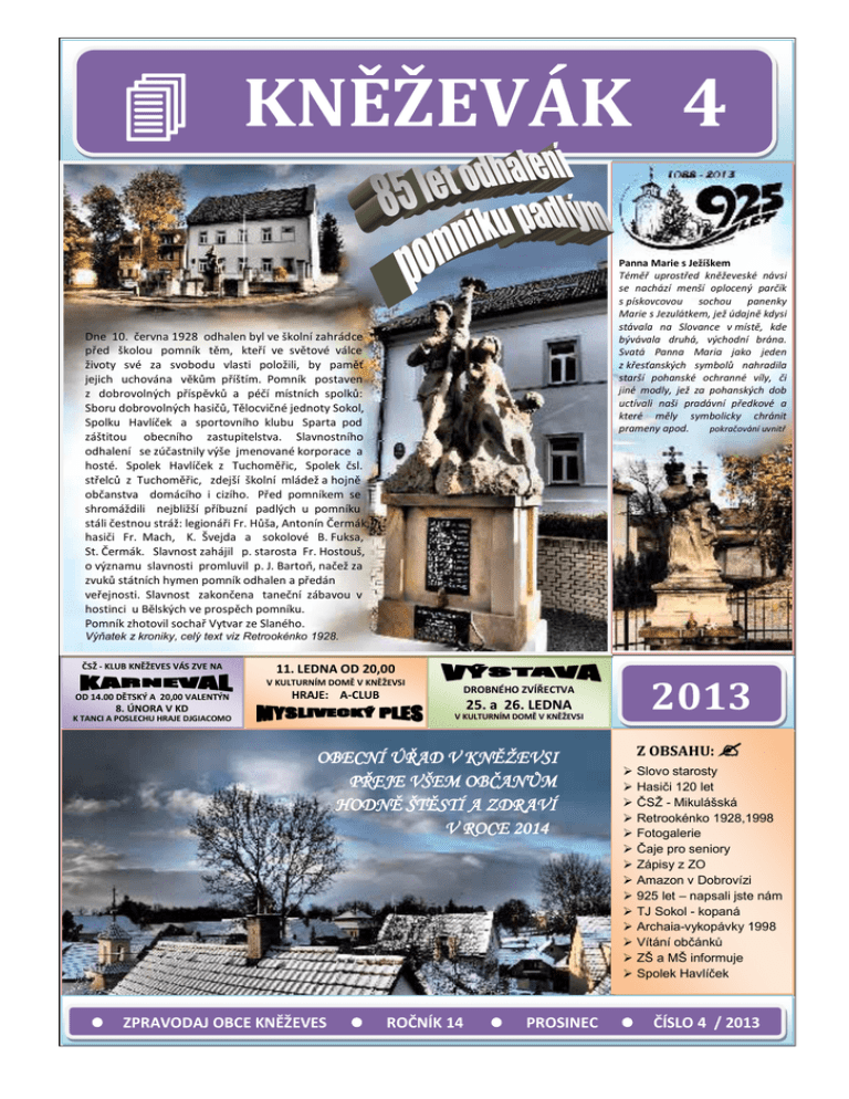 [ZADEJTE NÁZEV SPOLEČNOSTI.] KNĚŽEVÁK 4 Panna Marie s Ježíškem Téměř uprostřed kněževeské návsi se nachází menší oplocený parčík s pískovcovou sochou panenky Marie s Jezulátkem, jež údajně kdysi stávala na Slovance v místě, kde bývávala druhá, východní brána. Svatá Panna Maria jako jeden z křesťanských symbolů nahradila starší pohanské ochranné víly, či jiné modly, jež za pohanských dob uctívali naši pradávní předkové a které měly symbolicky chránit prameny apod. pokračování uvnitř Dne 10. června 1928 odhalen byl ve školní zahrádce před školou pomník těm, kteří ve světové válce životy své za svobodu vlasti položili, by paměť jejich uchována věkům příštím. Pomník postaven z dobrovolných příspěvků a péčí místních spolků: Sboru dobrovolných hasičů, Tělocvičné jednoty Sokol, Spolku Havlíček a sportovního klubu Sparta pod záštitou obecního zastupitelstva. Slavnostního odhalení se zúčastnily výše jmenované korporace a hosté. Spolek Havlíček z Tuchoměřic, Spolek čsl. střelců z Tuchoměřic, zdejší školní mládež a hojně občanstva domácího i cizího. Před pomníkem se shromáždili nejbližší příbuzní padlých u pomníku stáli čestnou stráž: legionáři Fr. Hůša, Antonín Čermák, hasiči Fr. Mach, K. Švejda a sokolové B. Fuksa, St. Čermák. Slavnost zahájil p. starosta Fr. Hostouš, o významu slavnosti promluvil p. J. Bartoň, načež za zvuků státních hymen pomník odhalen a předán veřejnosti. Slavnost zakončena taneční zábavou v hostinci u Bělských ve prospěch pomníku. Pomník zhotovil sochař Vytvar ze Slaného. Výňatek z kroniky, celý text viz Retrookénko 1928. ČSŽ - KLUB KNĚŽEVES VÁS ZVE NA 11. LEDNA OD 20,00 V KULTURNÍM DOMĚ V KNĚŽEVSI OD 14.00 DĚTSKÝ A 20,00 VALENTÝN 8. ÚNORA V KD 25. a 26. LEDNA V KULTURNÍM DOMĚ V KNĚŽEVSI K TANCI A POSLECHU HRAJE DJGIACOMO www.d jgiaco mo.cz 2013 DROBNÉHO ZVÍŘECTVA HRAJE: A-CLUB OBECNÍ ÚŘAD V KNĚŽEVSI PŘEJE VŠEM OBČANŮM HODNĚ ŠTĚSTÍ A ZDRAVÍ V ROCE 2014 ZPRAVODAJ OBCE KNĚŽEVES ROČNÍK 14 PROSINEC Z OBSAHU: Slovo starosty Hasiči 120 let ČSŽ - Mikulášská Retrookénko 1928,1998 Fotogalerie Čaje pro seniory Zápisy z ZO Amazon v Dobrovízi 925 let – napsali jste nám TJ Sokol - kopaná Archaia-vykopávky 1998 Vítání občánků ZŠ a MŠ informuje Spolek Havlíček ČÍSLO 4 / 2013 KNĚŽEVÁK NAPSALI JSTE NÁM / REDAKCE / RŮZNÉ 4/2013 KŮŇ NA SILNICI / V pátek 20.9. cca kolem druhé hodiny ranní se vracím společně s kamarádem Karlem Beinhartem z oslavy z Prahy. Při odbočováni na sjezdu z dálnice na Kněževes vidíme na silnici koně. Chvilku nevěřícně koukáme, jestli je to pravda a když zjišťujeme, že ano vystupujeme z auta a snažíme se ho odlákat mimo silnici. Karel jakožto známý lovec jakékoliv zvěře (chytil anakondu do svých rukou) vyndal tažné lano z kufru svého Ferrari, uvázal kolem krku smyčku a předal mi lano i s koněm. Já jsem vše mezitím nahlásil na policii, kde mi zprvu moc nevěřili, ale nakonec že pošlou hlídku. Koně jsme odvedli pod most dálnice a čekali na policii. Asi po 30 minutách kdy hlídka stále nikde a ostatní řidiči nás častovali nadávkami jsme se rozhodli vzít koně ke kulturnímu domu, kde mu nehrozí žádné nebezpečí. Cestou volám opět na policii, kde jim sděluji, že kůň není u dálnice, ale vedeme ho ke kulturáku v Kněževsi. Netrvalo dlouho a hlídka byla na místě. Po příjezdu si s ním POLICIE nevěděla rady, tak jsme začali obvolávat kde koho, abychom zjistili majitele. Nepodařilo se nám vzbudit pana Ondřeje Botku, který je znám jako místní chovatel všeho zvířectva, ještě že nám zvedl telefon pan Luděk Černý, který ihned zavolal slečně Ance Čefelínové, která, ač bylo 4 hodiny ráno, přišla ke kulturáku a koně skoro jistě identifikovala. Hlídka se slečnou Čefelínovou odjela kamsi najít majitele. Druhý policista čekal se mnou, koněm a Kájou než se vrátí. Čekání trvalo dlouho a Kája musel jet nakrmit svého jaguára, kterého chová doma v Hřebči. Kolem půl šesté ráno konečně dorazila šťastná majitelka, které někdo koně vypustil z ohradníku. Vše dobře dopadlo, nikomu se nic nestalo a my můžeme jít v klidu spát. Je 7hodin ráno… Ondřej Máslo Redakce Kněževáka děkuje všem partnerům, sponzorům a příznivcům z řad spolků, firem a občanů za celoroční přínosnou podporu Kněževáka. STŘÍPKY OD REDAKCE KNĚŽEVÁKA: Redakce Kněževáka informuje čtenáře, že si na internetových stránkách obce - www.knezeves.cz / položka Kněževák - mohou přečíst nejenom již vydaná čísla zpravodaje, ale mohou získat podrobnější informace o některých akcích pořádaných v obci a okolí. Co najdete v příštím čísle Kněževáka – 6.Čaje pro seniory, knihovna - informace o spisovatelích a jejich publikacích v obecní knihovně, 15 let kněževeského volejbalu, novinky ohledně Naučné stezky v Kněževsi … Co nového v roce 2014 pro čtenáře Kněževáka připravuje jeho redakce? Mimo nové rubriky z knihovny dostanou prostor také podnikatelé a bude nová rubrika pod názvem „naši sousedé“ - takže bude co číst V příštím roce redakce připravuje vydání speciálního čísla Kněževáka, jehož obsahem bude shrnutí oslav 925 let. Redakce bude ráda, když zašlete své názory, zážitky či různé náměty spojené s oslavami do redakce Kněževáka nebo necháte v písemné podobě na místním obecním úřadě. Vaše příspěvky budou zveřejněny. Děkujeme. Pí D.M.Jelínková přišla s návrhem, že by se mohl začít vydávat „KNĚŽEVÁČEK“ pro děti a mládež s jejich účastí. Tak co vy na to … ? FOTOKURIOZITA: Láska v zimě … Kateřina Krausová (Kněževes) VANDALISMUS V KNĚŽEVSI / Na za