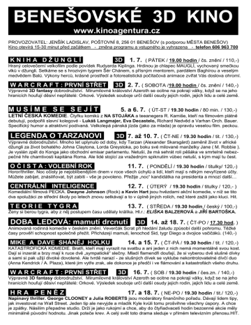 BENEŠOVSKÉ 3D KINO. www.kinoagentura.cz. .. PROVOZOVATEL: JENŠÍK LADISLAV, POŠTOVNÍ 8, 256 01 BENEŠOV (s podporou MĚSTA BENEŠOV) Kino otevírá 15-30 minut před začátkem - změna programu a vstupného je vyhrazena - telefon 606 963 700 KNIHA DŽUNGLÍ 3D 1. 7. ( PÁTEK / 19.00 hodin / čs. znění / 110,-) Hraný celovečerní velkofilm podle povídek Rudyarda Kiplinga. Hrdinou je chlapec MAUGLÍ, vychovaný smečkou vlků v džungli. Setkáme se s hrozivým tygrem Šér Chánem, s přísným mentorem, pardálem Baghírou a veselým medvědem Balú. Výkony herců, krásné prostředí a fotorealistická počítačová animace zvířat Vás doslova ohromí. W A R C R A F T : PRVNÍ STŘET 3D 2. 7. ( SOBOTA /19.00 hodin / čs. znění / 140,-) Výpravné 3D fantasy dobrodružství. Mírumilovné království Azeroth se ocitne na pokraji války, když se na jeho hranicích houfují děsiví nepřátelé: Orkové. Výsledek souboje určí další osudy jejich rodin, jejich lidu a celé země. MUSÍME SE SEJÍT 5. a 6. 7. ( ÚT-ST / 19.30 hodin / 80 min. / 130,-) LETNÍ ČESKÁ KOMEDIE. Čtyřku komiků z NA STOJÁKA a teeanegera R. Kamiše, kteří na filmovém plátně debutují, podpořili slavní kolegové - Lukáš Langmajer, Eva Decastelo, Richard Nedvěd a Varhan Orch. Bauer. Specifický humor a atraktivní podívaná. Velkolepá pánská jízda (jako za mlada) je opravdu veselou film. peckou. LEGENDA O TARZANOVI 3D 7. až 10. 7. ( ČT-NE / 19.30 hodin / tit. / 130,-) Výpravné dobrodružství. Mnoho let uplynulo od doby, kdy Tarzan (Alexander Skarsgård) zaměnil život v africké džungli za život bohatého Johna Claytona, Lorda Greystoka, po boku své milované manželky Jane ( M. Robbie ). Je vyslán zpět do Konga jako obchodní emisar parlamentu. Netuší, že má sehrát roli pěšáka ve smrtelně nebezpečné hře chamtivosti kapitána Roma. Ale lidé stojící za vražedným spiknutím vůbec netuší, s kým mají tu čest. O Č I S T A : VOLEBNÍ ROK 11. 7. ( PONDĚLÍ / 19.30 hodin / titulky/ 120,-) Horor/thriller. Noc očisty je nejoblíbenějším dnem v roce všech úchylů a lidí, kteří mají s někým nevyřízené účty. Můžete zabíjet, znásilňovat, být zabiti - vše je povoleno. Přežije „noc“ kandidátka na presidenta a mnozí další… CENTRÁLNÍ INTELIGENCE 12. 7. ( ÚTERÝ / 19.30 hodin / titulky / 120,- ) Komediální filmová PECKA. Dwayne Johnson (Rock) a Kevin Hart jsou hvězdami akční komedie, v níž se tito dva spolužáci ze střední školy po letech znovu setkávají a to v úplně jiných rolích, než které zažili jako kluci. Hit. TEORIE TYGRA 13. 7. ( STŘEDA / 19.30 hodin / český / 100,-) Ženy si berou tygra, aby z něj postupem času udělaly králíka. Hl.r.: ELIŠKA BALZEROVÁ a JIŘÍ BARTOŠKA. DOBA LEDOVÁ: mamutí drcnutí 3D 14. až 18. 7. ( ČT-PO / 17.30 hod. ) Animovaná rodinná komedie v českém znění. Veverčák Scrat při hledání žaludu způsobí další pohromu. Těžké časy prověří schopnost společně přežít. Přicházejí mamuti, lenochod Sid, tygr Diego a dvojice vačičáků. (140,-) MIKE A DAVE SHÁNĚJ HOLKU 14. a 15. 7. ( ČT-PÁ / 19.30 hodin / tit. / 120,-) KATASTROFICKÁ KOMEDIE. Bratři, kteří mají vyrazit na svatbu a ani jeden z nich nemá momentálně svou kost. Dají si inzerát a brzy mají k ruce dvě „sympatické“ slečny. Mladí flamendři doufají, že si vyberou dvě slušné dívky a sami si pak užijí divoké dovolené. Ale tvrdě narazí - ze slušných dívek se vyklube nekontrolovatelné dívčí duo (Anna Kendrick / A. Plaza), které jim vytře zrak, ale dokonce je předčí i ve flámování a katastrofách všeho druhu. W A R C R A F T : PRVNÍ STŘET 3D 16. 7. ( SOB / 19.30 hodin / čes.zn. / 140,-) Výpravné 3D fantasy dobrodružství. Mírumilovné království Azeroth se ocitne na pokraji války, když se na jeho hranicích houfují děsiví nepřátelé: Orkové. Výsledek souboje určí další osudy jejich rodin, jejich lidu a celé země. HRA PENĚZ 17. a 18. 7. ( NE-PO / 19.30 hodin / tit./ 120,-) Napínavý thriller. George CLOONEY a Julia ROBERTS jsou moderátory finančního pořadu. Dávají lidem tipy, jak investovat na Wall Street. Jeden tip ale nevyjde a mladík Kyle kvůli tomu prošvihne všechny úspory. A chce je zpátky. Násilím přepadne studio. Drží je jako rukojmí a chce, aby do čtyřiadvaceti hodin bezcenné akcie měly minimálně původní hodnotu. Jinak poteče krev. A celý svět toto drama sleduje v přímém televizním přenosu.HIT. DEN NEZÁVISLOSTI: Nový útok 3D 19. a 20. 7. ( ÚT-ST / 19.30 hod./čs.zn./ 140,-) Bylo skoro jisté, že se jednou vrátí. Jsme připraveni na to, co se nyní z hloubi vesmíru blíží k naší Zemi? Souboj lidstva s brutálním, bezcitným mimozemským nepřítelem bude buď vítězný, nebo poslední. Roland EMMERICH. UČITELKA 21. a 22. 7. ( ČT - PÁT / 19.30 hodin / 120,-) Autorská dvojice scenárista Petr Jarchovský a režisér JAN HŘEBEJK. Zdánlivě empatická a laskavě vyhlížející učitelka manipuluje prostřednictvím svých žáků jejich rodiči za účelem osobního obohacení i milostného poměru. Najdou se však tři rodiny, které se rozhodnou učitelce vzepřít. Strhující a aktuální snímek podle skuteč. události. KNIHA DŽUNGLÍ 3D 22. 7. ( PÁTEK / 17.30 hodin / čes.zn. / 110,-) Dobrodružný velkofilm. Hrdinou je chlapec Mauglí, vychovaný v džungli. Hit fotorealistické počítačové animace. Ž E L V Y N I N J A 2. 3D 23. 7. ( SOB / 17.30 hodin / čes. znění/ 120,-) New York už zase potřebuje zachránit. Z městských stok se vynoří čtyři zmutovaní želví kamarádi, aby zastavili Trhače a jeho bandu. Michelangelo, Donatello, Leonardo a Raphael opět vyrážejí za novým dobrodružstvím. Jejich nové příběhy (jako vždy) dokumentuje sexy reportérka April ( MEGAN FOX ). Rodinný, dětský film. HIT. PAŘBA V PATTAYI 