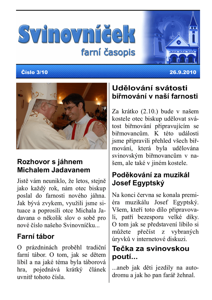 Číslo 3/10 26.9.2010 Udělování svátosti biřmování v naší farnosti Rozhovor s jáhnem Michalem Jadavanem Za krátko (2.10.) bude v našem kostele otec biskup udělovat svátost biřmování připravujícím se biřmovancům. K této události jsme připravili přehled všech biřmování, která byla udělována svinovským biřmovancům v našem, ale také v jiném kostele. Poděkování za muzikál Jistě vám neuniklo, že letos, stejně Josef Egyptský jako každý rok, nám otec biskup poslal do farnosti nového jáhna. Jak bývá zvykem, využili jsme situace a poprosili otce Michala Jadavana o několik slov o sobě pro nové číslo našeho Svinovníčku... Farní tábor O prázdninách proběhl tradiční farní tábor. O tom, jak se dětem líbil a na jaké téma byla táborová hra, pojednává krátký článek uvnitř tohoto čísla. Na konci června se konala premiéra muzikálu Josef Egyptský. Všem, kteří toto dílo připravovali, patří bezesporu velké díky. O tom jak se představení líbilo si můžete přečíst z vybraných úryvků v internetové diskuzi. Tečka za svinovskou poutí... ...aneb jak děti jezdily na autodromu a jak ho pan farář žehnal. Nejen pro ty, kteří v naší farnosti 2. října 2010 přijmou z rukou o. biskupa svátost biřmování Modlitba k Duchu Svatému Zde jsme, Pane, Duchu Svatý, zde jsme i s přetěžkým břemenem svých hříchů, avšak shromážděni výslovně v tvém jméně. Přijď k nám a zůstávej s námi, svou milostí se vlij do našich srdcí! Uč nás, co máme činit a kam dospět, ukaž nám, jak máme působit, abychom dík tvé pomoci se tobě ve všem zalíbili. Ty sám nám vnukni naše rozhodnutí a sám je učiň skutkem, neboť jen tobě s Otcem a Synem náleží všechna velebnost a sláva. Ty, jenž nadevše miluješ poctivost, nedopusť, abychom uvedli ve zmatek tvůj spravedlivý řád. Ať nás nesvede z cesty nevědomost, neovlivní lidská pochvala a přízeň, nepokazí úplatnost či falešné ohledy. Dej, ať nás s tebou pojí jedině tvá milost, abychom byli v tobě svorně zajedno a v ničem se neuchýlili od pravdy. A jako jsme zde shromážděni v tvém jméně, tak ať s veškerou oddaností tvých dětí ve všem setrváme na pravosti víry, aby se naše myšlení zde na tomto místě v ničem nerozcházelo s tebou a ve světě budoucím abychom za dobrou práci došli věčné odměny. Amen. Přeložil Václav Renč. (Podle domněnky složil tuto modlitbu sv. Izidor Sevilský pro druhý provinční koncil v Seville, r.619. Touto modlitbou se zahajovala zasedání I. vatikánského ekumenického koncilu 1869-70 a rovněž při II. vatikánském ekumenickém koncilu se ji účastníci denně modlili.) Rozhovor s jáhnem Michalem Jadavanem Milí farníci, jistě vám neuniklo, že letos, stejně jako každý rok, nám otec biskup poslal do farnosti nového jáhna. Jak bývá zvykem, využili jsme situace a poprosili otce Michala Jadavana o několik slov o sobě pro nové číslo našeho Svinovníčku... Otče Michale, v červenci jste k nám do farnosti přišel jako nový jáhen. Můžete říci farníkům, odkud přesně pocházíte? Narodil jsem se roku 1982 v OstravěPorubě, ale později jsme se přestěhovali s rodiči na Fifejdy, nicméně i potom jsem zůstal farníkem v kostele sv. Mikuláše v Ostravě Porubě. Řeknete nám něco o vaší rodině? Vzpomínám si, že tohle je jedna z typických otázek u maturity z cizího jazyka a taky si vzpomínám, že tuto otázku si každý přál vytáhnout, protože není nic jednoduššího, než 15 minut mluvit o svých nejbližších. Jenomže já jsem se této otázce vždycky snažil vyhnout, nemám totiž žádné sourozence a navíc všichni mí prarodiče již zemřeli, takže témat ke konverzaci o mé rodině příliš není. Snad jen, že tatínek pracuje ve Vítkovicích a maminka v pekárně. Jak jste se stal jáhnem? Otec biskup mě vysvětil :-) Ne, vážně: Nebyl jsem vychovaný ve věřící rodině a s křesťanstvím jsem se setkal až na Biskupském gymnáziu v 17 letech. Tehdy mě, jako ostatně každého konvertitu, myšlenka na kněžství napadla, ale nikterak silně jsem se jí nezabýval. Vždycky jsem chtěl být učitel matematiky a fyziky, i proto jsem po maturitě studoval tři roky na Ostravské univerzitě právě učitelství těchto dvou předmětů, ale v průběhu studia jsem pochopil, že cosi v mém životě není v pořádku; pořád jsem se ptal kde je problém… a pak to Bůh vyřešil za mě, dal mi poznat, kde by mělo být moje místo a já jsem mu na to kývnul. Jak to probíhalo v semináři? Mnozí kněží mi říkali, že seminární léta byla nejlepší částí jejich života. Já osobně si myslím, že mě ta nejlepší léta ještě čekají. Seminární formace trvala šest let, během nichž jsme se připravovali na kněžský život ve farnostech. Dny byly naplněny modlitbou, studiem a tím vším, co patří k normálnímu životu mladého člověka. Kdo Vás v životě nejvíc ovlivnil? Vážím si velké spousty lidí, ale přesto v mém životě hrají důležitou úlohu tři lidé. Každý z nich je úplně jiný a každý z nich mě osobitě a specificky - podle svých darů - přivedl blíž k Bohu. Jaký byl Váš první kontakt se svinovskou farností? Možná se budete divit, ale ještě coby porubský farník jsem zde, ve svinovské farnosti, podstoupil přípravu k prvnímu svatému přijímání a v postní době roku 2001 jsem zde i své první svaté přijímání oslavil. Důvod je velmi prostý: Jak jsem říkal, s křesťanstvím jsem se setkal poprvé na Biskupském gymnáziu. Když jsem pochopil, že dozrál čas, poprosil jsem otce Jana, který již tehdy byl na škole spirituálem, jestli by mě připravil k prvnímu svatému přijímání. Otec Jan mě začlenil do již existující skupiny mladých lidí, kteří se scházeli na svinovské fa