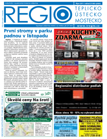 Příští číslo vyjde 7. listopadu měsíčník / soukromá inzerce zdarma Říjen 2011 / náklad 25 000 výtisků Vychází zdarma měsíc co měsíc již 21 let! w w w. ire g io. c z VÝKUP a ZPRACOVÁNÍ kovového odpadu KUPON na 10 ks fotografií 10x15 cm ZDARMA k zakázce podané v prodejně FOTOSTYL a min. počtu 50 ks. Kupon platí od 1. 9. do 31. 10. 2011. K jedné zakázce lze uplatnit 1 kupon. Regionální distributor podlah T1061067 Skvělé ceny Na šrot! Akce: sleva 10 - 15% na vybrané zboží Výkupna Teplice, Riegrova 1507, Teplice - Trnovany (vjezd z Nákladní ulice, společný s čerpací stanicí ONO) T106016 ONO Otevřeno: Po-Pá 7.00 -16.00 hodin, každou sobotu 7.00 -12.00, neděle po tel. dohodě. Kontakt: 731 633 194 Web: www.metallplast.cz Další pobočky: Ústí nad Labem, Krupka, Most, Česká Lípa T103014 OBCHODNÍ ZASTOUPENÍ: 775 646 266 - 775 646 267 Po úpravě zeleně, která bude trvat rovné dva roky, přijdou na řadu cesty. V současné době jsou cestičky v parku spíše chaotické a vedou odnikud nikam. Dříve směřovaly ke vchodu prvního divadla v novorenesančním stylu, které ale v roce 1919 vyhořelo a přestavělo se ve stylu secese a moderny. Magistrát nyní ze všeho nejdřív opraví Kolostujovu kašnu, která je jedním ze symbolů parku. Zloději opakovaně ukradli čerpadlo. Poslední krádež se stala na začátku května, nyní se zloděj dostal znovu k čerpadlu a před 14 dny ho odcizil. "To to dopadne, bude to hnus," rozčiluje se nad informací o kácení stromů 65letý důchodce Emil Vrba z Teplic. "Jenom tady bude nepořádek a park bude ošklivý," dodává rozhořčený Emil Vrba. Naopak 26letá Jana z Bystřan je potěšena tím, že se park změní. "Určitě to bude lepší a proč se nevracet k tradicím. Samozřejmě nemohu si pamatovat, jak to tady kdysi vypadalo, ale pevně věřím, že až vše dodělají, bude to krásné," dodává. (red) T106038 Teplice - V Teplicích se budou kácet stromy v lázeňském parku pod divadlem. "Je to nejstarší park na území Teplic a my chceme zachovat jeho historickou a sadovou podobu. Mladší dřeviny nerespektují historickou kompozici," říká k plánovaným úpravám vedoucí odboru životního prostředí a dopravy teplické radnice Ivana Müllerová. Lázeňský park pod divadlem v Teplicích tak dostane původní podobu z 19. století. Znamená to mimo jiné pokácet 59 stromů, hlavně lípy, cypřiše a borovice, které v parku původně nerostly. Úředníci vycházejí z historických pohlednic a fotografií. Kácet se začne v listopadu. Vykácí se dřeviny, které mají minimální sadovou a historickou hodnotu. Sázet se budou stromy vysoké už tři až čtyři metry. Místo pokácených stromů město vysadí 99 nových, převážně javory, jírovce, platany a po obvodu parku trnovník bílý. Studii vypracoval architekt, který vycházel z dobových materiálů z let 1907 až 1910. Vše bylo odsouhlaseno i památkáři. T106037 První stromy v parku padnou v listopadu ÚVODNÍK POTŘEBY PRO DOMÁCNOST, NÁBYTEK Vážení čtenáři a obchodní partneři, letošní 21. ročník našeho měsíčníku pokračuje říjnovým vydáním, které je po necelém půlroce opět rozšířené, čtyřicetistránkové. Připravili jsme si proto pro vás více zajímavých informací, a to nejen z našeho regionu. Ale i třeba z oblasti školství a bydlení - tomu jsme věnovali hned čtyři stránky, kde vedle prezentací podniků z oboru naleznete i nejrůznější zajímavosti. Tématické stránky věnované bydlení budou pokračovat i v listopadovém čísle, které bude stejně jako to říjnové rozšířené na 40 stránek. Příležitost představit se vám, čtenářům, tak dostanou další firmy z regionu, pro které jsme díky vyšší kapacitě novin připravili zajímavé podmínky prezentace. Ty mohou využít nejen firmy z oblasti bydlení. Plošná prezentace či článek v tisku je tradiční, osvědčená forma marketingové komunikace vhodná pro široké spektrum podniků či firem. A je tu ještě jedna věc. Ať se nám to líbí nebo ne, doba předvánočních nákupů se rychle blíží. Někteří z vás již možná i s nákupy dárků pro své blízké začali. Budeme se proto snažit, abyste ve zbývajících dvou vydáních našeho měsíčníku v tomto roce našli dostatek inspirace nejenom pro ně. Přeji vám všem krásný, barevný podzim a příjemné počtení. Jiří Richter, šéfredaktor [email protected] Z obsahu tohoto vydání měsíčníku Vše pro vaše bydlení ....................................................................................... str. 8-11 Lázeňský park pod divadlem ............................................................................ str. 16 Oslavy 110 let MHD na Mostecku ..................................................................... str. 23 Drážďanský Matheland je nyní také česky ....................................................... str. 24 Předměstské Předlice ......................................................................................... str. 26 Tip na výlet do Radejčína a do Dubic ............................................................... str. 27 FIREMNÍ INZERCE • grafické zpracování v ceně inzerce • výrazné slevy pro stálé zákazníky (opakovací slevy) • poradíme a navrhneme nejvhodnější formu prezentace vašeho podniku • nabízíme dlouholeté zkušenosti a tradiční měsíčník s nákladem 25 000 výtisků! Volejte: 775 646 267, 775 646 266, 417 534 206 SOUKROMÁ ŘÁDKOVÁ INZERCE N Tel.: 417 534 206 N SMS: 777 959 061 N Web: www.iregio.cz N E-mail: [email protected] N Fax: 417 534 209 SBĚRNÁ MÍSTA BEZPLATNÉ INZERCE: TEPLICE - REDAKCE, U Císařských lázní 7, Teplice - Prodejna knih RBP - Masarykova 180, Trnovany ÚSTÍ N. L. - ZOO centrum - Vaníčkova 31 - Trafika - Pivovarská 4 (pod vanou) REGIO - Kupón k