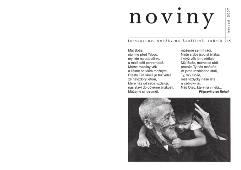 2007 fa r n o s t i s v. A n e ž k y n a S p o ř i l ově, r o č n í k IX Můj Bože, stojíme před Tebou, my lidé na odpočinku a malé děti pohromadě. Máme rozdílný věk a lišíme se vším možným. Přesto Tvá láska je tek velká, že navzdory létům, které nás od sebe vzdalují, nás staví do důvěrné blízkosti. Můžeme si rozumět, listopad noviny můžeme se mít rádi. Naše srdce jsou si blízká, i když věk je rozděluje. Můj Bože, máme se rádi, protože Ty nás máš rád. Ať jsme rozdílného stáří, Ty, můj Bože, máš vždycky naše léta a vždycky jsi: Náš Otec, který jsi v nebi... Připravil otec Řehoř 2. strana farní noviny – listopad 2007 farní noviny – listopad 2007 strana 3 P O Z VÁ N K A D O S K A U T S K É H O O D D Í L U K O ŤATA Čas není nic, využití času je všechno. Krásný život může Stále zveme děti od 8 do 12 let, aby se zapojily do naší činnosti. Scházíme se každé úterý v klubovně pod kostelem od 16:30 do 18:00. Do Vánoc chceme na výpravách vyrazit například do Svatého Jana pod Skalou a na Prknovku, do kina, divadla a na plavání. Kontakt na vedoucí: Markéta Štromerová 723 187 727, [email protected] začít třeba v padesáti nebo šedesáti letech. Může se rozjasnit v poslední hodině. Může vydat plody v několika minutách. Ani věk, ani nemoc, ani osamělost, ani oběť lidské lásky nejsou překážkou k vykonání Díla. Z E S K AU T S K É K RO N I K Y – TÁ B O R 1 6 . – 2 7 . 7 . 2 0 0 7 2 0 0 7 – I I . d í l Asi nerozumíte: Bůh vás tomu naučí. Máte-li dobrou vůli, Dvě družiny pod vedením Mikeše a Králíka se na jedenáct dní staly římskými legiemi, aby dobyly Římu co největší území. Legii, která získá více území, konsul pověří správou země a bohatě se jí odmění. Dobývání spočívalo například ve zdolání stezek zdatnosti, vaření lektvaru síly, prokázání znalosti přírody, ale i zdravovědy, udržování ohně přes noc apod. Mimo etapové hry, které jsme měli opravdu odděleně, jsme čas věnovali hrám společným s druhým oddílem. Kluci nás naučili „tek“, jehož pravidla jsou podobná pravidlům softballu, společně jsme také jedno odpoledne dováděli na lanech. Rozdělili jsme se všichni na dvě skupinky, které si vzájemně připravovaly stopovačku. Tak jsme se například dostali na nedalekou Červenou Lhotu. Oba dva oddíly, ovšem nezávisle na sobě, se také podívaly do Jindřichova Hradce. Všechny děti hrály hru s názvem Ranní lov, při níž se jednotlivci snaží „ulovit“ co nejvíce lístečků rozházených po louce (hraje se v rozličných obměnách většinou po celou dobu tábora). Večer jsme se často scházeli v týpku vedoucích Polní táborová mše svatá kolem ohně, jednou dokonce úplně všichni k opékání buřtů. Nezapomínali jsme ani na to, že naší podstatou je žít především skautský život, což jsme se snažili naplňovat nejen učením se novým skautským dovednostem, ale také postoji, chováním a také účastí na mších sv., jež jsme prožili celkem tři, z toho dvě přímo na naší louce. Z jídelny se stal jako mávnutím kouzelného proutku chrám, z jídelního stolu vedoucích oltář a snad došlo k podobným proměnám působením Božího ducha i v našich srdcích. Bára a Klárka při slavnostním táborovém ohni slíbily, že se budou snažit nadále žít podle zákona světlušek, Králík se rozhodl žít podle zákona skautů, Filipovi se konečně podařilo splnit všechny tři podmínky skautské odborky zvané Tři orlí pera. A tak jsme prožili krásný tábor a navázali nová přátelství. Bohu díky. Markéta Štromerová vyhledá vás, i kdybyste byli v srdci pouště. Ale co štěstí? řeknete. Štěstí vám bude přidáno. Pravděpodobně to nebude to, o kterém jste snili. Nebude podle vaší chuti, ale možná, že nebudete litovat svých činů. Důležité je přiložit sekeru. Často myslíme, že ta námaha je nad naše síly. Ale ve skutečnosti je to práce, která nás drží. Marguerite-Marie Teilhard de Chardin Připravil otec Řehořř Snímek Dagmar Hochová farní noviny – listopad 2007 B lanka Ješutová je řeholnicí Komunity Chemin Neuf. Do kostela svaté Anežky přichází vždy, když některou neděli navštíví své rodiče, žijící na sídlišti pod hotelem Košík. Z jejího vyprávění se dozvíme nejen o její pouti za hledáním poslání člověka, ale seznámíme se blíže s Komunitou Chemin Neuf (Nová cesta). Jak jsi jako věřící dívka prožívala konec totality? Rodiče mi předali víru jako samozřejmou součást života. Chodívali jsme pěšky do sousední vesnice. Svou víru jsem skrývala, bála jsem se potkat spolužáky. Žádné stejně staré věřící jsem neznala. Kdy jsi poznala nějaké společenství? Asi v patnácti jsem se náhodou dostala do spolča v Říčanech, kam jsem chodila na gymnázium. Připadala jsem si mezi těmi osmnáctiletými strašně malá a nezkušená. Po přestěhování vše začalo znovu. Nikoho jsem neznala, cítila jsem se vykořeněná a osamělá. Zcela zásadní pro mou cestu víry byl seminář Obnovy v Duchu svatém, kde jsem objevila sílu osobní modlitby. Již to nebyla přejatá víra rodičů, ale můj osobní konkrétní vztah s Bohem. V roce 1993 jsi odcestovala do Francie. P. Slavík dostal pozvání od Komunity Chemin Neuf na Festival mládeže Kdy se ti to podařilo? Celý rok jsem šetřila a učila se francouzštinu. Neměla jsem rozmyšleno, zda v Komunitě zůstat, a ani jsem se vlastně neodvažovala si to představovat. I z druhé cesty do Francie jsem se zase vrátila. Definitivně jsem odjela v červnu 1997. Původně na dva měsíce – a teď je to už víc než deset let, co jsem spjata s Komunitou. farní noviny – listopad 2007 Jaké je poslání komunity? Chemin Neuf je římskok