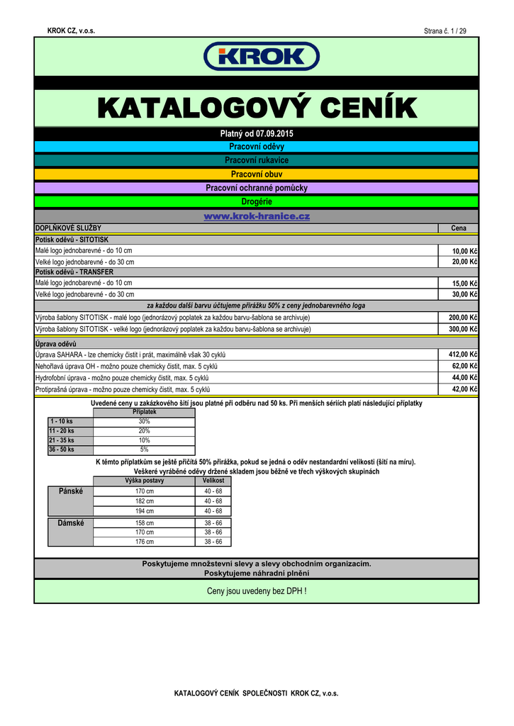 KROK CZ, v.o.s. Strana č. 1 / 29 KATALOGOVÝ CENÍK Platný od 07.09.2015 Pracovní oděvy Pracovní rukavice Pracovní obuv Pracovní ochranné pomůcky Drogérie www.krok-hranice.cz DOPLŇKOVÉ SLUŽBY Cena Potisk oděvů - SITOTISK Malé logo jednobarevné - do 10 cm 10,00 Kč 20,00 Kč Velké logo jednobarevné - do 30 cm Potisk oděvů - TRANSFER Malé logo jednobarevné - do 10 cm 15,00 Kč 30,00 Kč Velké logo jednobarevné - do 30 cm za každou další barvu účtujeme přirážku 50% z ceny jednobarevného loga Výroba šablony SITOTISK - malé logo (jednorázový poplatek za každou barvu-šablona se archivuje) 200,00 Kč Výroba šablony SITOTISK - velké logo (jednorázový poplatek za každou barvu-šablona se archivuje) 300,00 Kč Úprava oděvů Úprava SAHARA - lze chemicky čistit i prát, maximálně však 30 cyklů 412,00 Kč Nehořlavá úprava OH - možno pouze chemicky čistit, max. 5 cyklů 62,00 Kč Hydrofobní úprava - možno pouze chemicky čistit, max. 5 cyklů 44,00 Kč Protiprašná úprava - možno pouze chemicky čistit, max. 5 cyklů 42,00 Kč Uvedené ceny u zakázkového šití jsou platné při odběru nad 50 ks. Při menších sériích platí následující příplatky 1 - 10 ks 11 - 20 ks 21 - 35 ks 36 - 50 ks Příplatek 30% 20% 10% 5% K těmto příplatkům se ještě přičítá 50% přirážka, pokud se jedná o oděv nestandardní velikosti (šití na míru). Veškeré vyráběné oděvy držené skladem jsou běžně ve třech výškových skupinách Výška postavy Velikost Pánské 170 cm 182 cm 194 cm 40 - 68 40 - 68 40 - 68 Dámské 158 cm 170 cm 176 cm 38 - 66 38 - 66 38 - 66 Poskytujeme množstevní slevy a slevy obchodním organizacím. Poskytujeme náhradní plnění Ceny jsou uvedeny bez DPH ! KATALOGOVÝ CENÍK SPOLEČNOSTI KROK CZ, v.o.s. KROK CZ, v.o.s. Strana č. 2 / 29 ODĚVY Str. 7 7 7 7 7 8 8 8 8 9 9 9 9 9 10 10 10 10 11 11 11 11 11 12 12 12 12 12 13 13 13 13 13 13 13 13 13 13 13 14 14 14 14 14 14 15 15 15 15 15 15 15 15 16 16 16 16 16 16 16 16 16 17 Objed. kód 061917xxx 061229xxx 061231xxx 0740333xx 0747143xx 061210xxx 061266xxx 061272xxx 071112xxx 061130xxx 061378xxx 061494xxx 064337xxx 051153xxx 0717493xx 071736xxx 0717583xx 061246xxx 0711992xx 0711991xx 0719104xx 0741933xx 0741533xx 064760xxx 064743xxx 064753xxx 064760xxx 064753xxx 071164xxx 072112xxx 072164xxx 072132xxx 071122xxx 071142xxx 072122xxx 072142xxx 061665xxx 061121xxx 061111xxx 0712423xx 0714453xx 0712433xx 071001042 0712443xx 0712403xx 0712413xx 0712633xx 0712603xx 0712623xx 0712613xx 0721493xx 0721483xx 0721503xx 0712763xx 0711073xx 0712743xx 0718003xx 0742473xx 0712773xx 0717993xx 0712713xx 0740093xx 0740373xx Obchodní Název Info výrobce OPO KABÁT OPO OPO IGLOO II KOMODO MOFOS FAKÍR OBLEK PAS SAHARA ANTISTAT SAHARA OBLEK ESD KOMBINÉZA CR ESD PLÁŠŤ UNI ESD PLÁŠŤ ALFA KOMBINÉZA B 012 HERBERT EDGAR ESD MIKINA ALFA ESD KALHOTY UKARI BUNDA UKARI KALHOTY MSPAN EPICEA III ERABLE III REX BUNDA PÁN. REX KALHOTY LACL PÁN. REX KALHOTY PAS PÁN. REX BUNDA DÁM. REX KALHOTY PAS DÁM. LARA BLŮZA PÁN LARA OBLEK PAS DÁM LARA BLŮZA DÁM LARA KALHOTY PAS DÁM LARA OBLEK LACL PÁN LARA KALHOTY LACL PÁN LARA OBLEK LACL DÁM LARA KALHOTY LACL DÁM LARA KALHOTY KRÁTKÉ TELECOM MOBIKO DESMAN BUNDA DESMAN KALHOTY LACL DESMAN KALHOTY PAS DESMAN ČEPICE DESMAN KALHOTY PAS DESMAN KOMBINÉZA DESMAN VESTA DESMAN TRIČKO DESMAN KALHOTY KRÁTKÉ DESMAN BUNDA DESMAN KALHOTY LACL DESMAN KALHOTY PAS DÁM DESMAN KALHOTY LACl DÁM DESMAN BUNDA DÁM EMERTON TRIČKO EMERTON KALHOTY 3/4 EMERTON KALHOTY LACL EMERTON VESTA EMERTON KALHOTY LACL EMERTON BUNDA EMERTON KOMBINÉZA EMERTON KALHOTY PAS EMERTON BUNDA LONG DMCOM 2v1 3v1 Popis Doplň.info Kabát kyselinovzdorný - zimní Kyselinovzdorná blůza Kyselinovzdorné kalhoty do pasu (100% polypropylen) Kombinéza Antistatická, kyselinovzdorná, žáruvzdorná,nepromokavá bunda Svářečský oblek Nehořlavý antistatický oblek Nehořlavý antistatický oblek Sahara-Antistat Oblek pas Sahara s nehořlavou úpravou Kombinéza do čistého prostředí, antistatická ESD plášť na zip ESD plášť UNI Kombinéza do čistého prostředí, antistatická ESD Obuv do čistého prostředí, antistatická ESD tričko ESD polokošile ESD mikina ESD kalhoty Bunda Kalhoty Kalhoty Bunda protipořezová Kalhoty protipořezové Pánská blůza Dámský oblek pas Dámská blůza Dámské kalhoty montérkové do pasu (230g/m2) zimní zimní Cena od. modrý modrá modré Pánský oblek montérkový dvoudílný - lacl (230g/m ) Pánské kalhoty montérkové s náprsenkou (230g/m2) Dámský oblek montérkový dvoudílný - lacl (230g/m2) Dámské kalhoty montérkové s náprsenkou (230g/m2) modrý Oblek montérkový pánský - kalhoty s náprsenkou Oblek montérkový pánský - kalhoty s náprsenkou Pánská bunda Pánské kahoty s laclem Pánské kalhoty pas 2 v 1 petrol+žlutá Pánské kahoty do pasu Pánský overal (kombinéza) Pánská vesta Triko s krátkým rukávem Pánské kalhoty krátké Pánská bunda zateplená flanelem Pánské kalhoty s laclem zateplené flanelem Dámské kalhoty do pasu Dámské kalhoty s laclem Dámská bunda Bunda Kalhoty pasové Kalhoty lacl Vesta zimní zimní vel. 34 až 46 modrá 2 2v1 modrá+žlutá Bunda Kombinéza Kalhoty pasové Bunda Kombinéza KATALOGOVÝ CENÍK SPOLEČNOSTI KROK CZ, v.o.s. modré modrý modré modrá+bílá Prodejní cena 1 614,00 Kč 680,00 Kč 610,00 Kč 3 947,00 Kč 3 983,00 Kč 690,00 Kč 3 675,00 Kč 1 804,00 Kč 687,00 Kč 1 310,00 Kč 726,00 Kč 472,00 Kč 1 046,00 Kč 700,00 Kč 259,00 Kč 347,00 Kč 491,00 Kč 445,00 Kč 934,65 Kč 677,11 Kč 925,00 Kč 3 721,00 Kč 3 118,00 Kč 259,00 Kč 260,00 Kč 215,00 Kč 259,00 Kč 215,00 Kč 165,00 Kč 299,00 Kč 165,00 Kč 156,00 Kč 390,00 Kč 247,00 Kč 390,00 Kč 247,00 Kč 845,00 Kč 751,00 Kč 487,58 Kč 594,44 Kč 526,25 Kč 43,09 Kč 466,64 Kč 934,65 Kč 419,39 Kč 117,47 Kč 359,25 Kč 398,63 Kč 549,32 Kč 450,00 Kč 