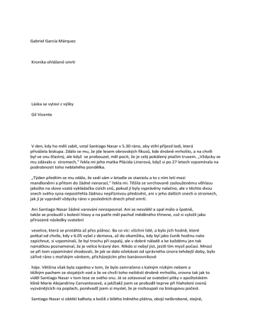 Gabriel García Márquez Kronika ohlášené smrti Láska se vyloví z výšky Gil Vicente V den, kdy ho měli zabít, vstal Santiago Nasar v 5.30 ráno, aby stihl příjezd lodi, která přivážela biskupa. Zdálo se mu, že jde lesem obrovských fíkusů, kde drobně mrholilo, a na chvíli byl ve snu šťastný, ale když se probouzel, měl pocit, že je celý pokálený ptačím trusem. „Vždycky se mu zdávalo o stromech,“ řekla mi jeho matka Plácida Linerová, když si po 27 letech vzpomínala na podrobnosti toho neblahého pondělka. „Týden předtím se mu zdálo, že sedí sám v letadle ze staniolu a to s ním letí mezi mandloněmi a přitom do žádné nenarazí,“ řekla mi. Těšila se svrchovaně zaslouženému věhlasu jakožto na slovo vzatá vykládačka cizích snů, pokud jí byly vyprávěny nalačno, ale v těchto dvou snech svého syna nepostřehla žádnou nepříznivou předzvěst, ani v jeho dalších snech o stromech, jak jí je vyprávěl vždycky ráno v posledních dnech před smrtí. Ani Santiago Nasar žádné varování nerozpoznal. Ani se nesvlékl a spal málo a špatně, takže se probudil s bolestí hlavy a na patře měl pachuť měděného třmene, což si vyložil jako přirozené následky svatební veselice, která se protáhla až přes půlnoc. Ba co víc: všichni lidé, a bylo jich hodně, které potkal od chvíle, kdy v 6.05 vyšel z domova, až do okamžiku, kdy byl jako čuník hodinu nato zapíchnut, si vzpomínali, že byl trochu při ospalý, ale v dobré náladě a ke každému jen tak namátkou poznamenal, že je velice krásný den. Nikdo si nebyl jist, jestli tím myslí počasí. Mnozí se při tom vzpomínání shodovali, že jak se dalo očekávat od správného února tehdejší doby, bylo zářivé ráno s mořským vánkem, přicházejícím přes banánovníkové háje. Většina však byla zajedno v tom, že bylo zamračeno s kalným nízkým nebem a těžkým pachem ze stojatých vod a že ve chvíli toho neštěstí drobně mrholilo, zrovna tak jak to viděl Santiago Nasar v tom lese ze svého snu. Já se zotavoval ze svatební pitky v apoštolském klíně Marie Alejandriny Cervantesové, a jakžtakž jsem se probudil teprve při hlaholení zvonů vyzvánějících na poplach, poněvadž jsem si myslel, že je rozhoupali na biskupovu počest. Santiago Nasar si oblékl kalhoty a košili z bílého lněného plátna, obojí neškrobené, stejné, jaké měl na sobě den předtím o svatbě. Bylo to sváteční oblečení. Nebýt toho biskupova příjezdu, byl by si vzal khaki a vysoké boty, v nichž jezdil každé pondělí na Boží Tvář, dobytkářskou farmu, kterou zdědil po otci a velice uváženě spravoval, i když bez valného zdaru. Venku nosíval za pasem pistoli 357 Magnum, jejíž plášťové kulky, jak říkal, dokázaly přeříznout koně vejpůl. V době koroptví nosil také své sokolnické potřeby. Ve skříni měl mimoto pušku 30,06 Mannlicher Schönauer, pušku 300 Holand Magnum, dvaadvacítku Hornet s dvojnásobným optickým zaměřovačem a opakovači vinčestrovku. Vždycky spával, stejně jako jeho otec, se zbraní ukrytou pod povlakem polštáře, ale než toho dne vyšel z domu, vyndal z ní náboje a uložil ji do zásuvky nočního stolku. „Nikdy ji nenechával nabitou,“ řekla mi jeho matka. Věděl jsem to, a věděl jsem navíc, že zbraně ukládá na jedno místo a střelivo na jiné, velice odlehlé, aby nikdo ani náhodou nepodlehl pokušení nabít je uvnitř domu. Byl to rozumný návyk, který zavedl jeho otec jednou ráno, kdy služebná zatřepala polštářem, aby z něho stáhla povlak, a pistole při dopadu na zem vystřelila a kulka odštípla skříň v místnosti, prorazila zeď salónu, s válečným svistem prolétla jídelnou sousedního domu a obrátila v sádrový prach světce, který stál v životní velikosti na hlavním oltáři kostela na druhém konci náměstí. Santiago Nasar, který byl tehdy malé dítě, na poučení z tohoto maléru nikdy nezapomněl. Poslední podoba, kterou si po něm matka uchovala, byla z jeho letmého zastavení v její ložnici. Probudil ji, když se v koupelně po hmatu pokoušel najít v lékárničce aspirin, a ona rozsvítila a spatřila ho ve dveřích se sklenicí vody v ruce, a tak si ho bude pamatovat navždycky. Potom jí Santiago Nasar vyprávěl svůj sen, ale ona v něm vůbec nevěnovala pozornost těm stromům. „Všechny sny, kde jsou ptáci, znamenají dobré zdraví,“ řekla. Viděla ho z téže sítě na spaní a z téže polohy, v jaké jsem ji zastihl vysílenou posledními světlými okamžiky stáří, když jsem se vrátil do tohoto zapomenutého městečka se snahou znovu sestavit z tolika rozptýlených střepů rozbité zrcadlo paměti. Stěží rozeznávala tvary v plném světle a na spáncích měla hojivé listy proti věčnému bolení hlavy, které jí zanechal syn, když naposledy prošel jejím pokojem. Ležela na boku a chytala se skleněných kuliček v pletivu nad hlavou, jak se pokoušela napřímit, a v tom šeru to tam bylo cítit jako v křticí kapli, což mě tehdy ráno v den zločinu překvapilo. Jakmile jsem se objevil v rámu dveří, spojila si mě se vzpomínkou na Santiaga Nasara. „Tam stál,“ řekla mi. „Byl v kalhotách a košili z bílého lněného plátna, praného jenom ve vodě, protože měl tak jemnou kůži, že tření škrobu nesnášel.“ Hezkou chvíli seděla v síti a žvýkala semínka řeřišnice, dokud ji nepřešla iluze, že se syn vrátil. Potom vzdychla: „Žila jsem jenom pro něj.“ Viděl jsem ho v její paměti. Poslední týden v lednu dovršil 21 let a byl štíhlý a bledý a po otci měl arabská víčka a kadeřavé vlasy. Byl jediným dítětem konvenčního manželství, které nezažilo ani okamžik štěstí, ale on se svým otcem šťastný vypadal, dokud ten před třemi roky najednou nezemřel, a zdál se šťastný 